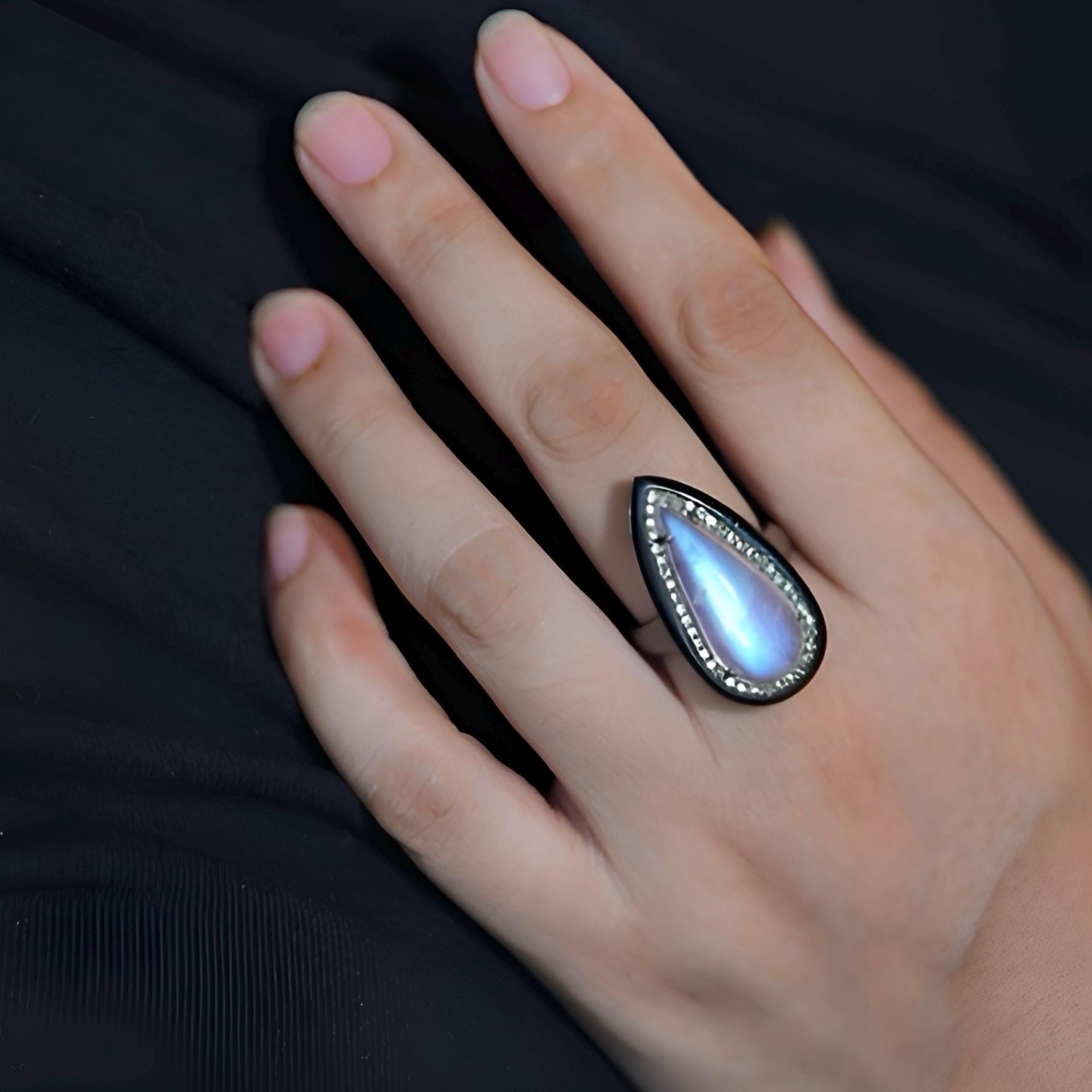 • An enchanting teardrop-shaped moonstone framed by a delicate halo of pavé natural diamonds and art deco style black onyx, set in pure sterling silver. Its luminous blue sheen captivates like moonlight on water.