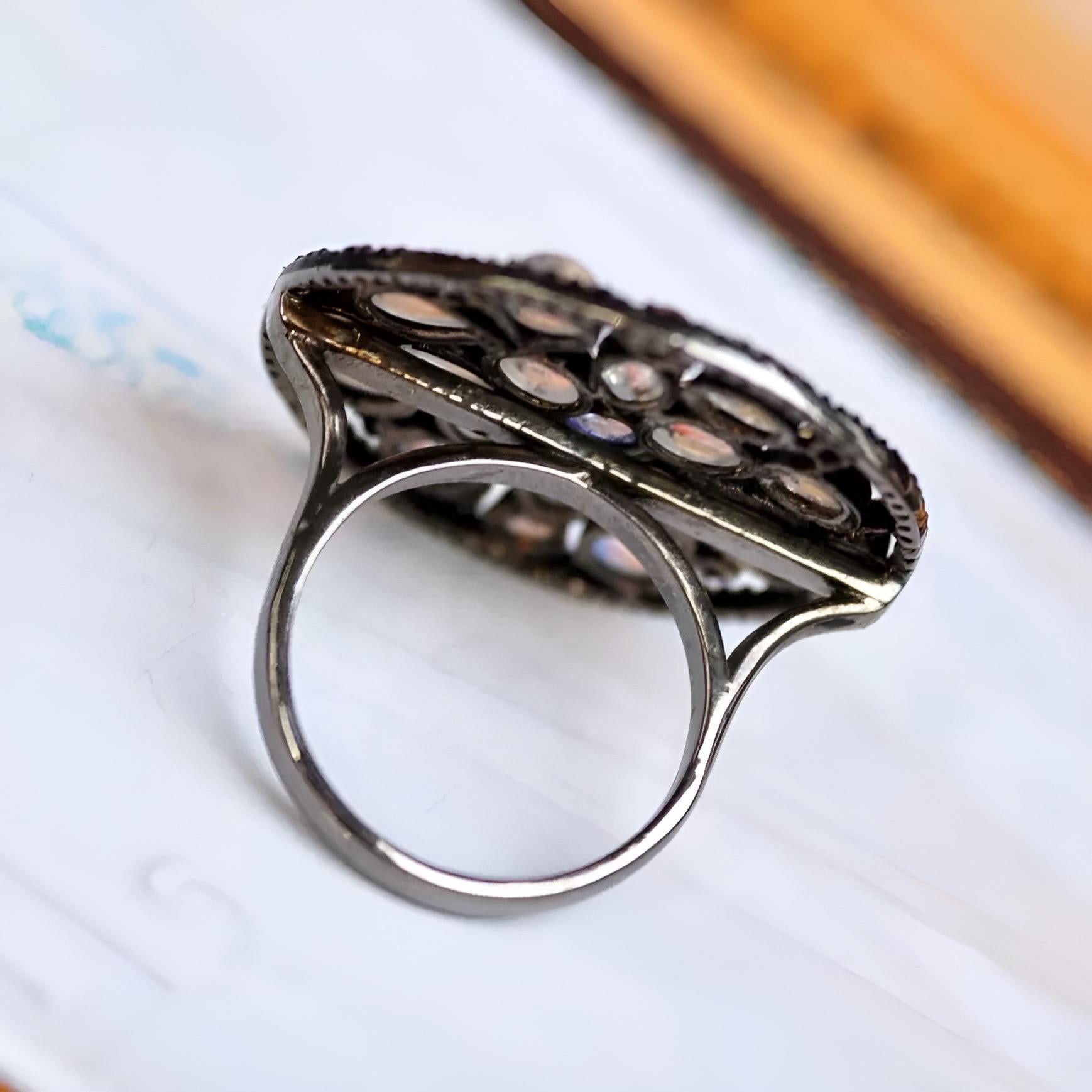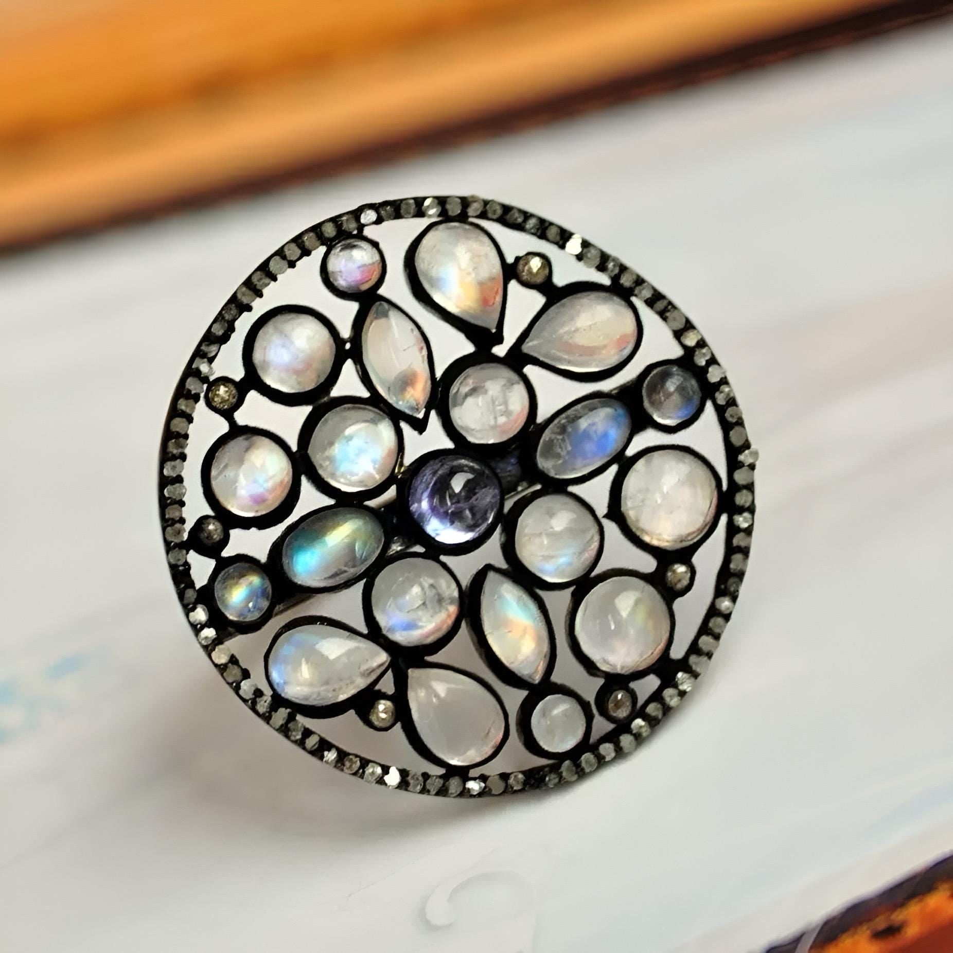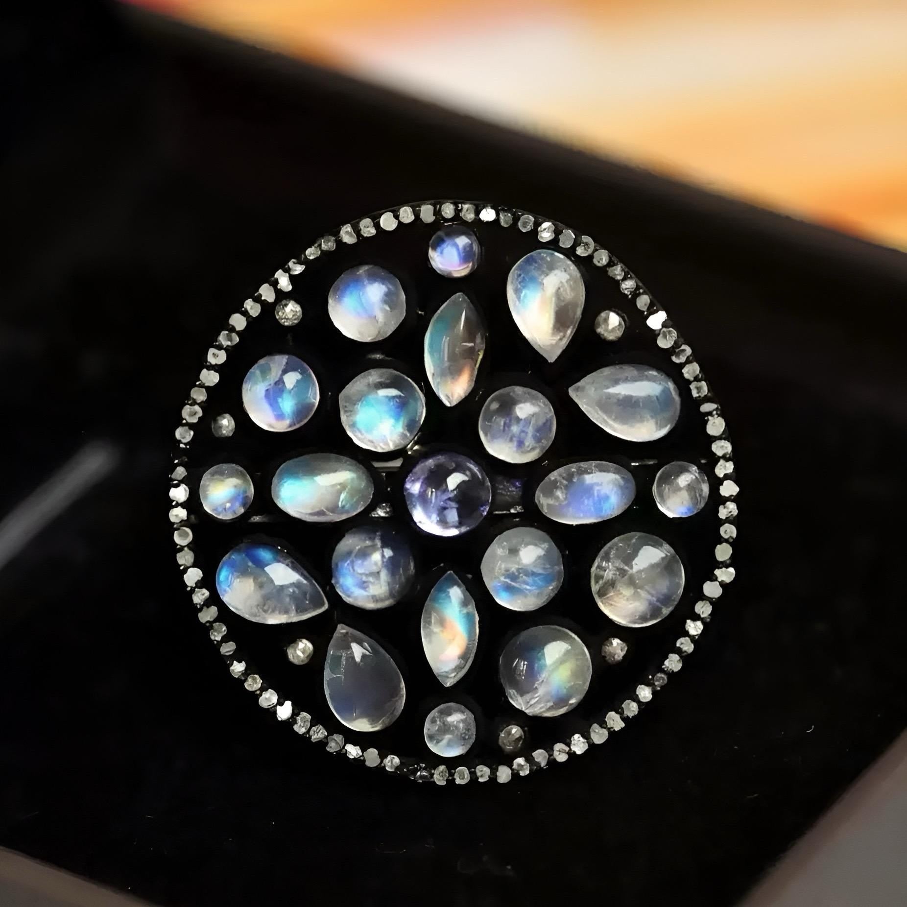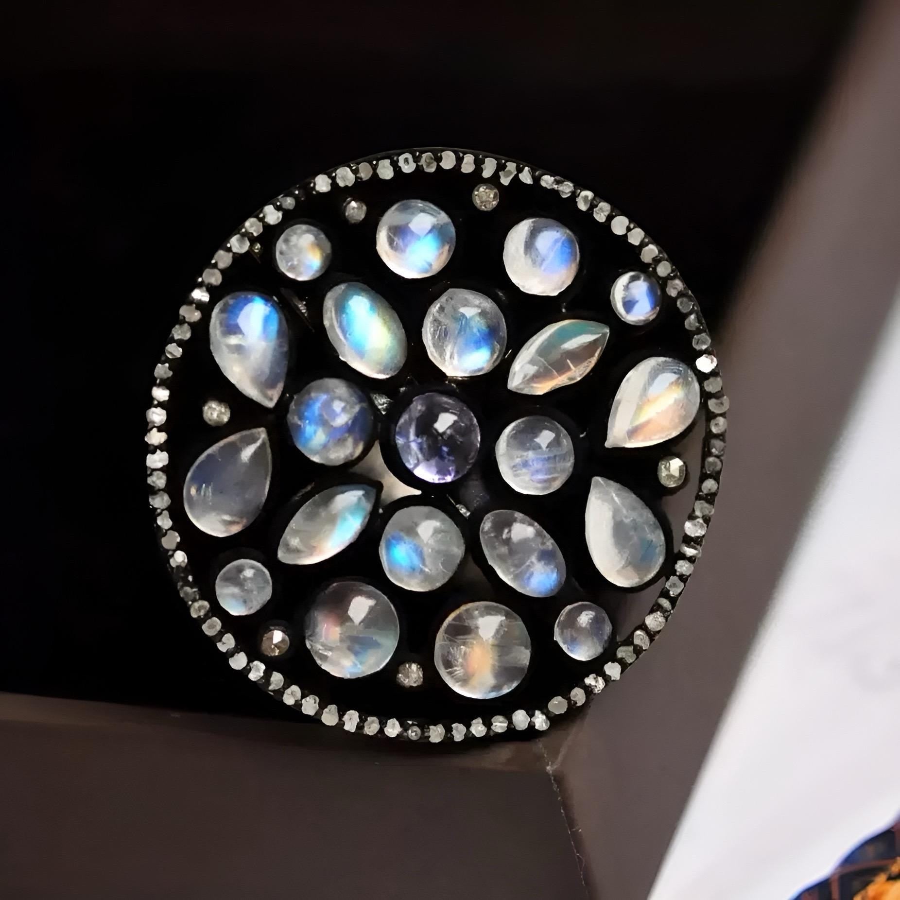 • A statement piece featuring a cluster of moonstones in various shapes and sizes, artistically arranged into a bold circular design. Sparkling accents of natural diamonds add a touch of glamour.