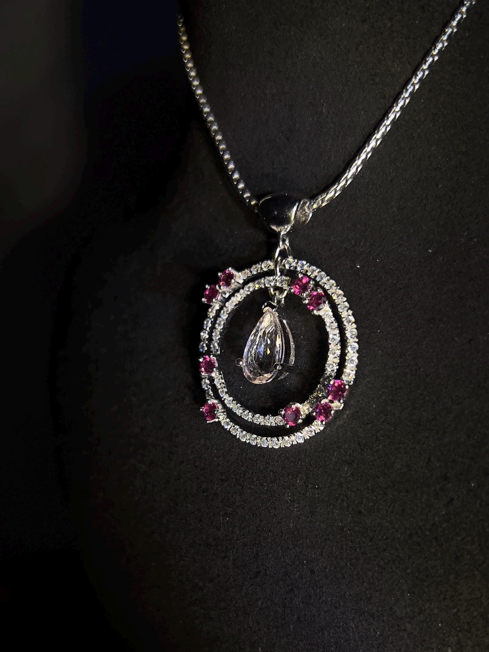 Natural Morganite and Rhodolite Garnet Pendant Necklace with Sapphires