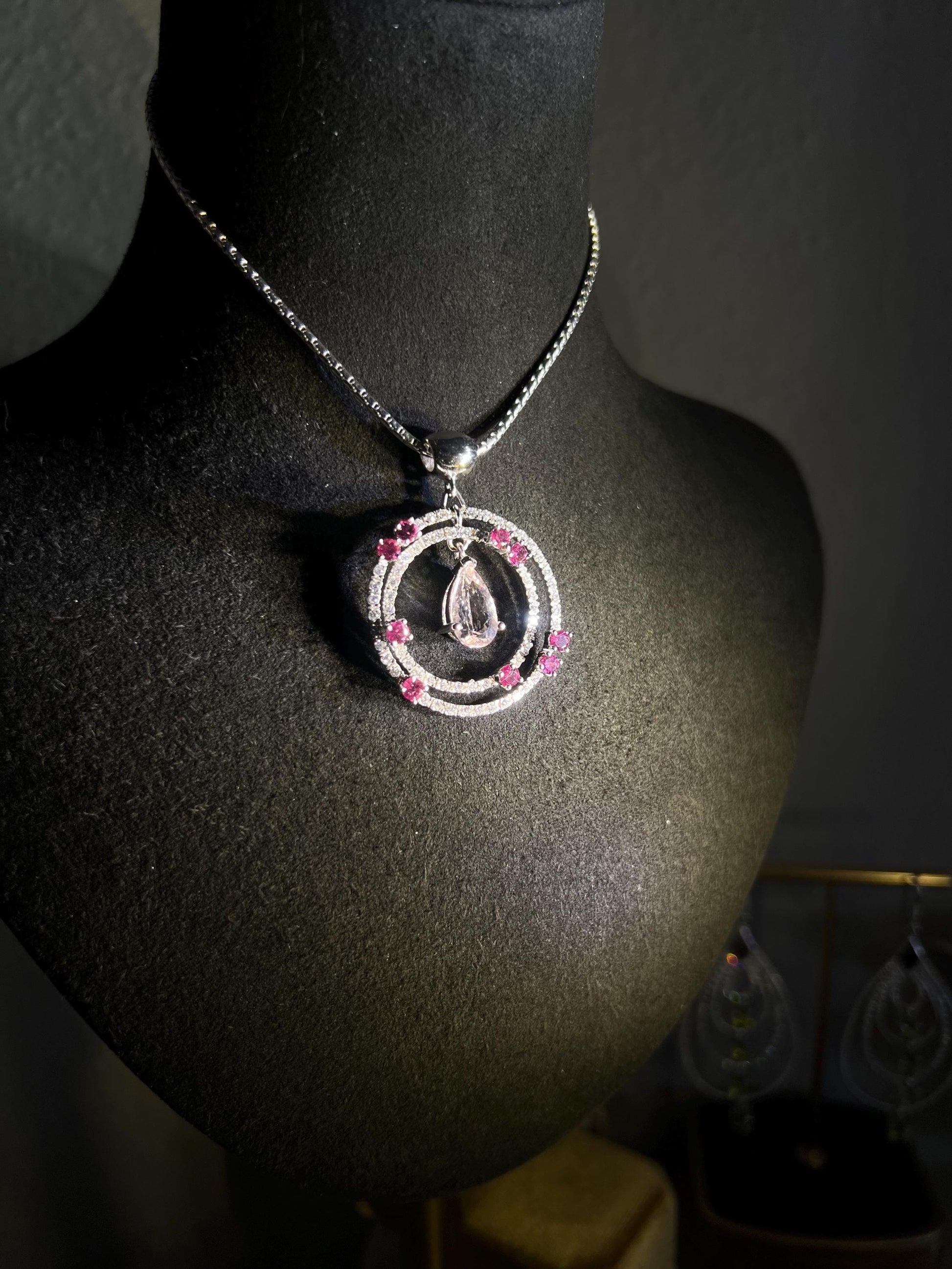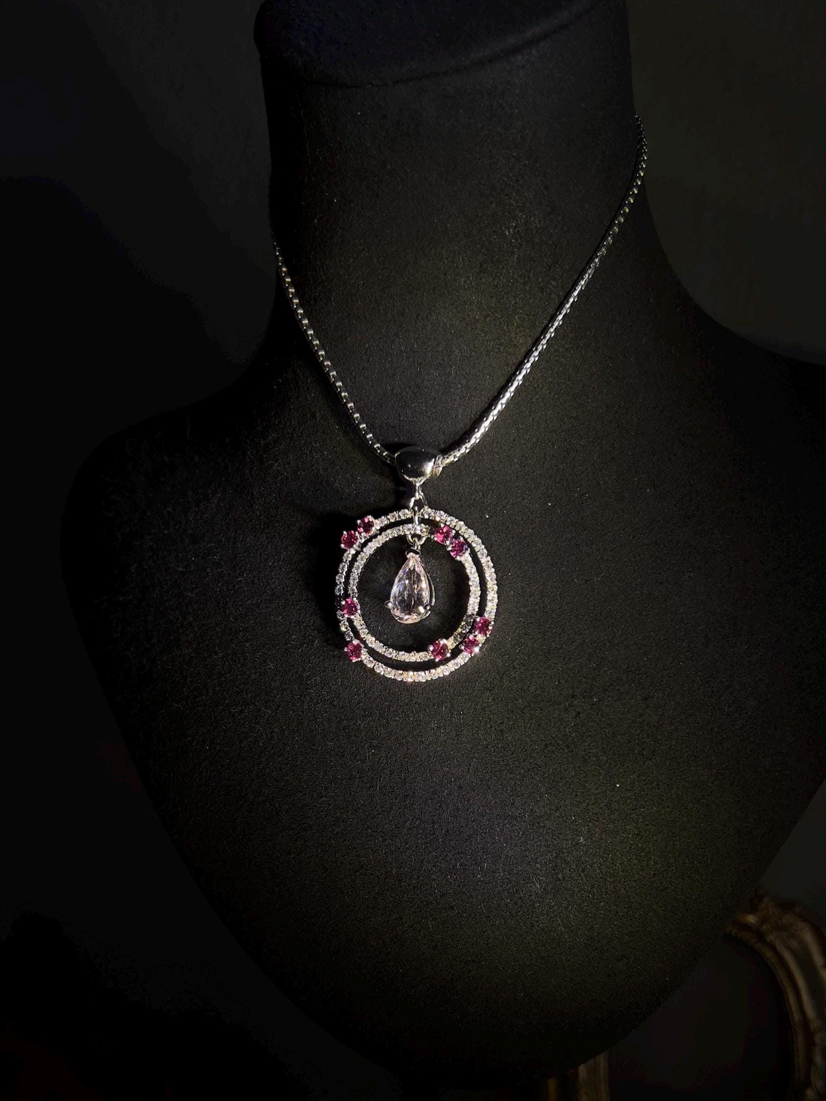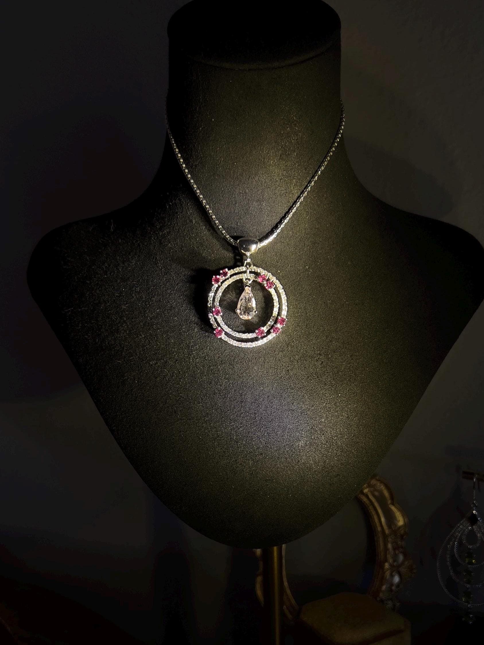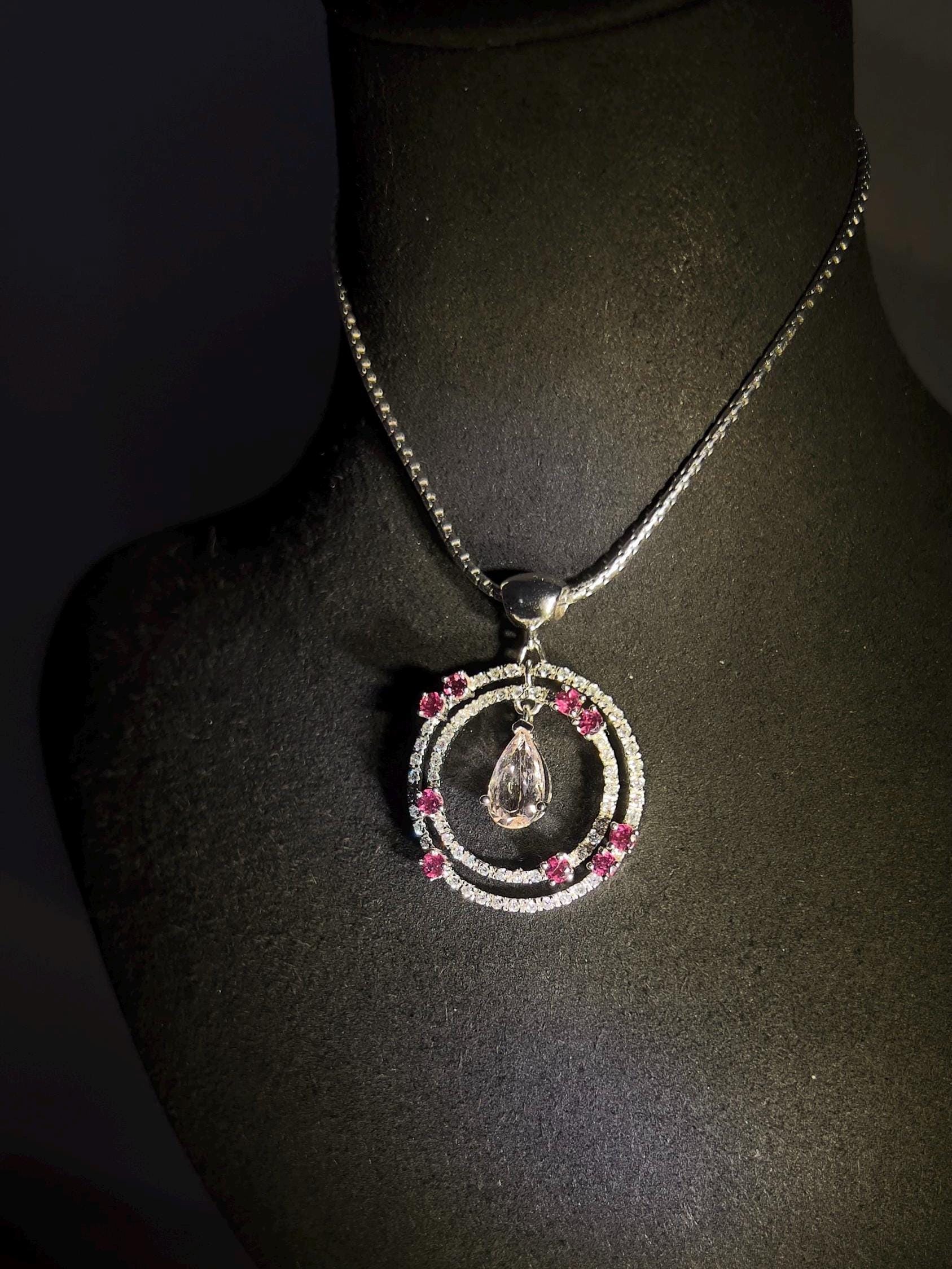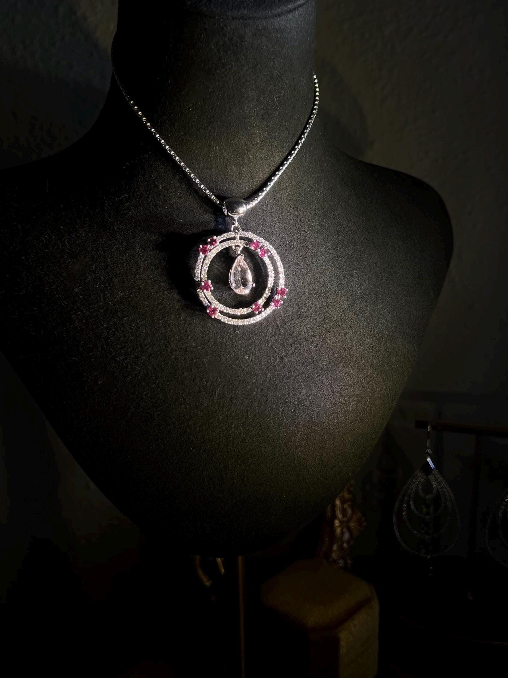 This pendant is more than jewelry, it’s a symbol of calm and warmth, woven with the gentle energy of natural pink gemstones. Morganite as known as pink Beryl, with its soft, blush hue, is often called the stone of divine love, believed to open the heart and nurture peace. Paired with the vibrant rhodolite garnets, this piece radiate balance, grounding the wearer in self-confidence and compassion. The white sapphires add a touch of clarity, amplifying the harmonious energy of the pink stones. Wearing this necklace isn’t just about style—it’s about carrying a sense of calm and kindness, embracing the healing power of natural beauty.