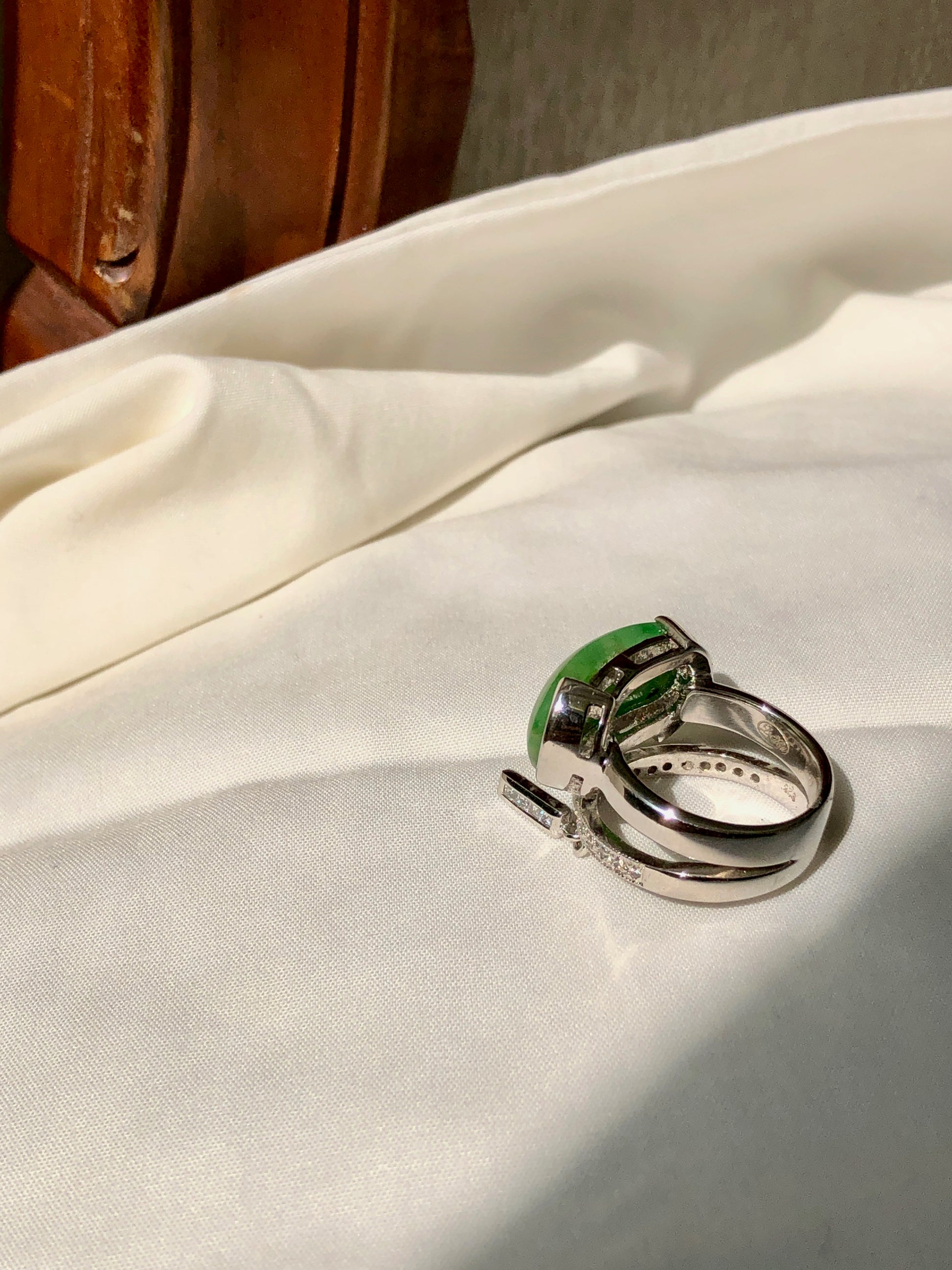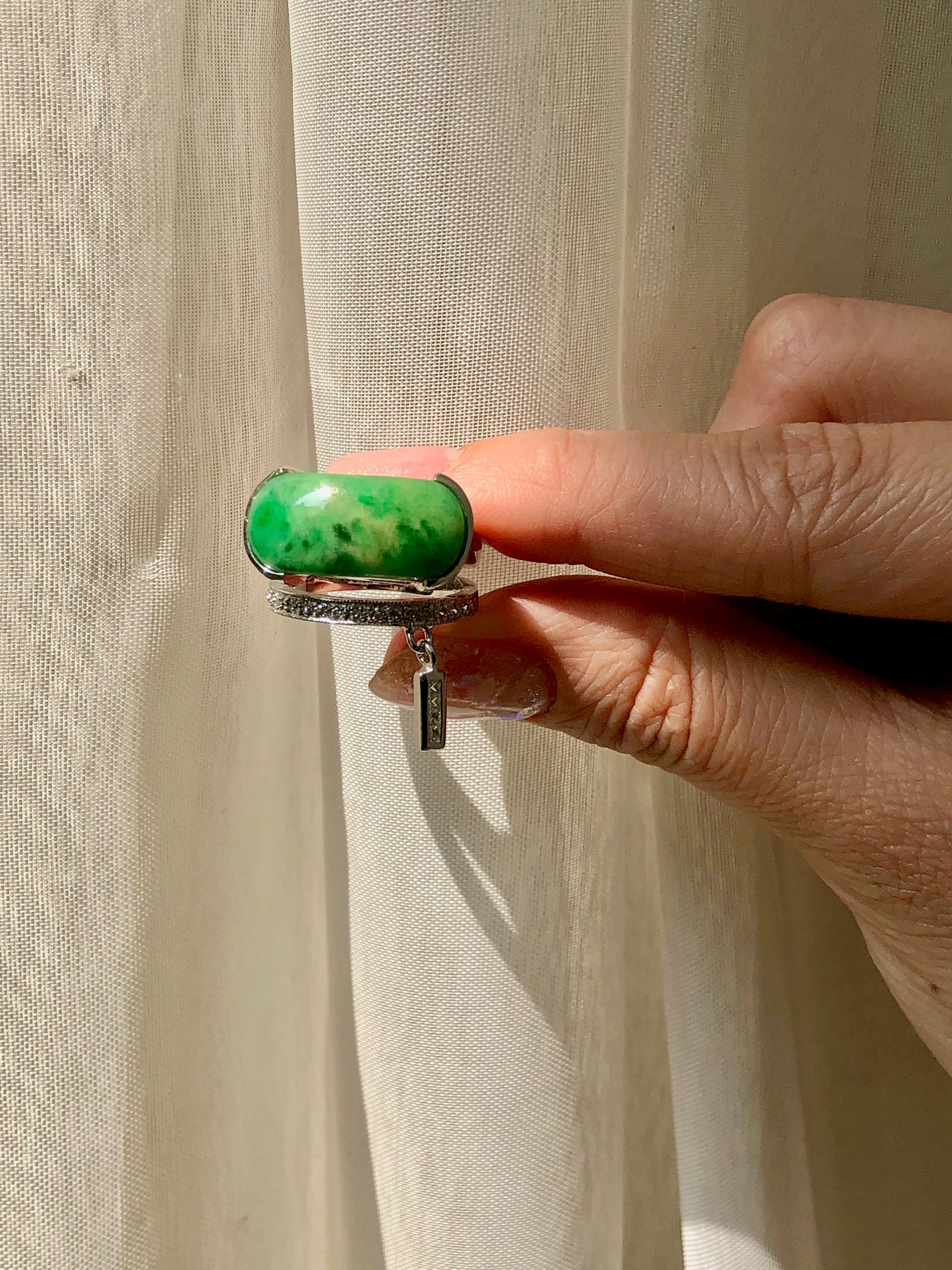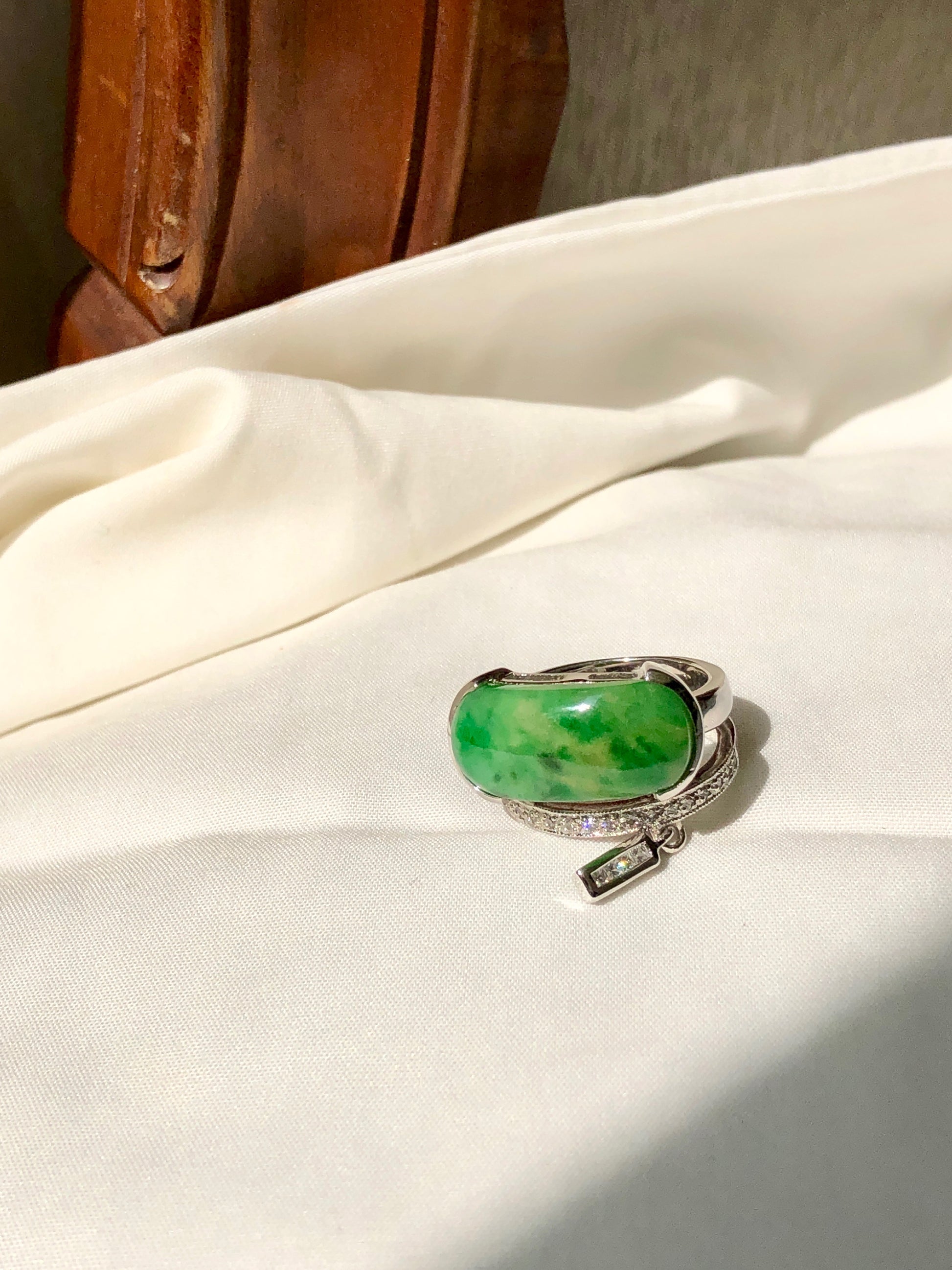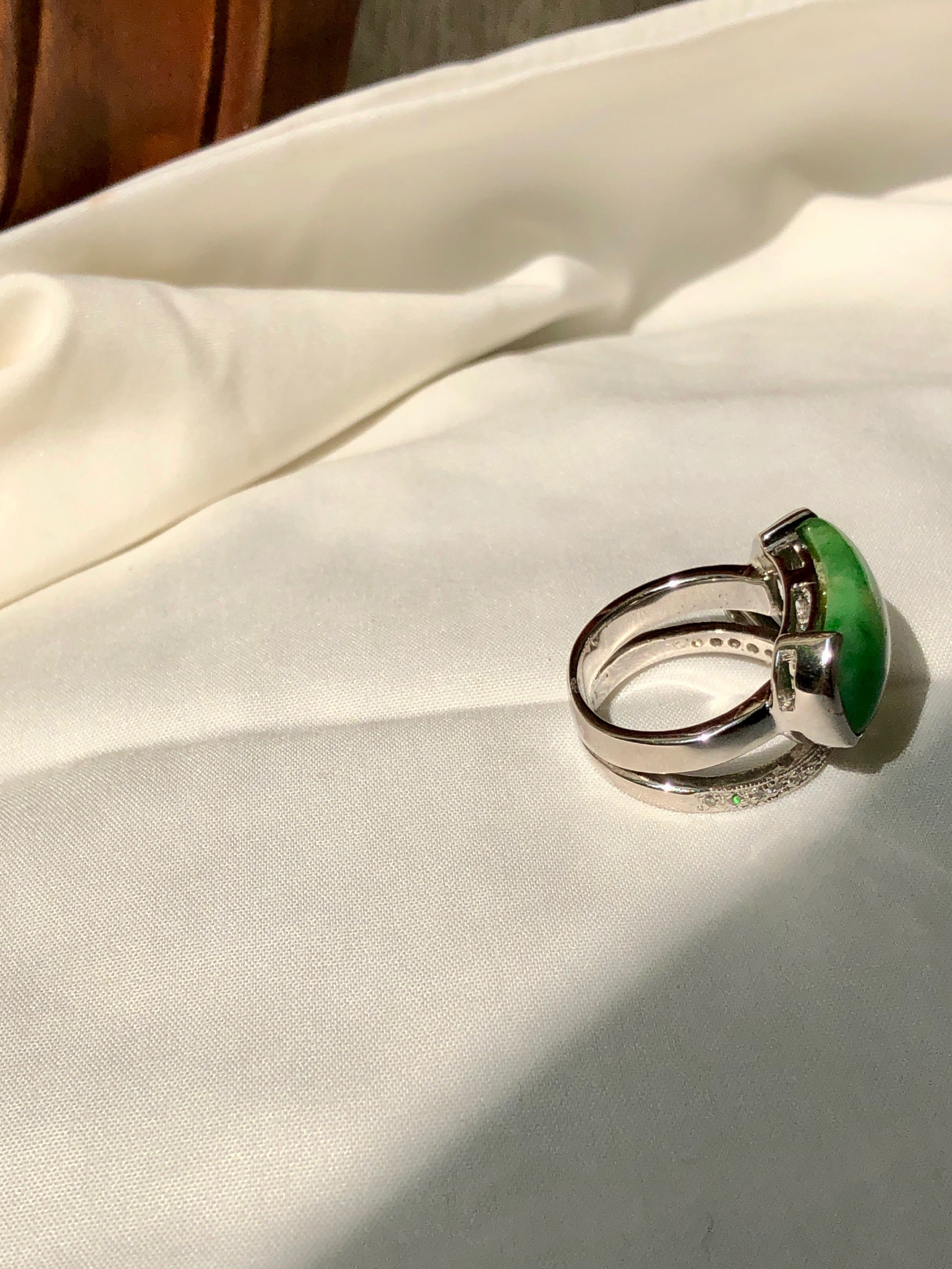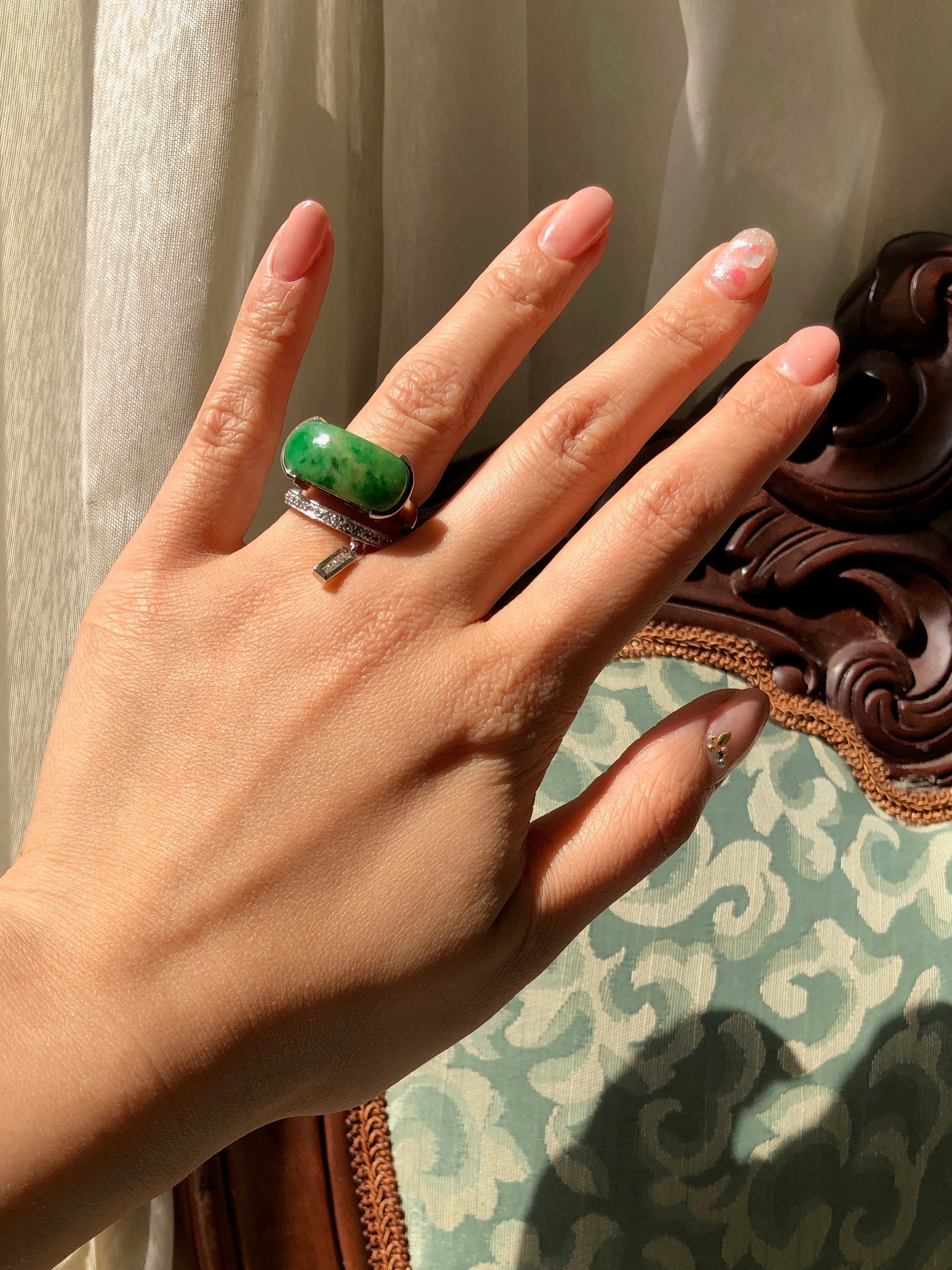 This splendid cocktail ring features untreated natural jadeite jade, showcasing a vivid oil paint green and pearlescent background with vibrant green floral motifs.