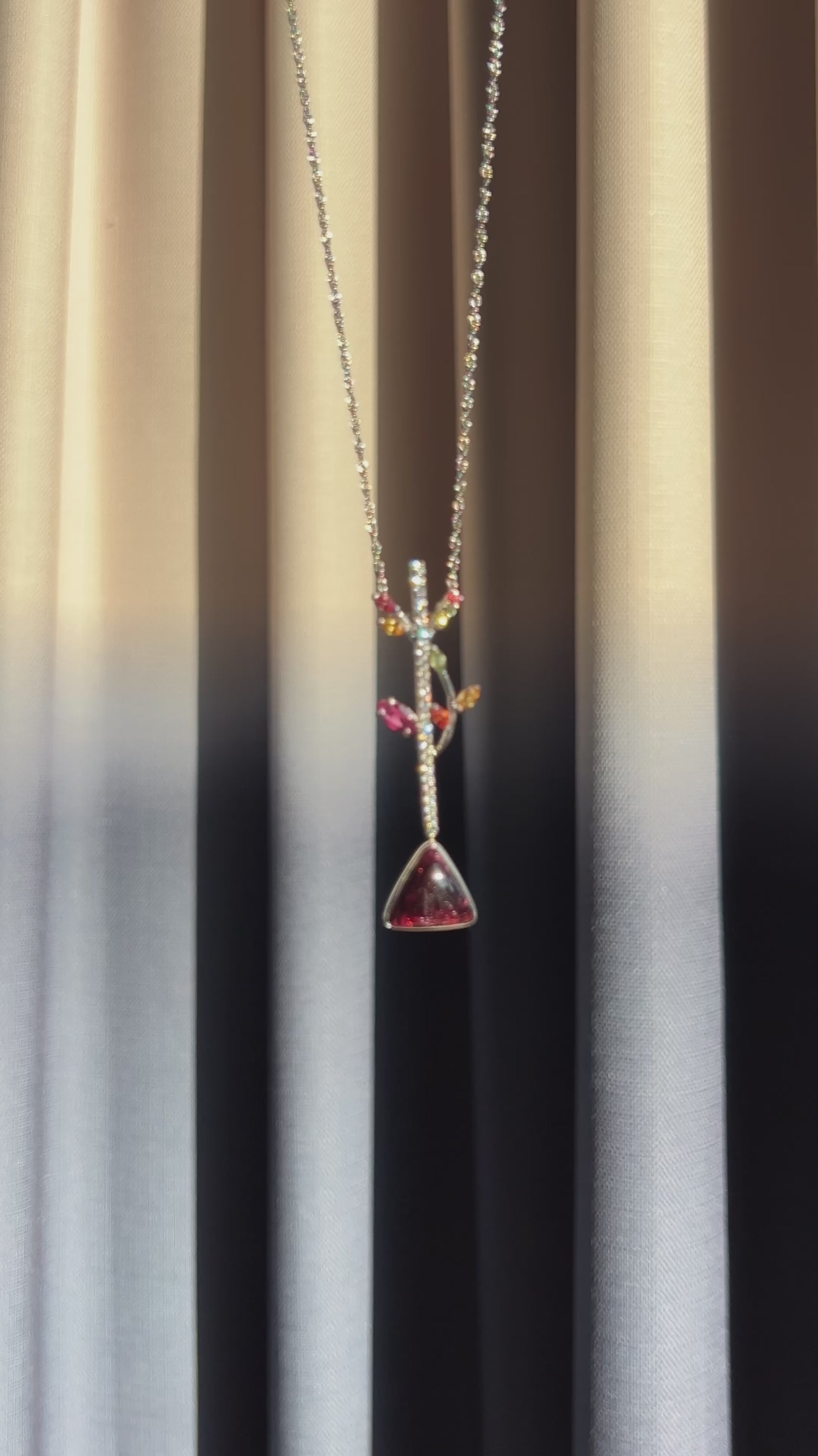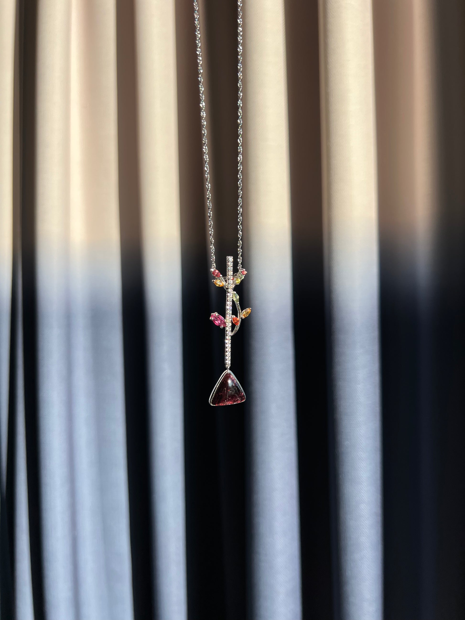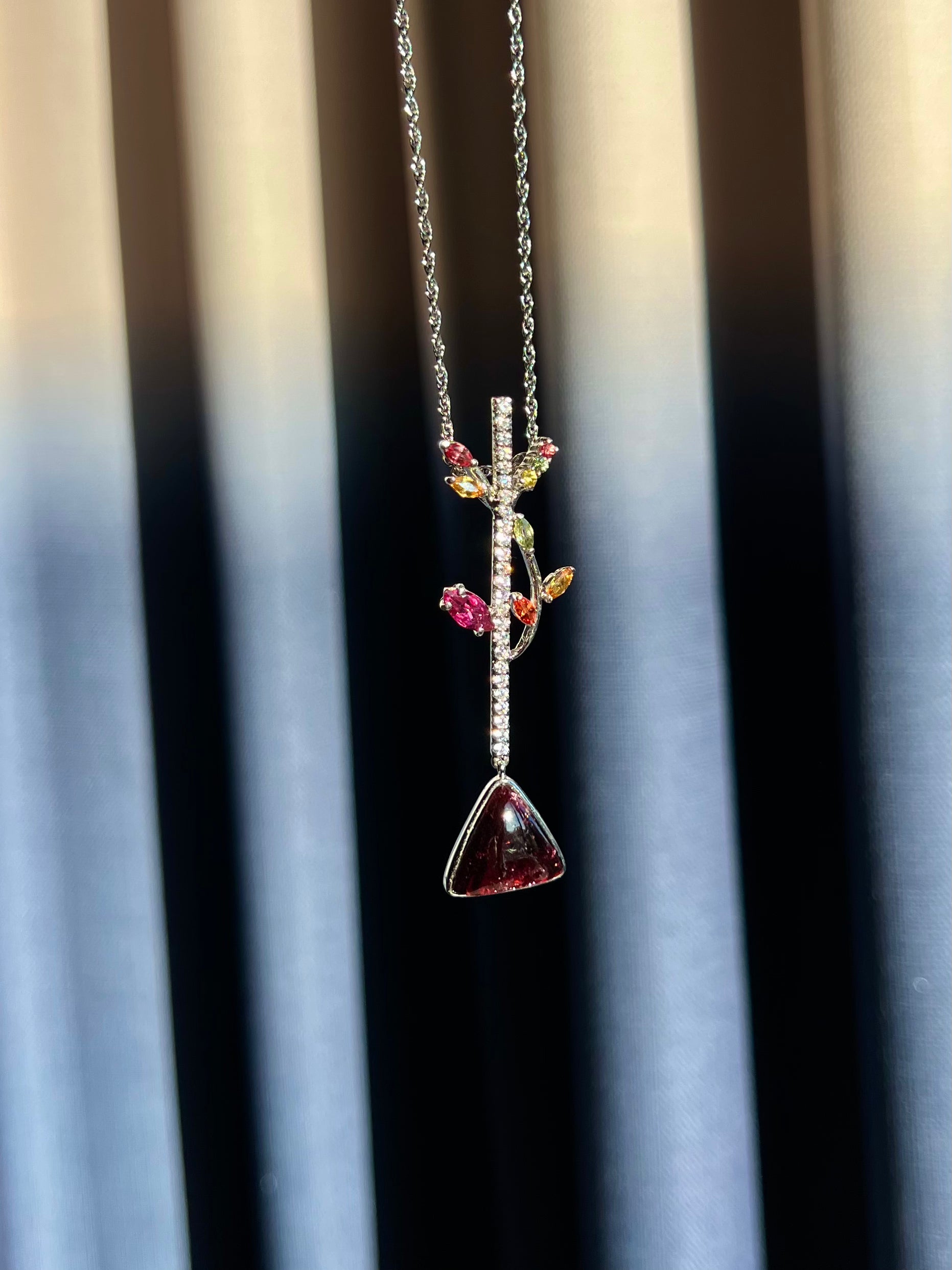 Enchantment with one-of-a-kind Fanciful Natural Triangular Plum Tourmaline Pendant Necklace. This exquisite piece showcases a triangular-cut plum tourmaline set in pure sterling silver vermeil with an 18K white gold finish. Adorned with colorful natural tourmalines and sparkling white sapphires, it exudes a whimsical charm reminiscent of fairytales.