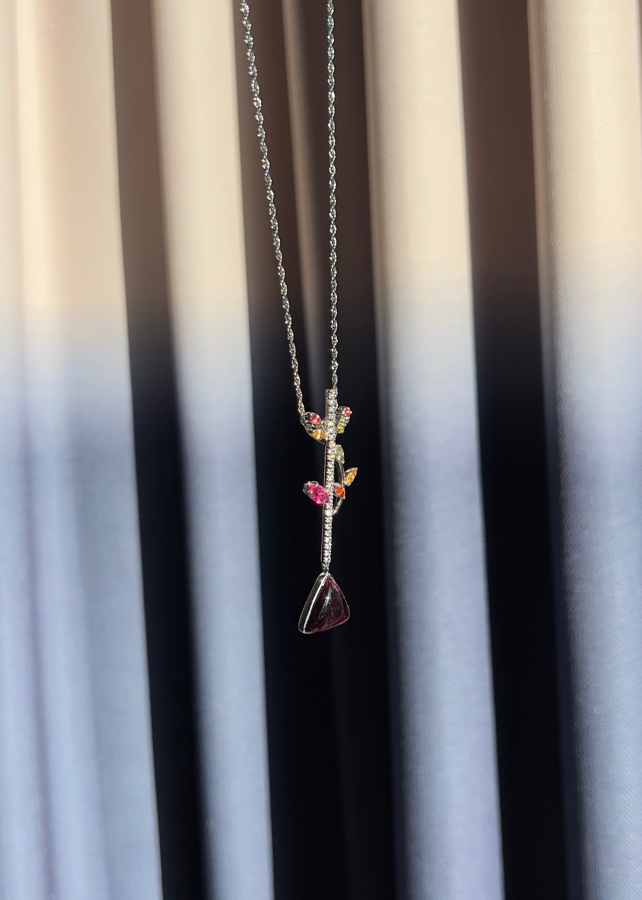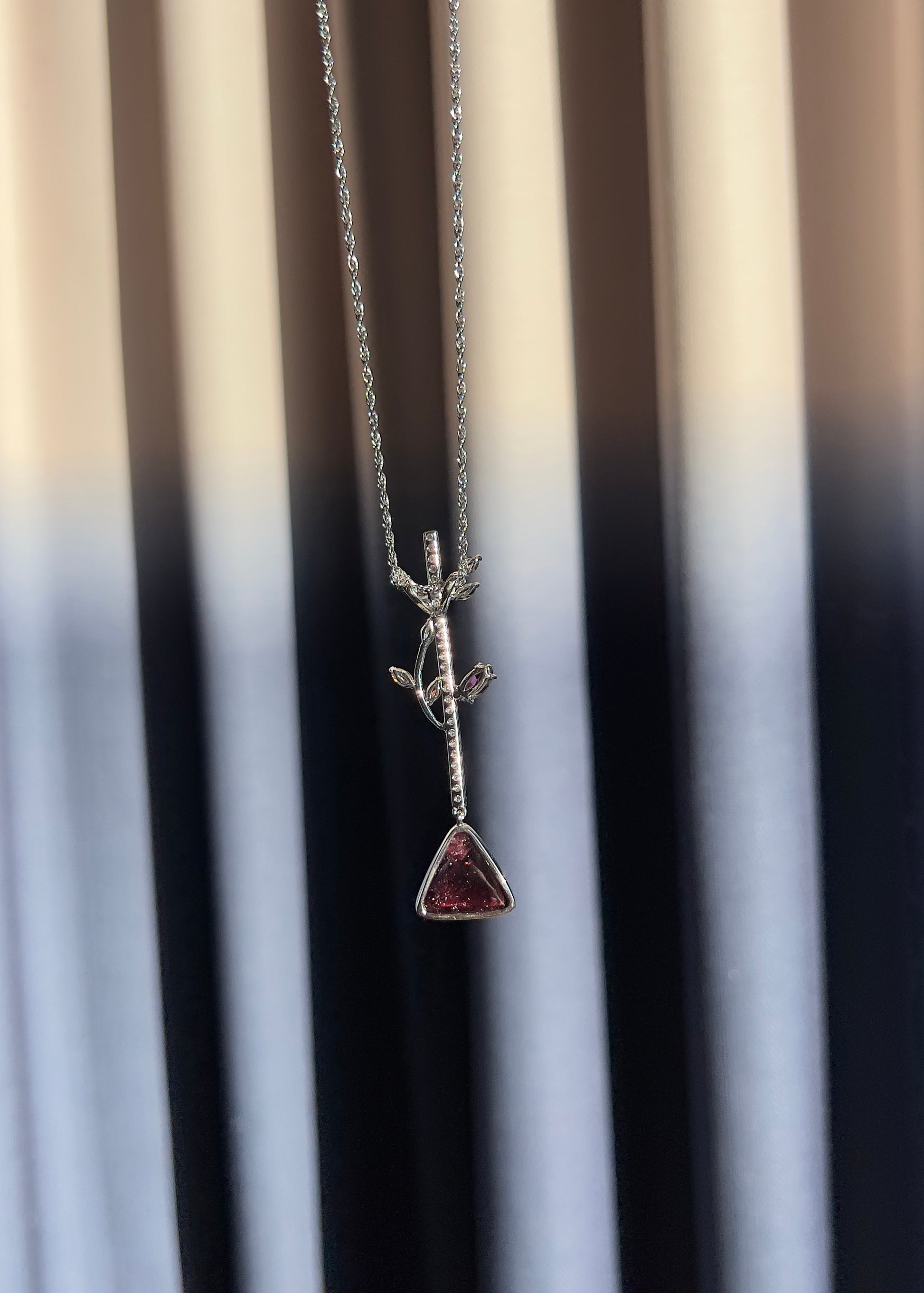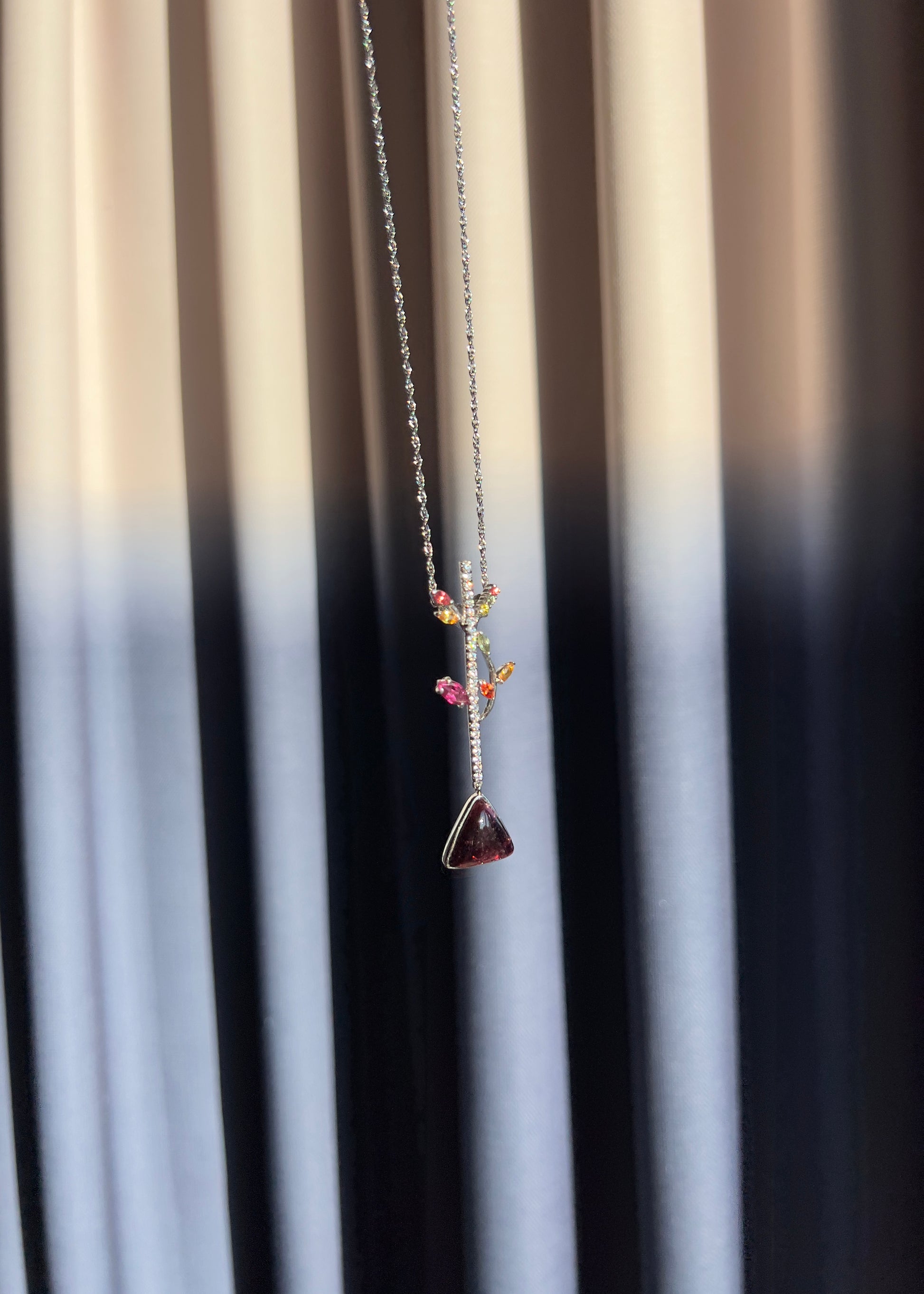 Enchantment with one-of-a-kind Fanciful Natural Triangular Plum Tourmaline Pendant Necklace. This exquisite piece showcases a triangular-cut plum tourmaline set in pure sterling silver vermeil with an 18K white gold finish. Adorned with colorful natural tourmalines and sparkling white sapphires, it exudes a whimsical charm reminiscent of fairytales.