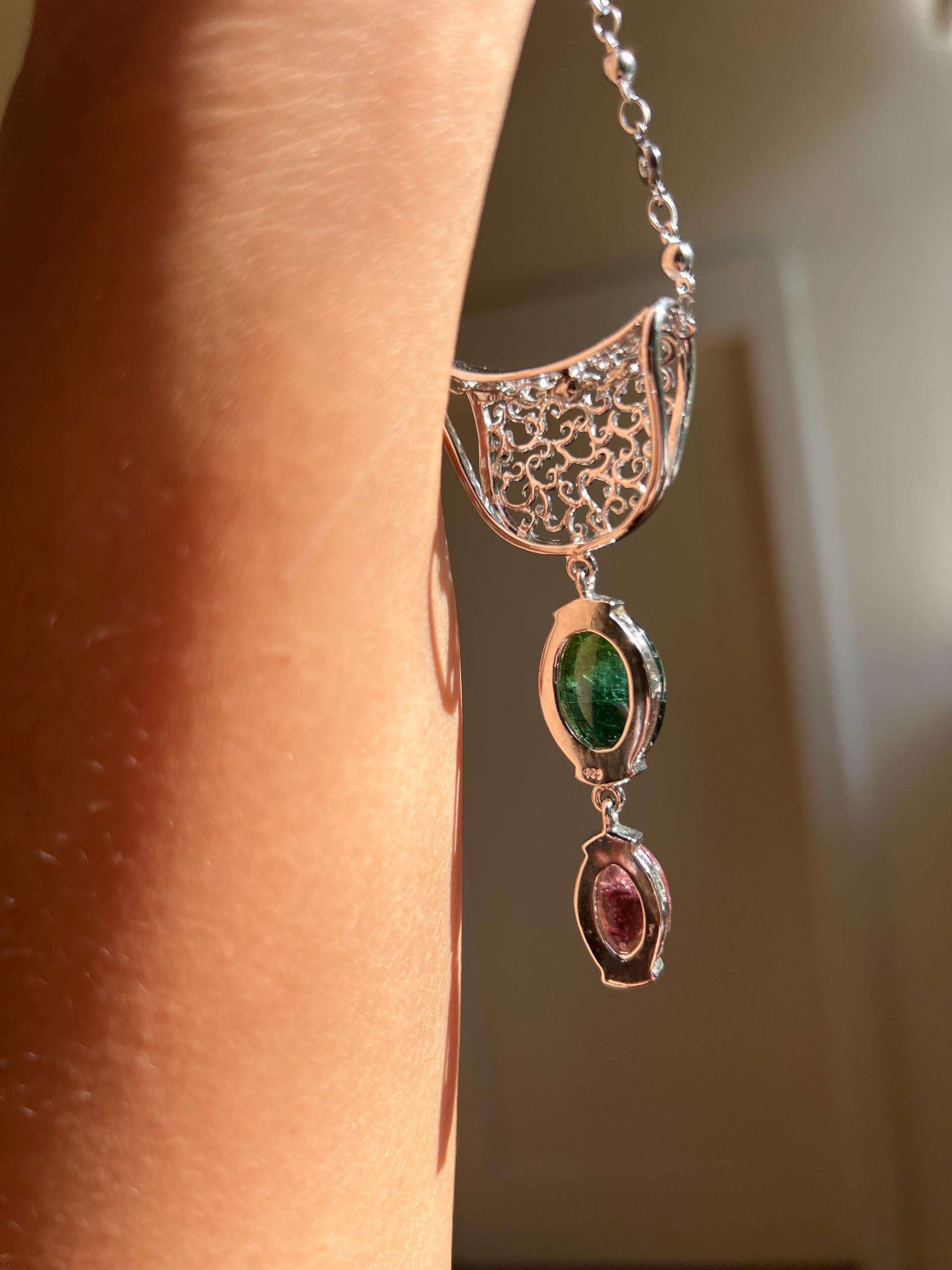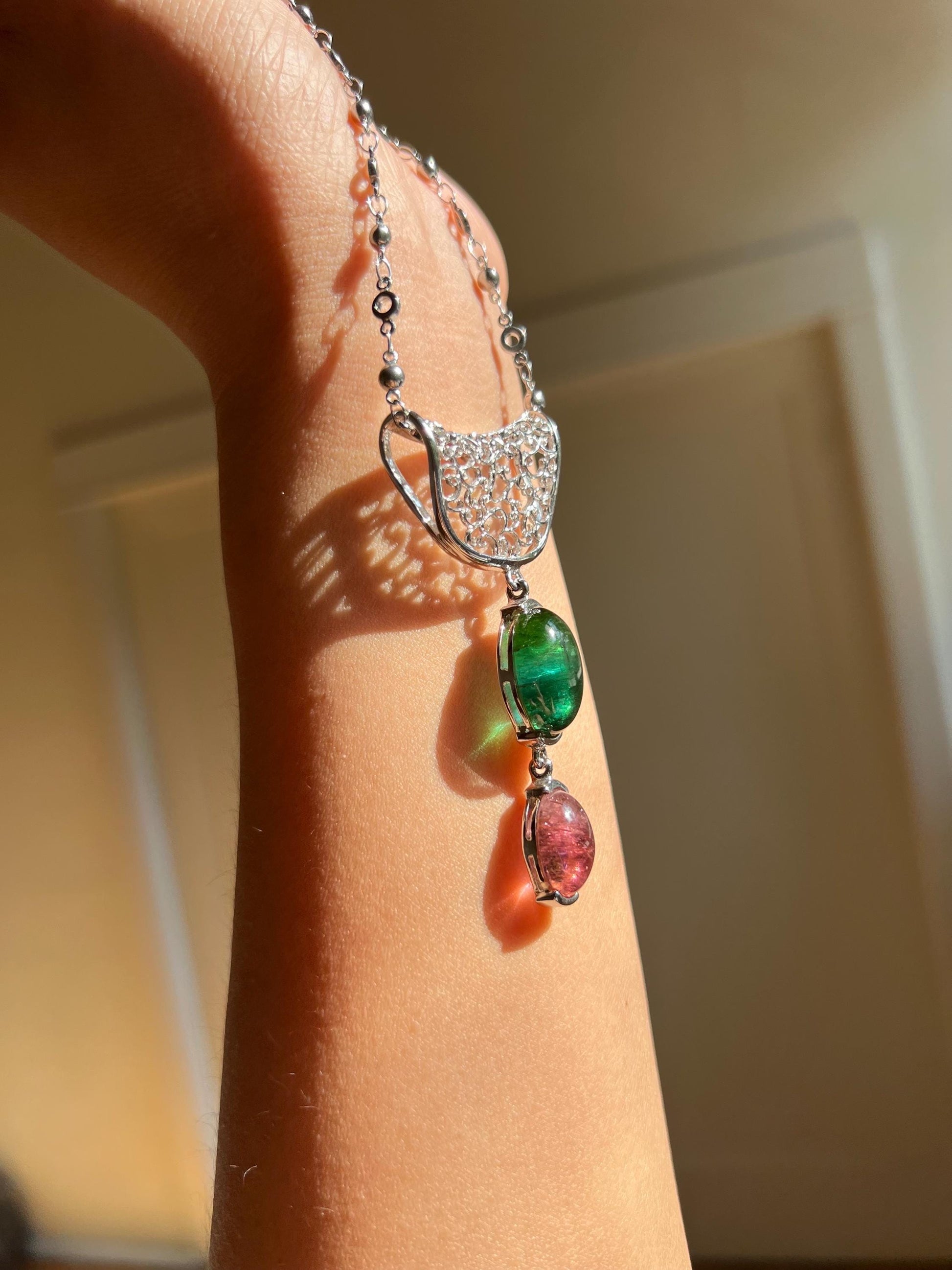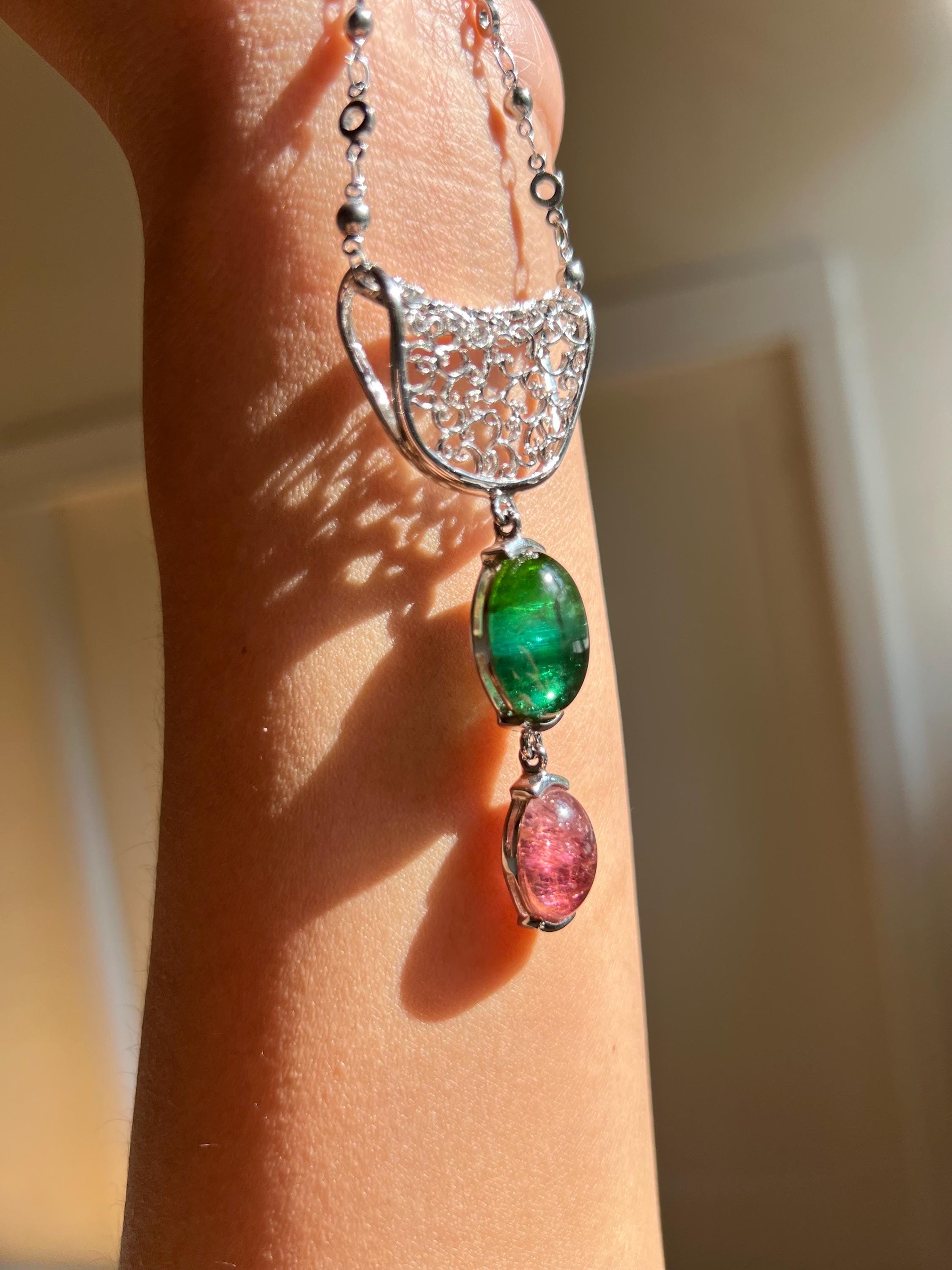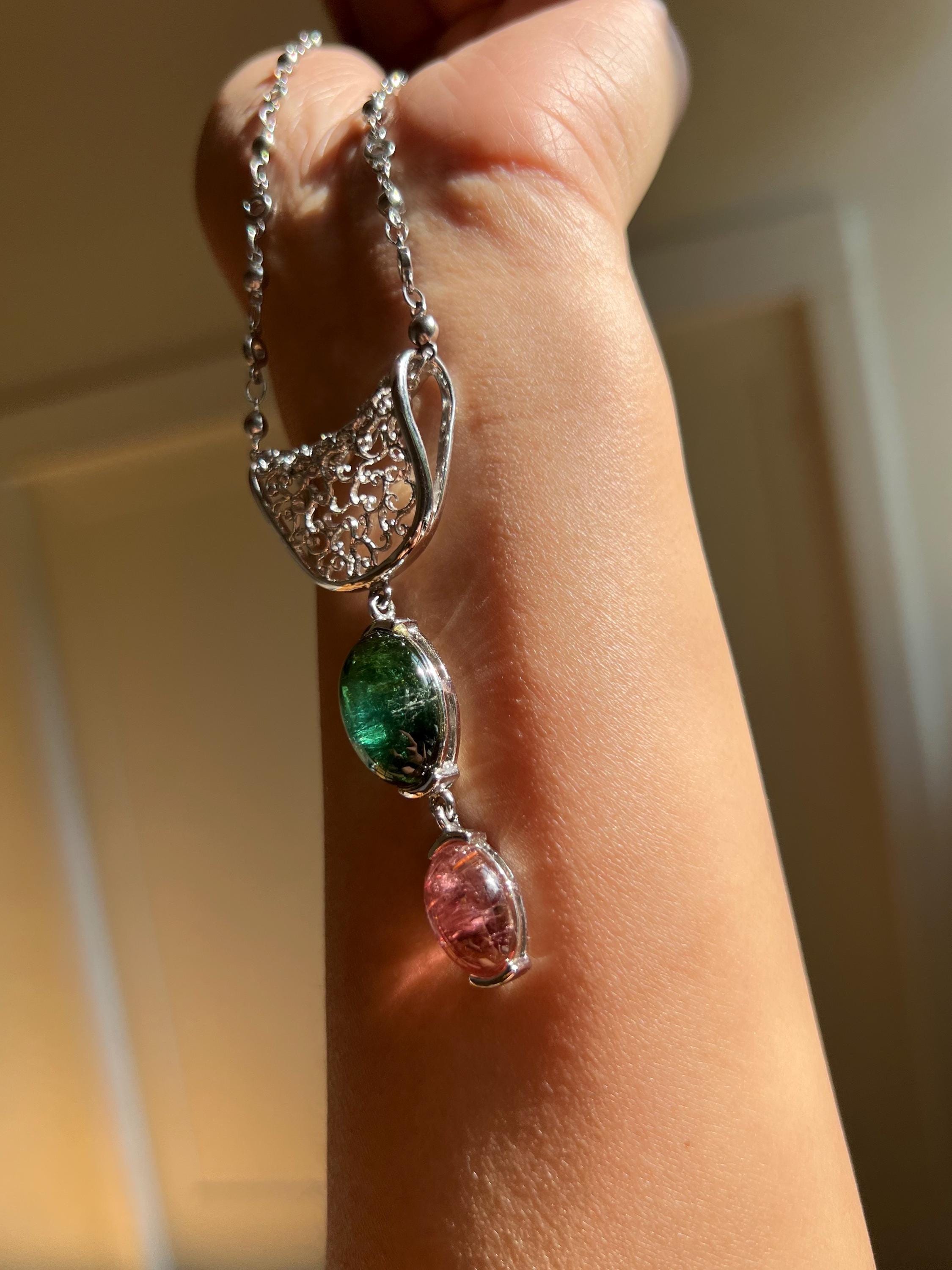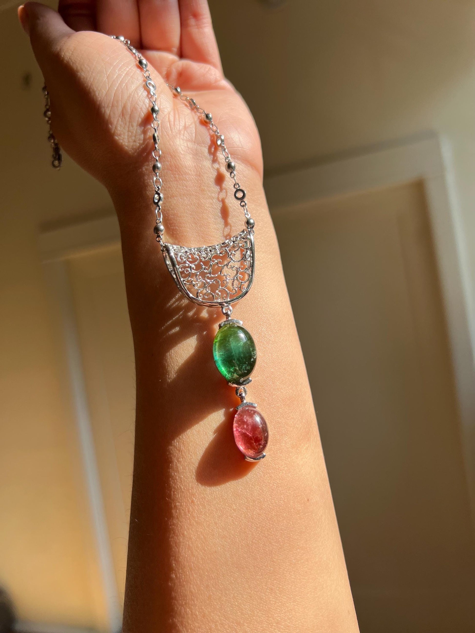 This one-of-a-kind pendant features a sculptural, lace-like crescent motif that holds two exquisite natural gemstones: