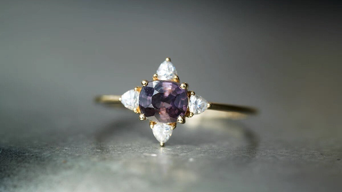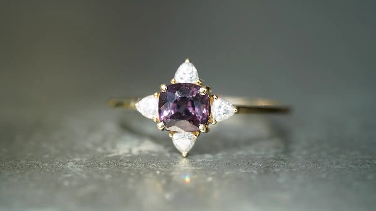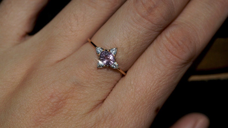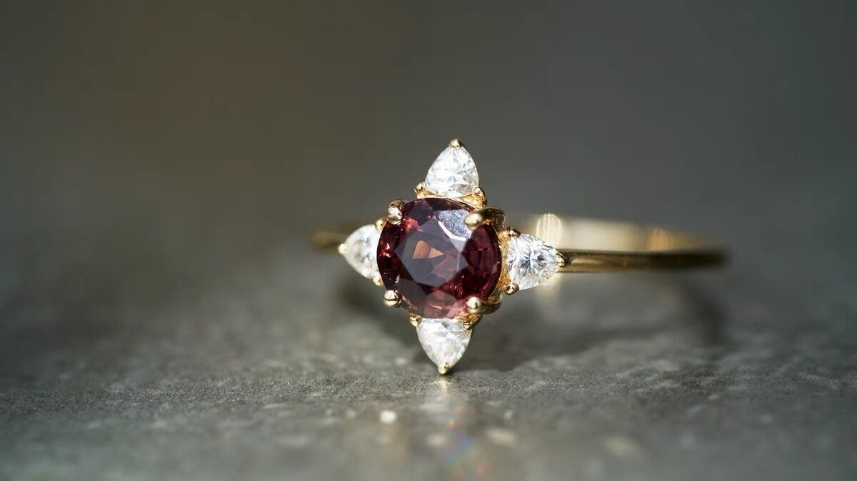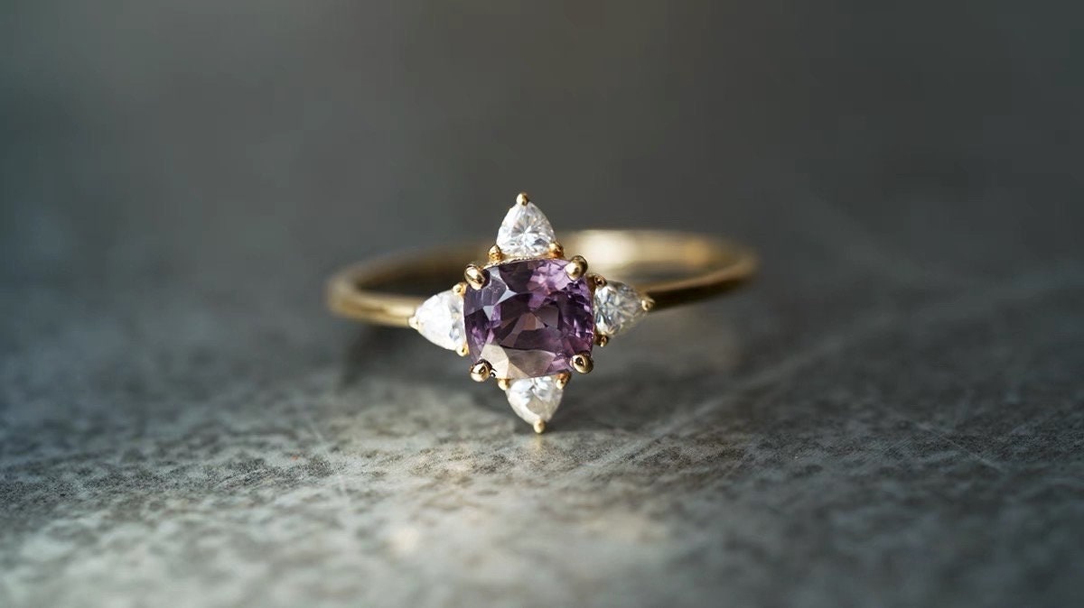 This exquisite ring features a natural Burmese Spinel ,approximately 0.85 carats, set in 14k solid yellow gold. It is adorned with four moissanites, each approximately 0.075 carats. For an additional cost, the moissanites can be replaced with natural diamonds upon request—please contact us for further details. The ring is designed to be stunning whether worn alone or stacked with other rings. Its delicate band contributes to its refined and versatile appearance, making it suitable for everyday wear. Please note that resizing is not available due to the ring's proportions.
