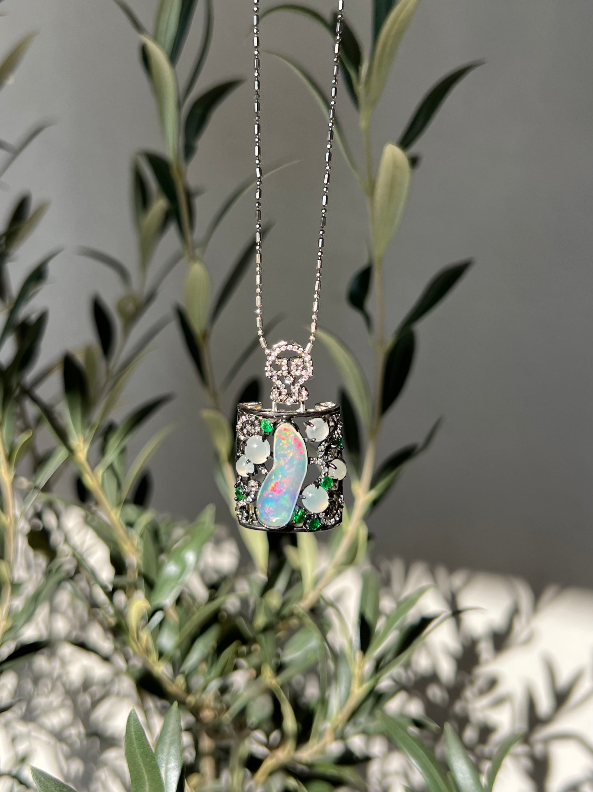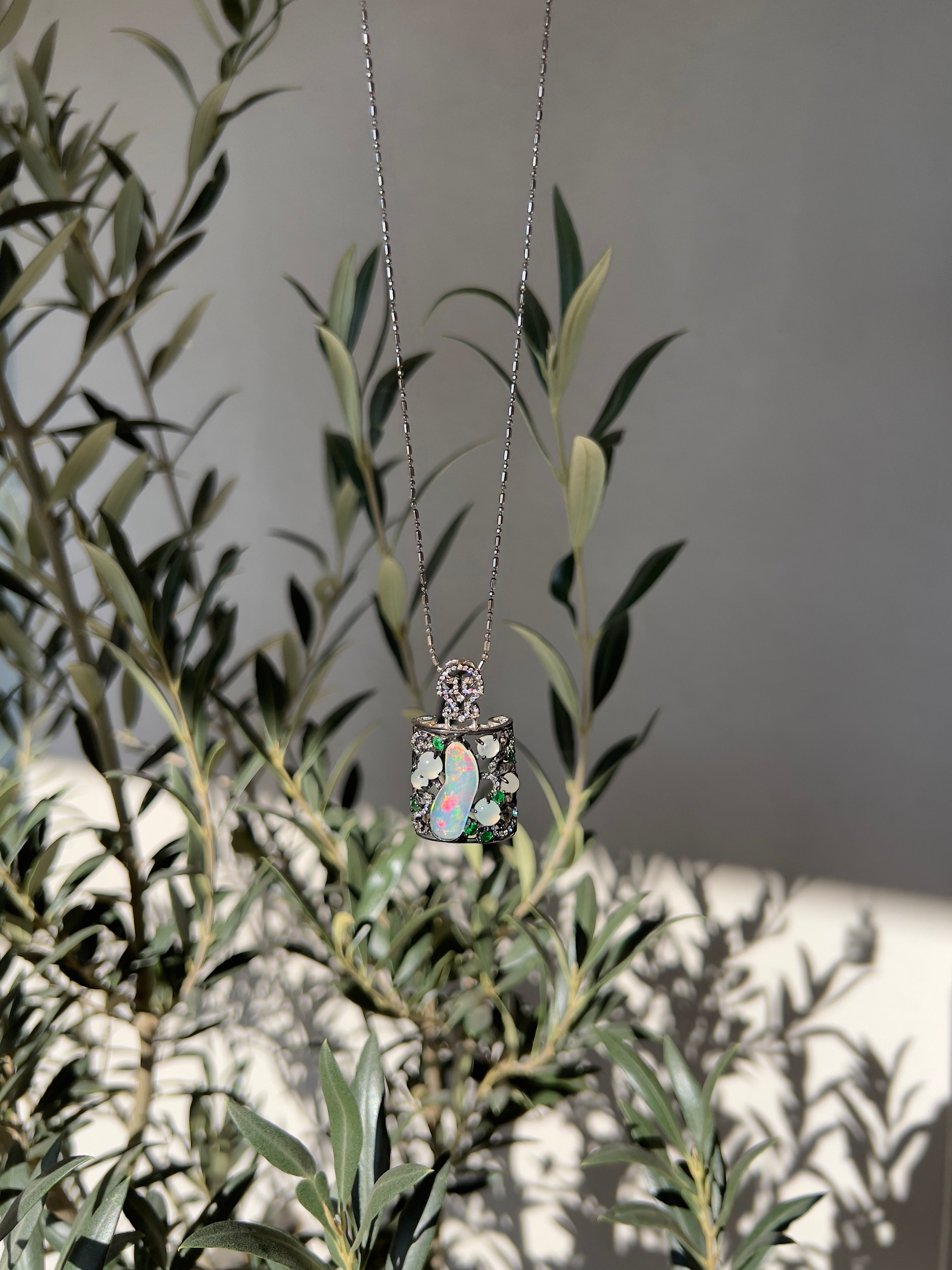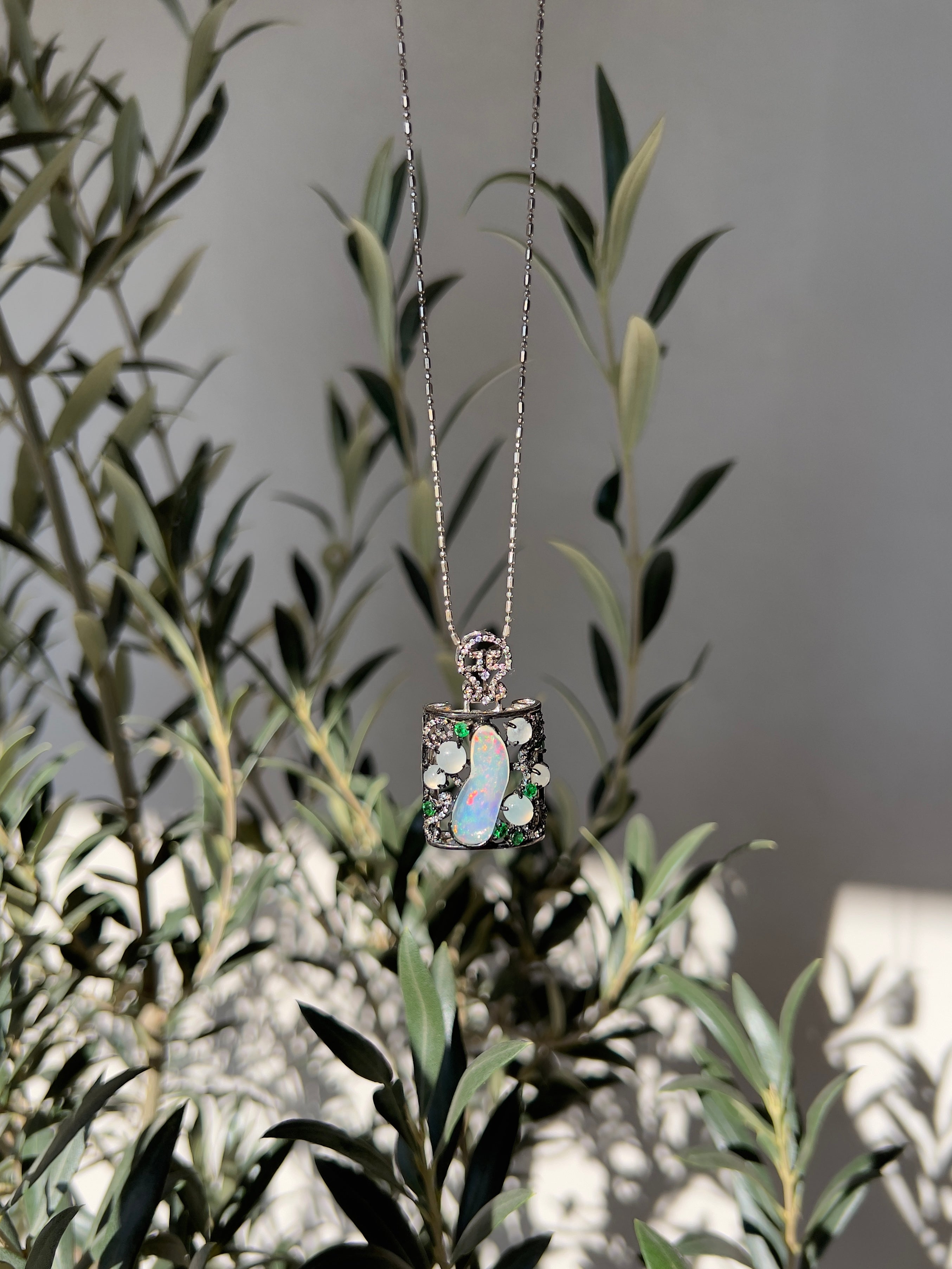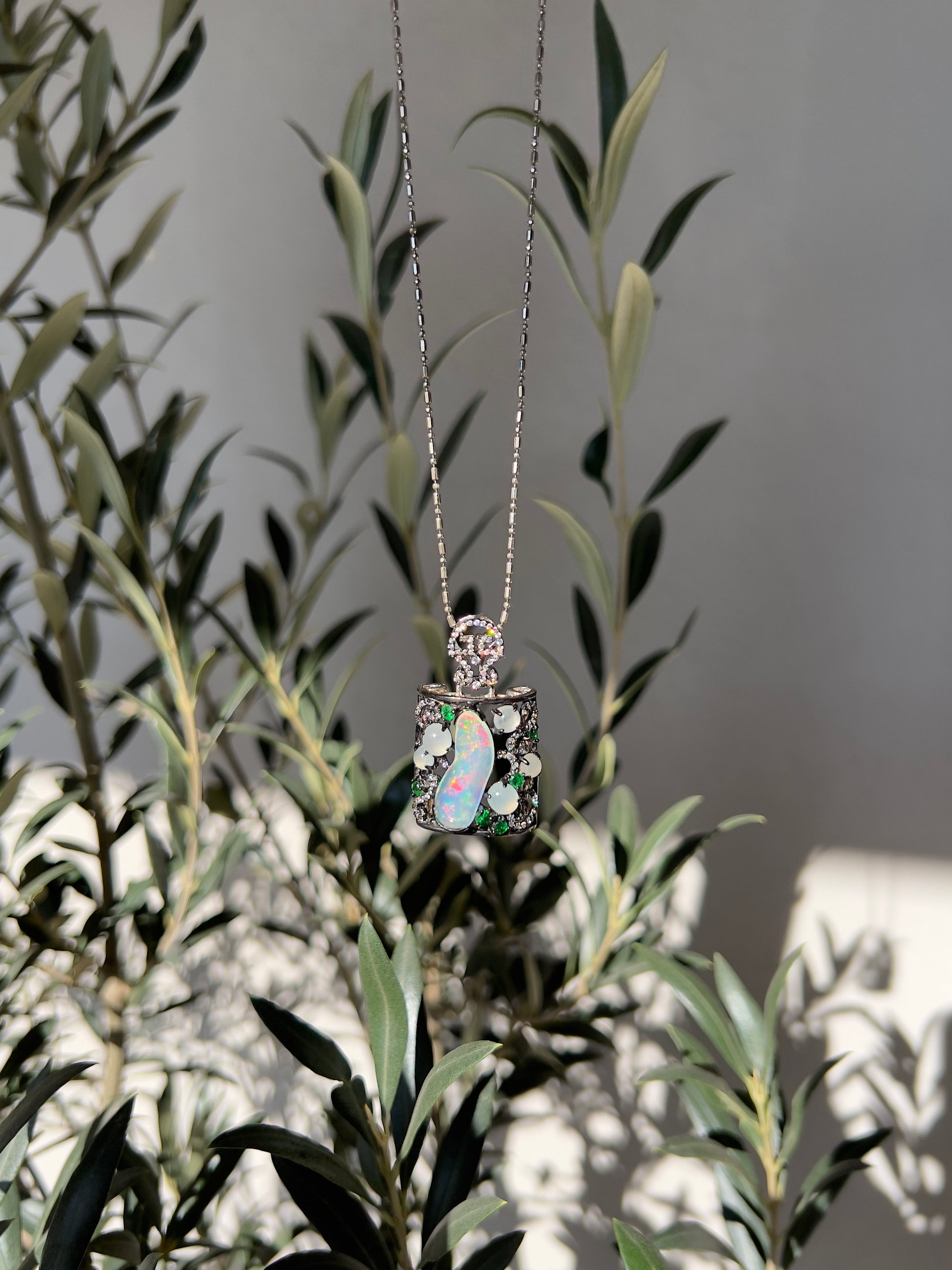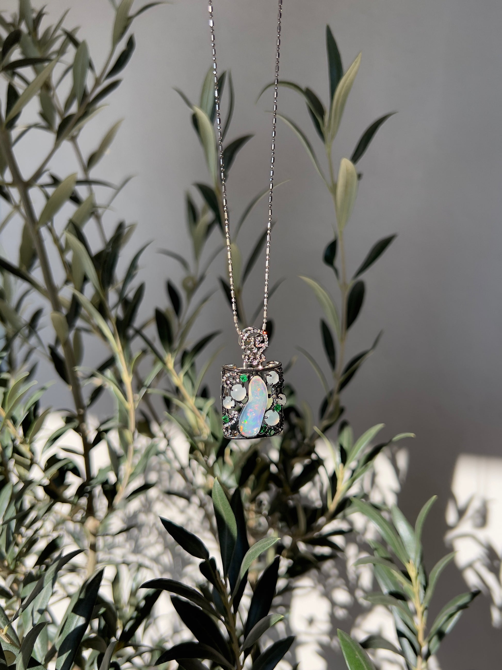A mysterious antique perfume bottle design featuring a lively free-form Ethiopian opal, adorned with bubbles made from white jadeites and chrome diopsides. Perfect for collectors, this piece can be worn on any occasion, adding a touch of elegance and intrigue to any ensemble.