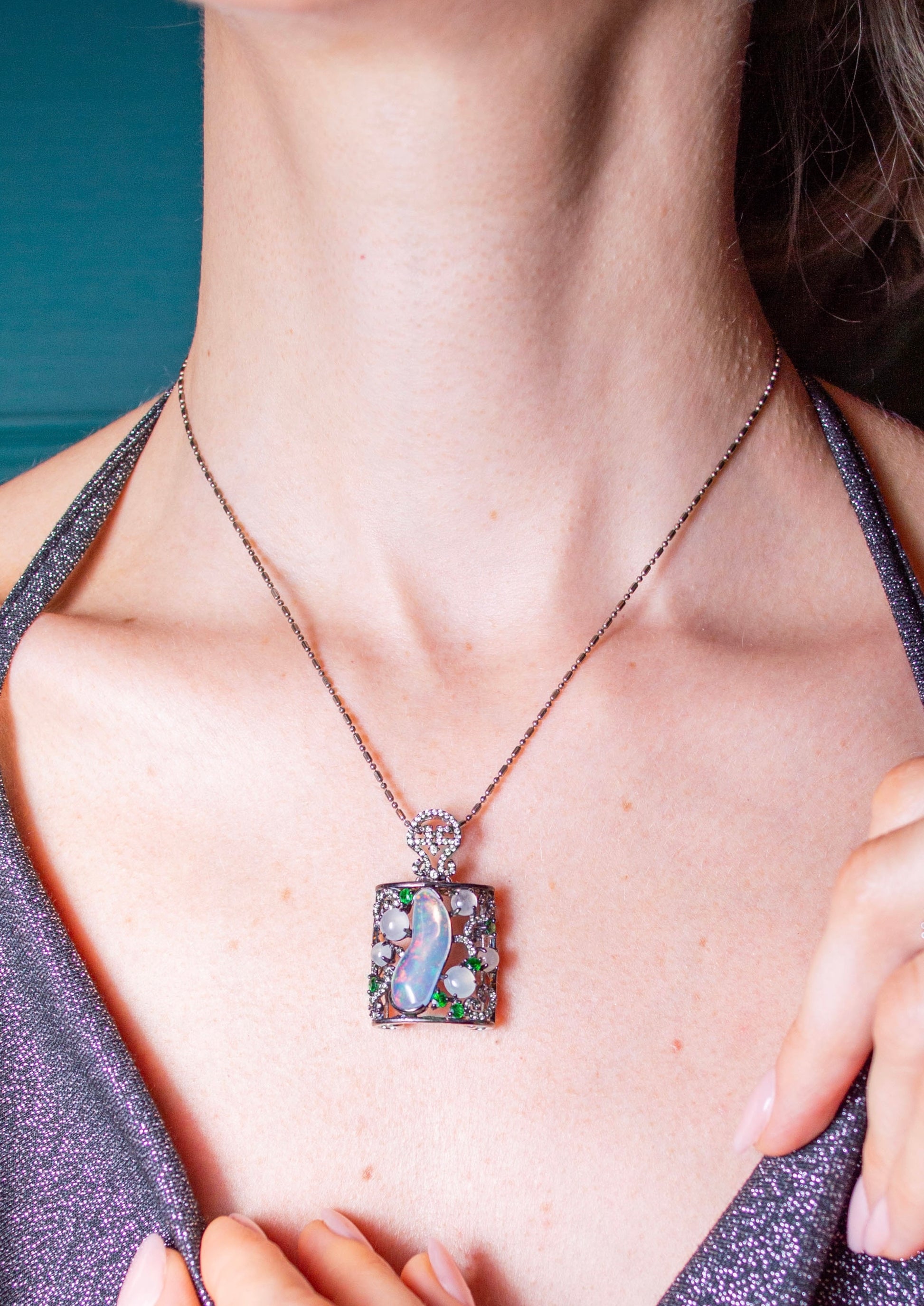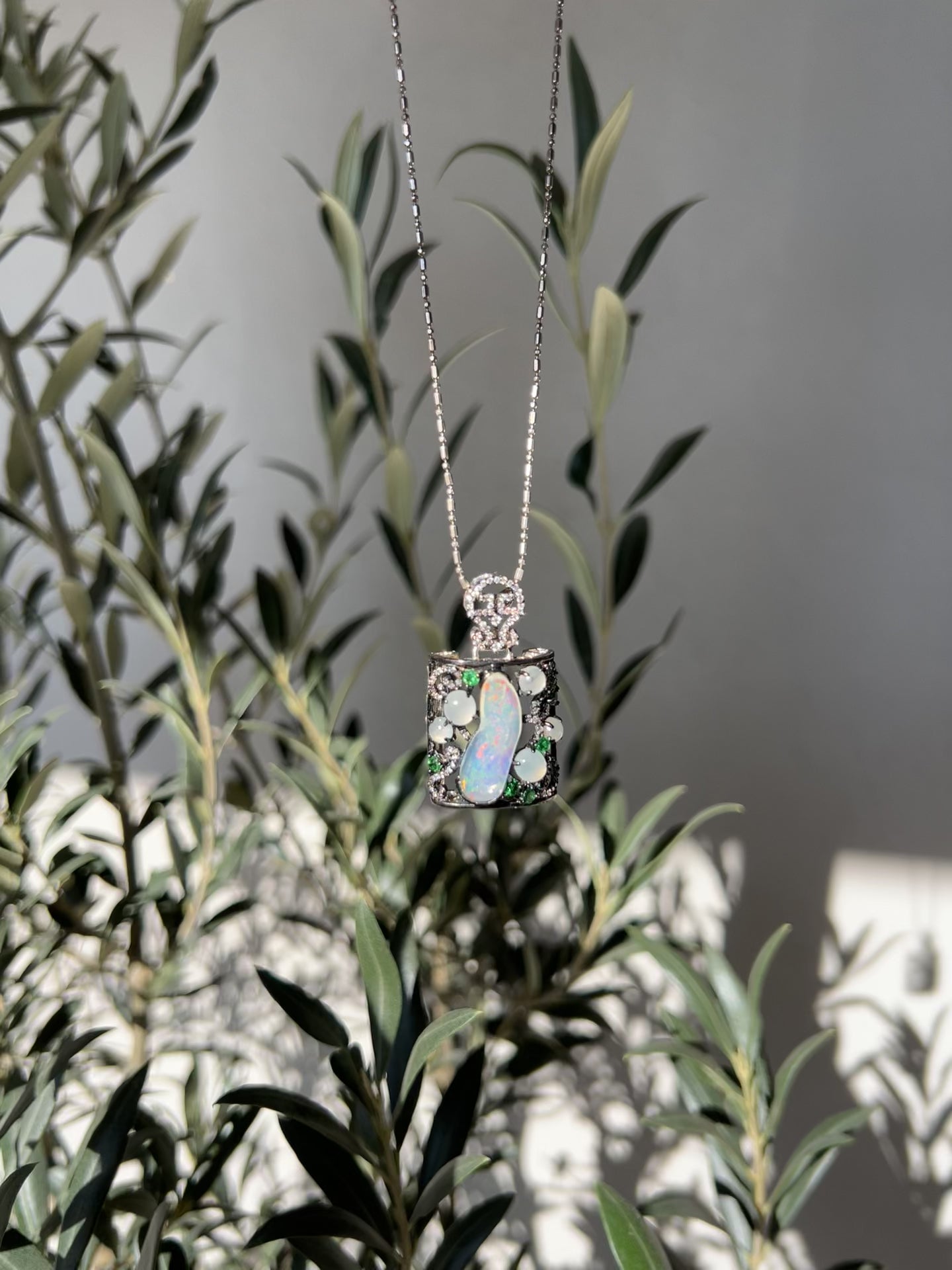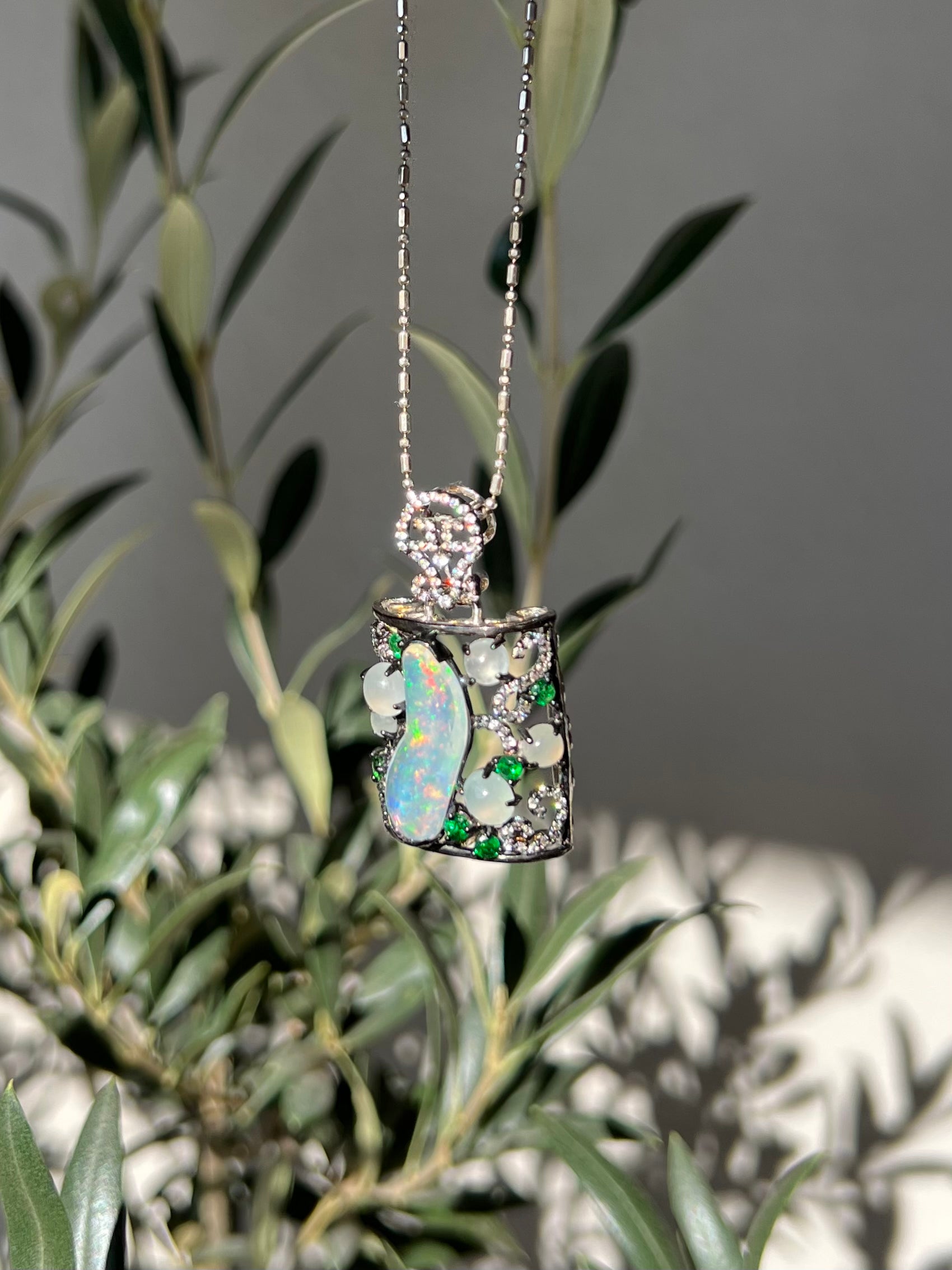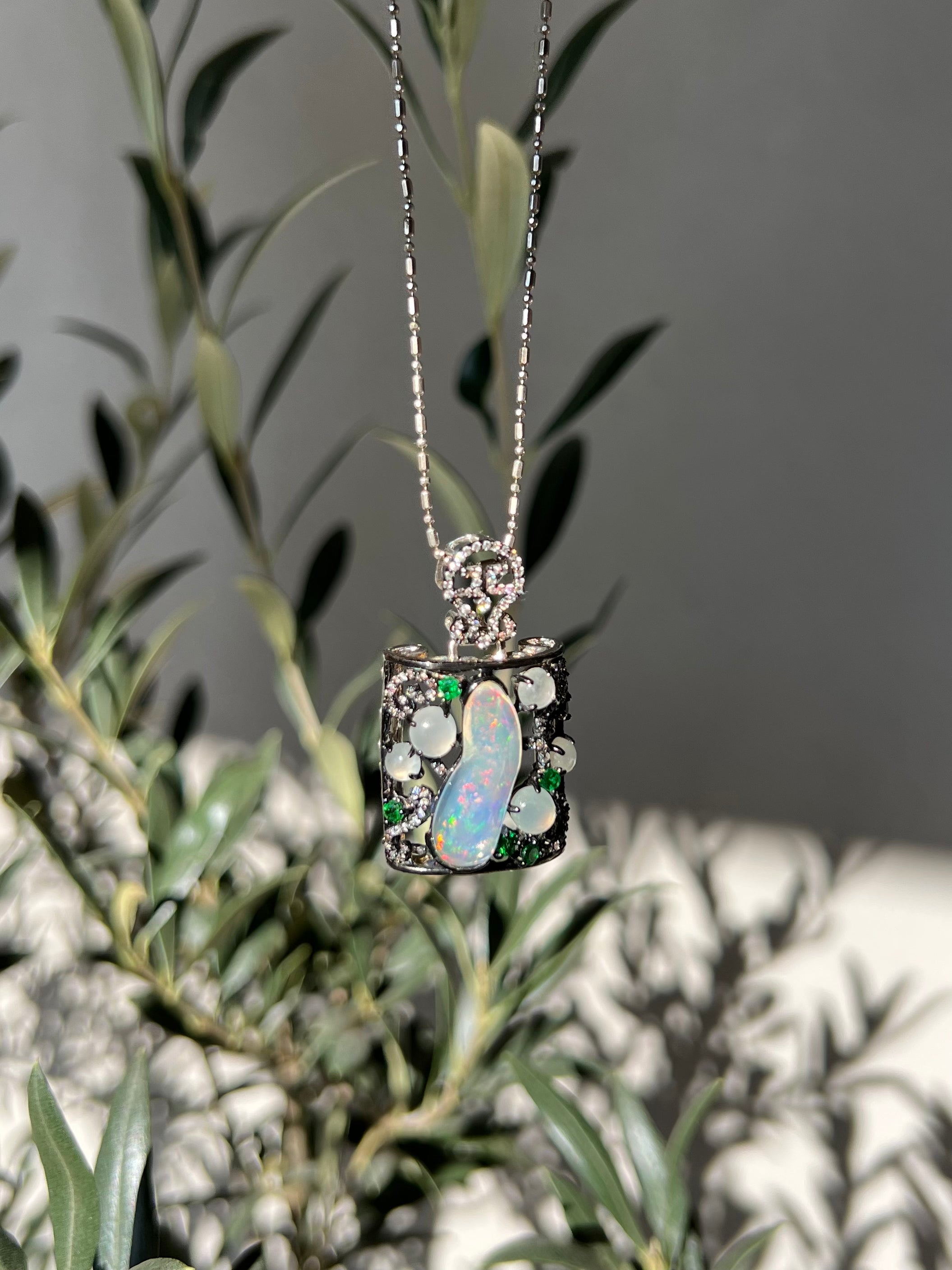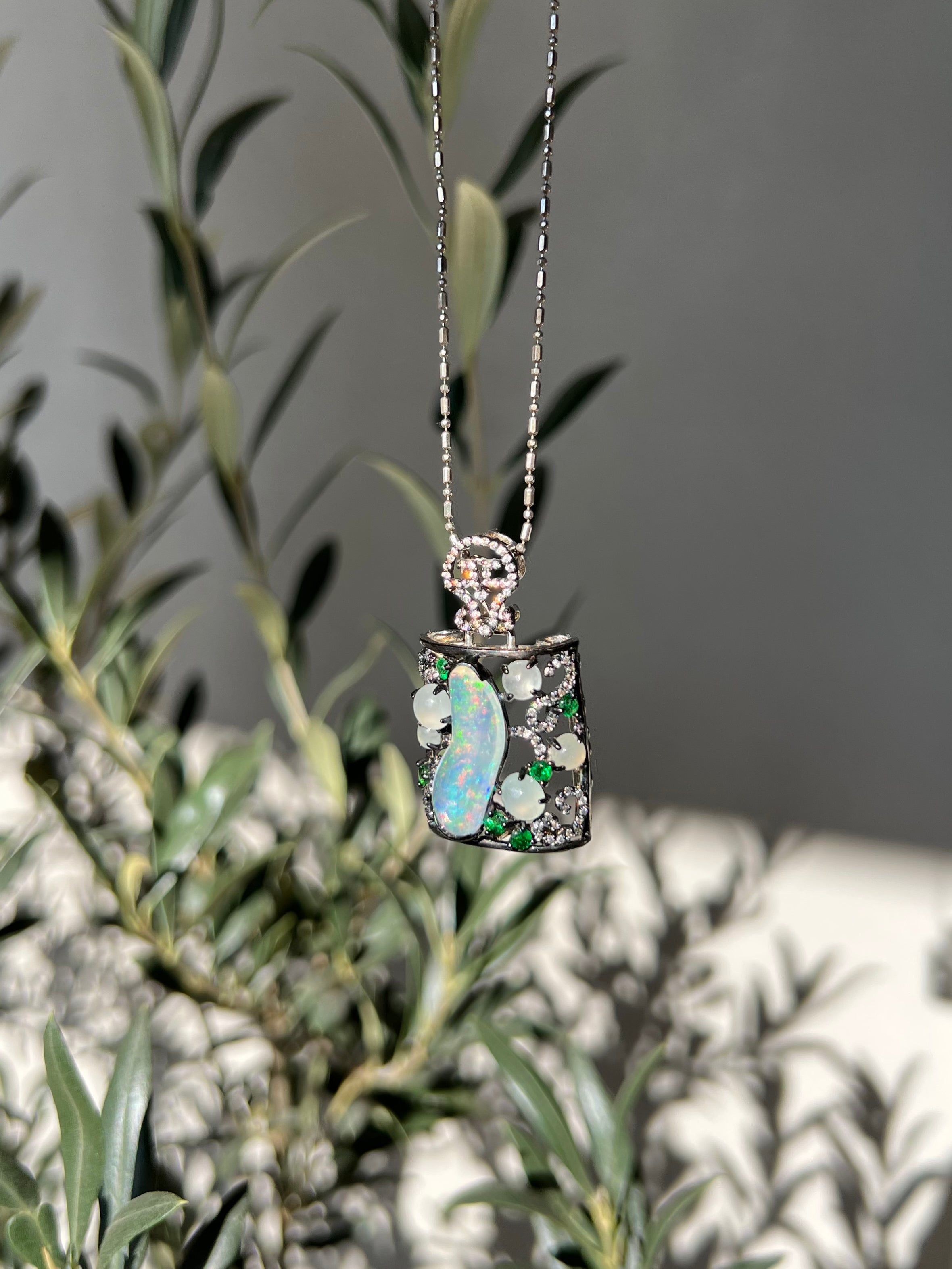 A mysterious antique perfume bottle design featuring a lively free-form Ethiopian opal, adorned with bubbles made from white jadeites and chrome diopsides. Perfect for collectors, this piece can be worn on any occasion, adding a touch of elegance and intrigue to any ensemble.