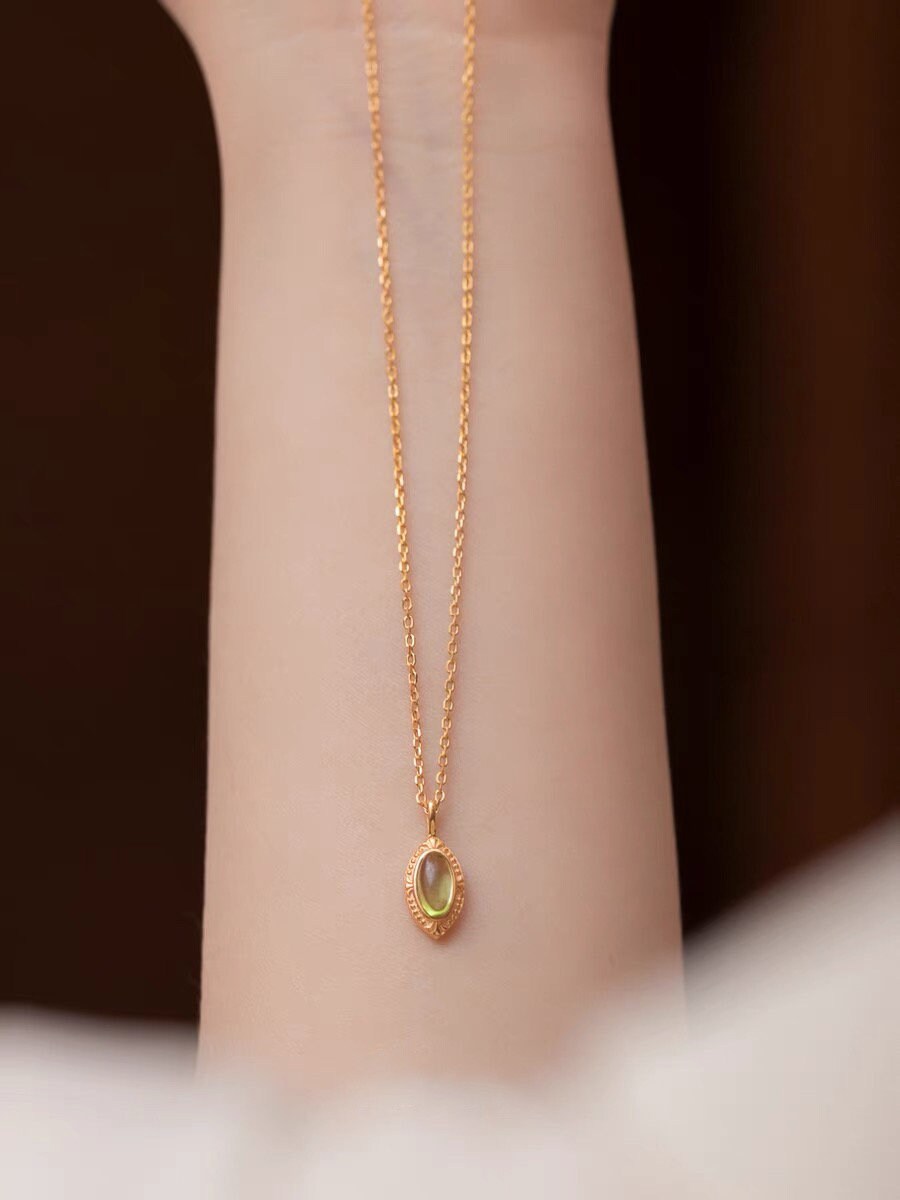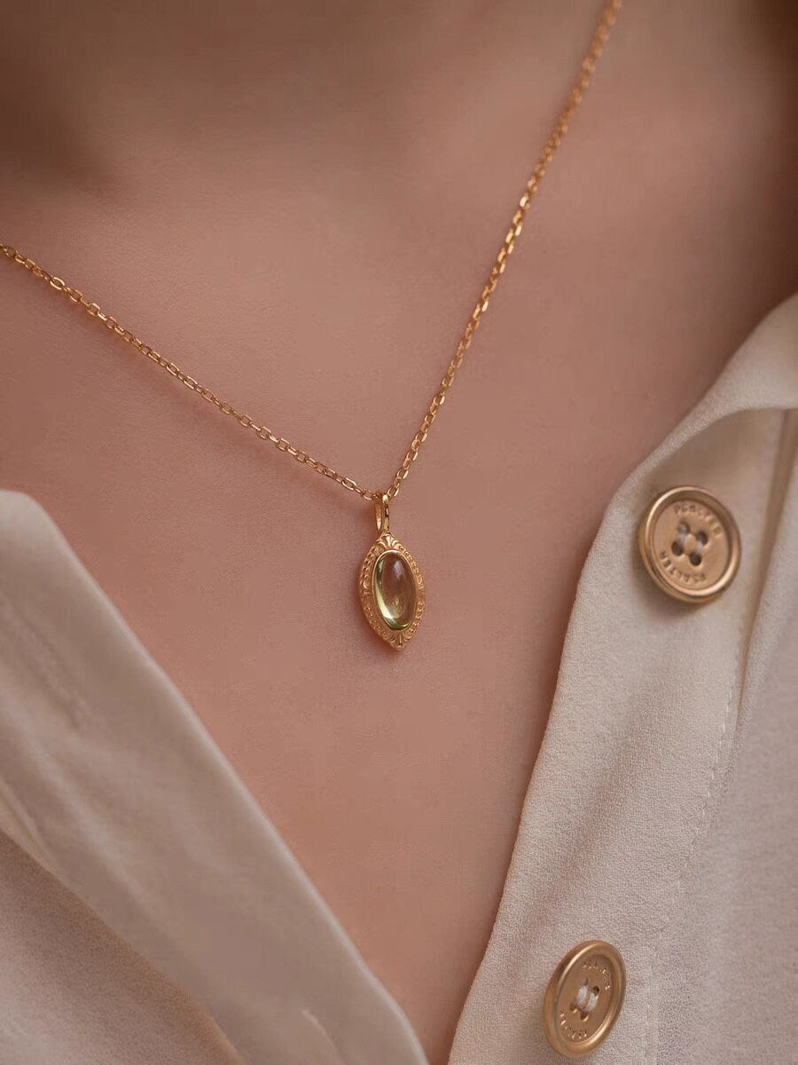 Timeless piece that seamlessly blends elegance with nature's beauty. Crafted with precision, the navette-cut peridot gemstone takes center stage, set in a lustrous 14k gold-filled pendant. The vibrant green hues of the peridot are accentuated by the delicate design, making it a versatile accessory for any occasion. Elevate your style with this refined necklace that effortlessly captures the essence of sophistication and grace.