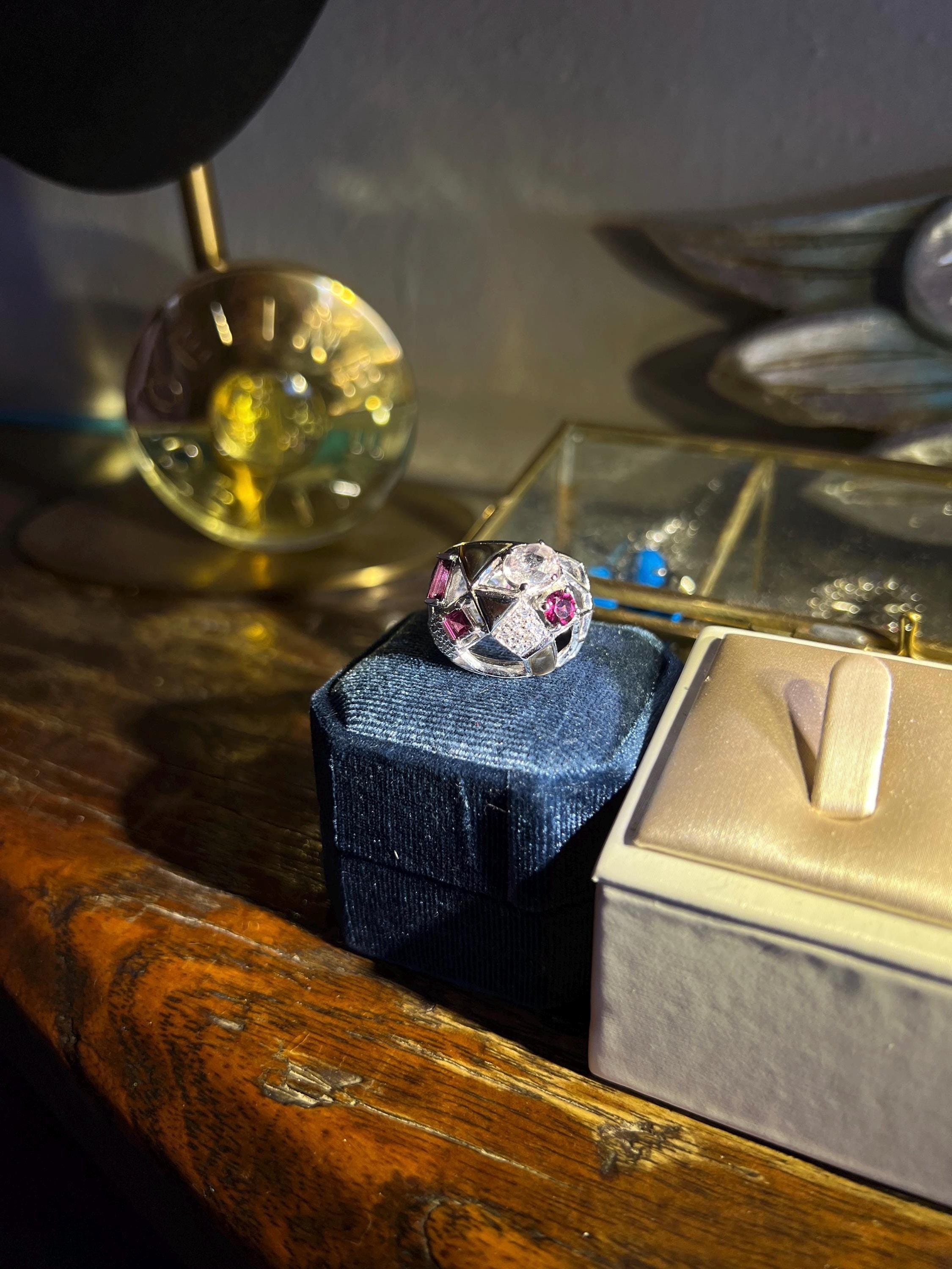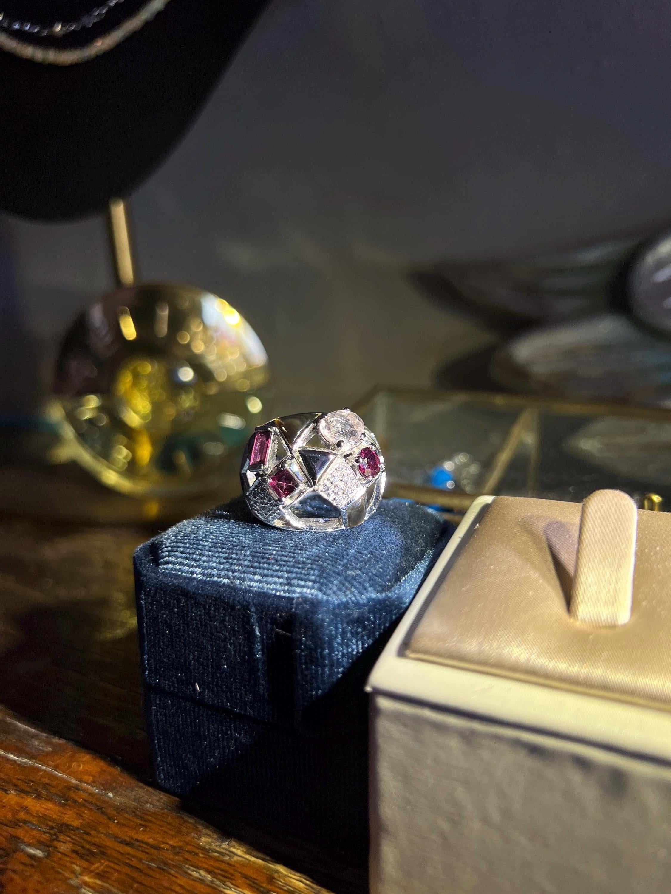 A truly one-of-a-kind cocktail ring designed with a poetic balance of contrast and harmony—it’s made with a soft blush 1.2 carat morganite, 1.3 carats different shapes of rubellite tourmaline, delicate black mother of pearl, and glinting white sapphires hidden like stars across the piece. The textures and colors come together in an abstract sculptural composition —you’ll find something new in it every time you look.