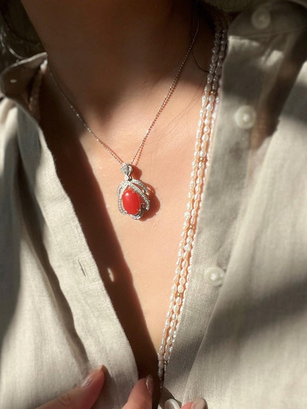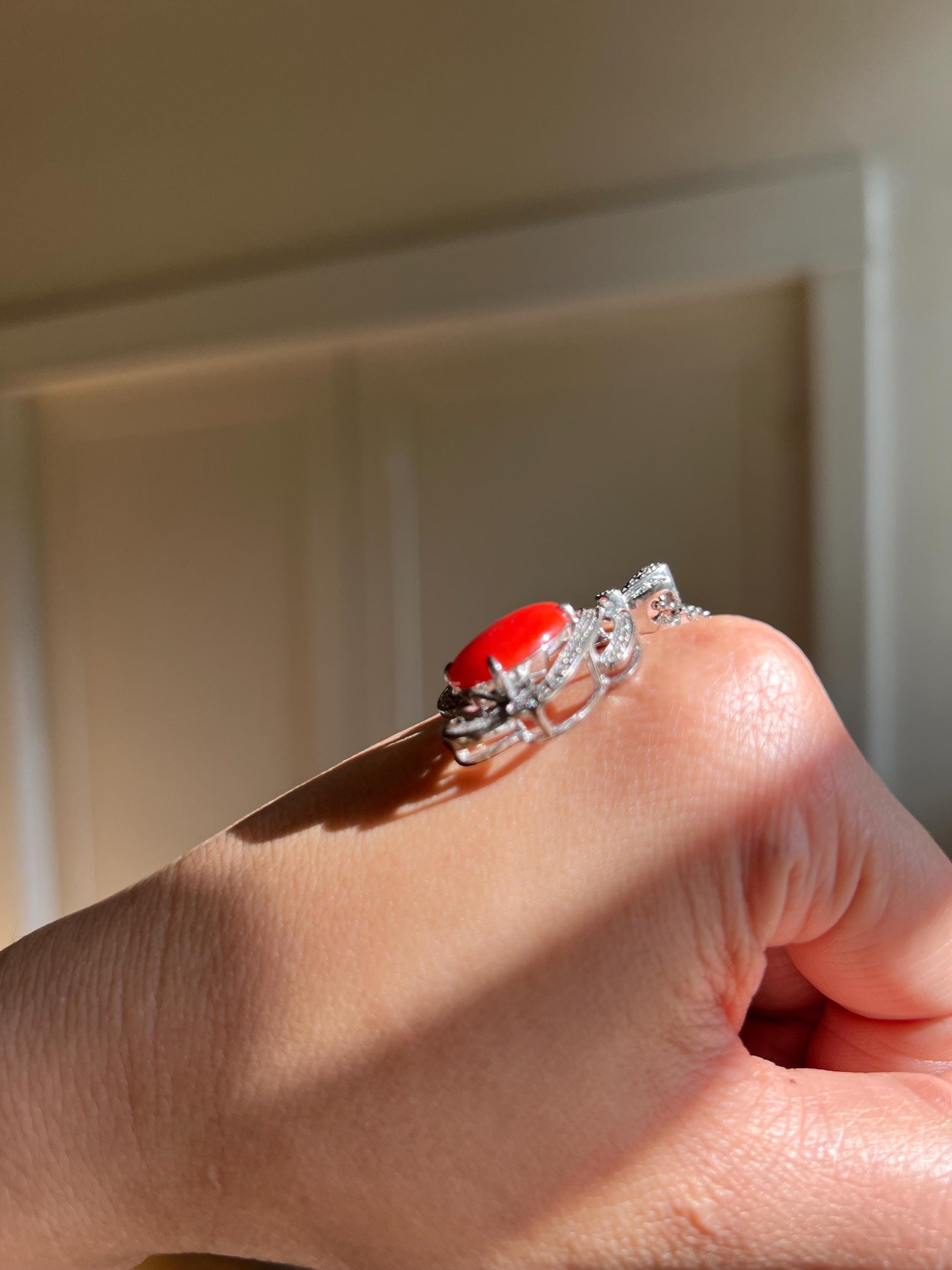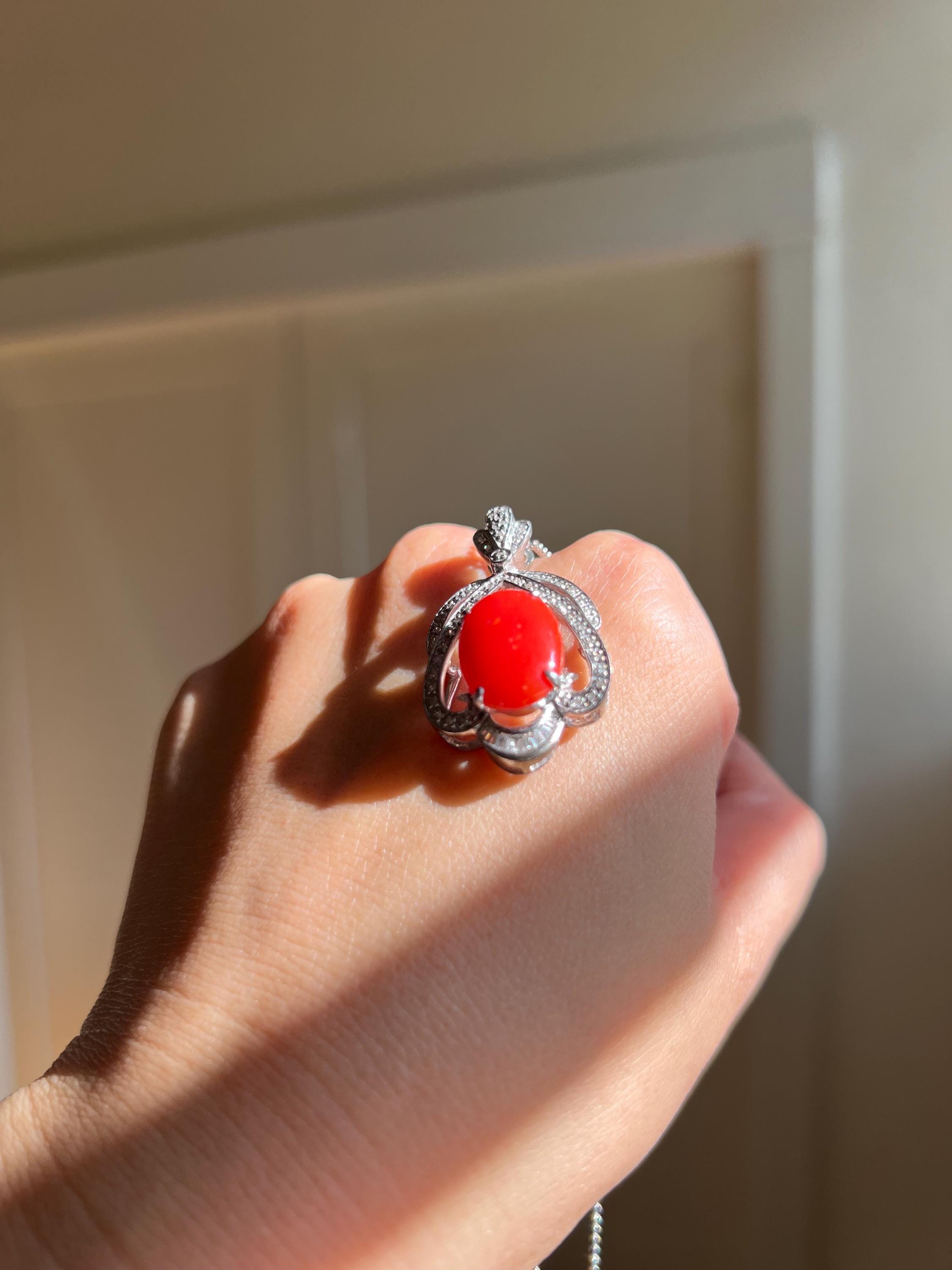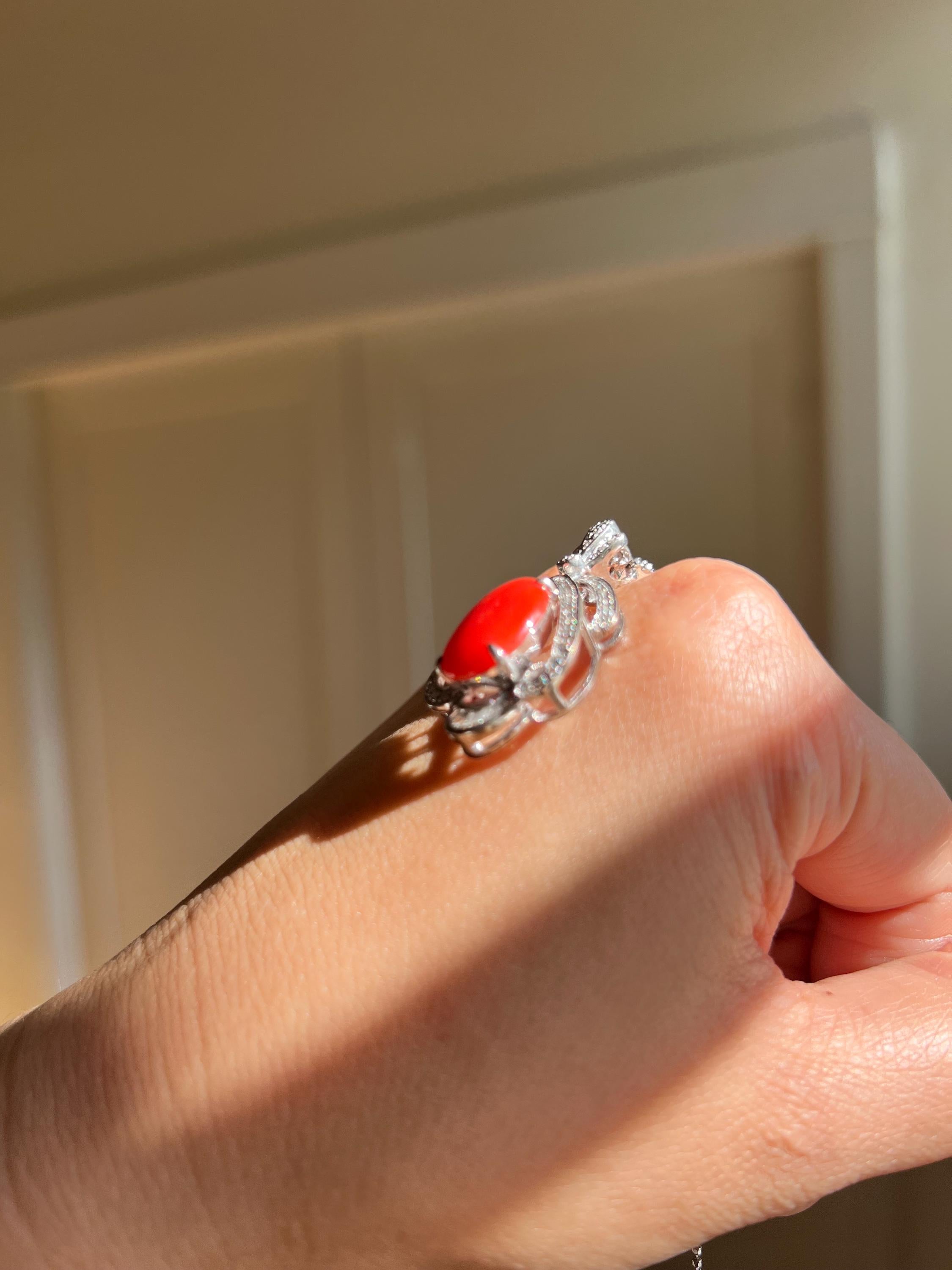 The rich coral is an oval cabochon, warm and glowing like ember-light. It’s wrapped in a layered setting of pavé-set diamonds (natural, SI clarity), forming a heart-like silhouette—open, elegant, and strong.