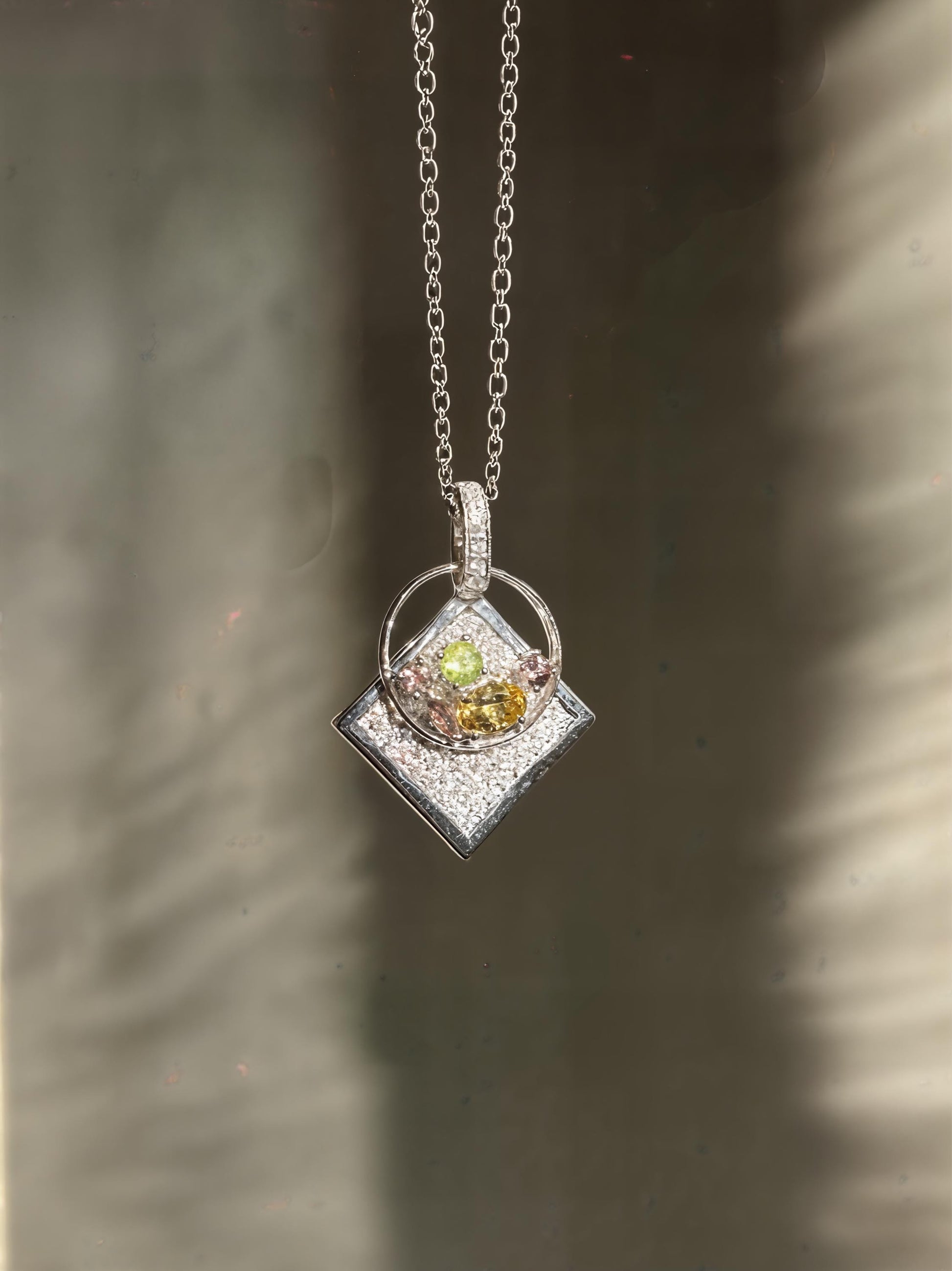 All stones are nestled within an artful modern silhouette: a floating circular frame atop a diamond-shaped foundation, balancing geometry with organic gemstone forms.