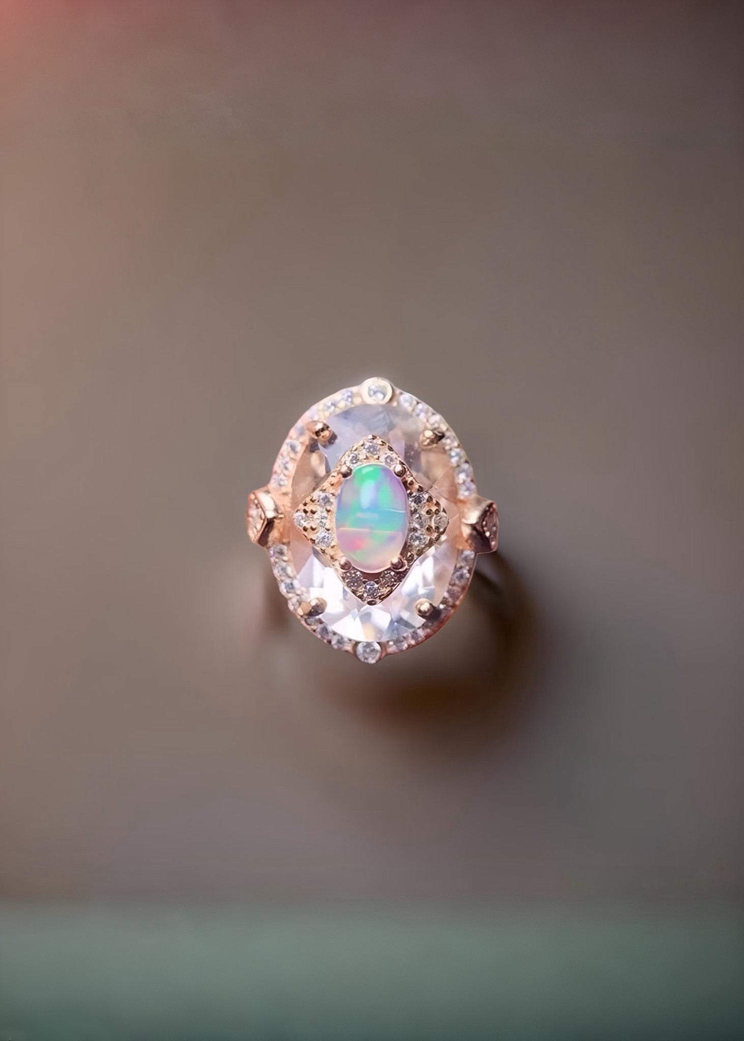 Opal and Clear Quartz Rose Gold Art Deco Ring