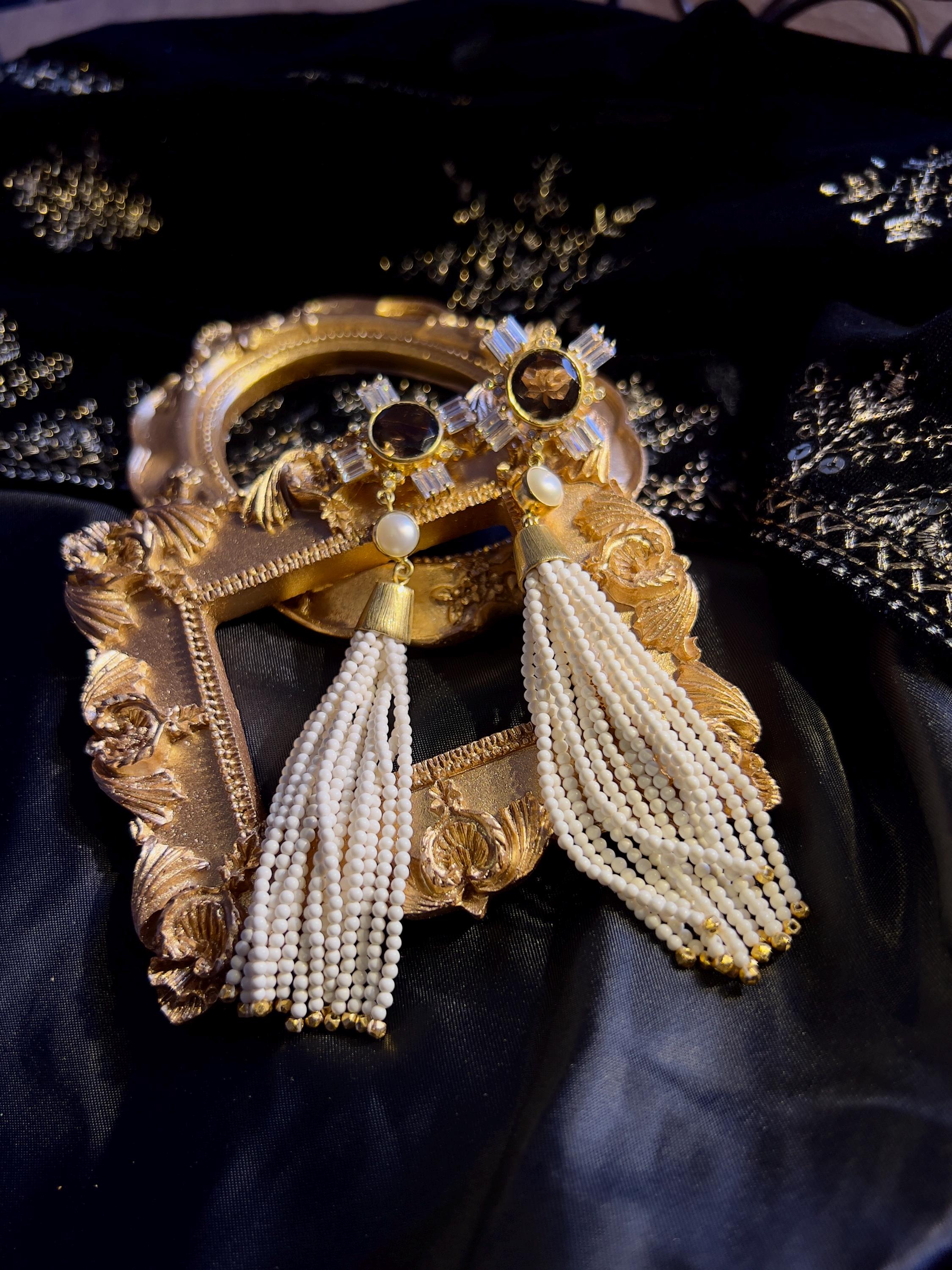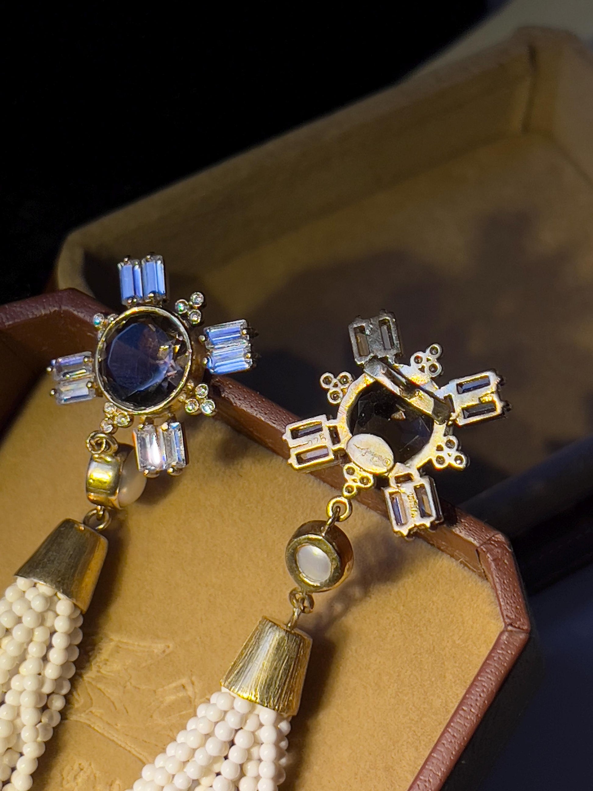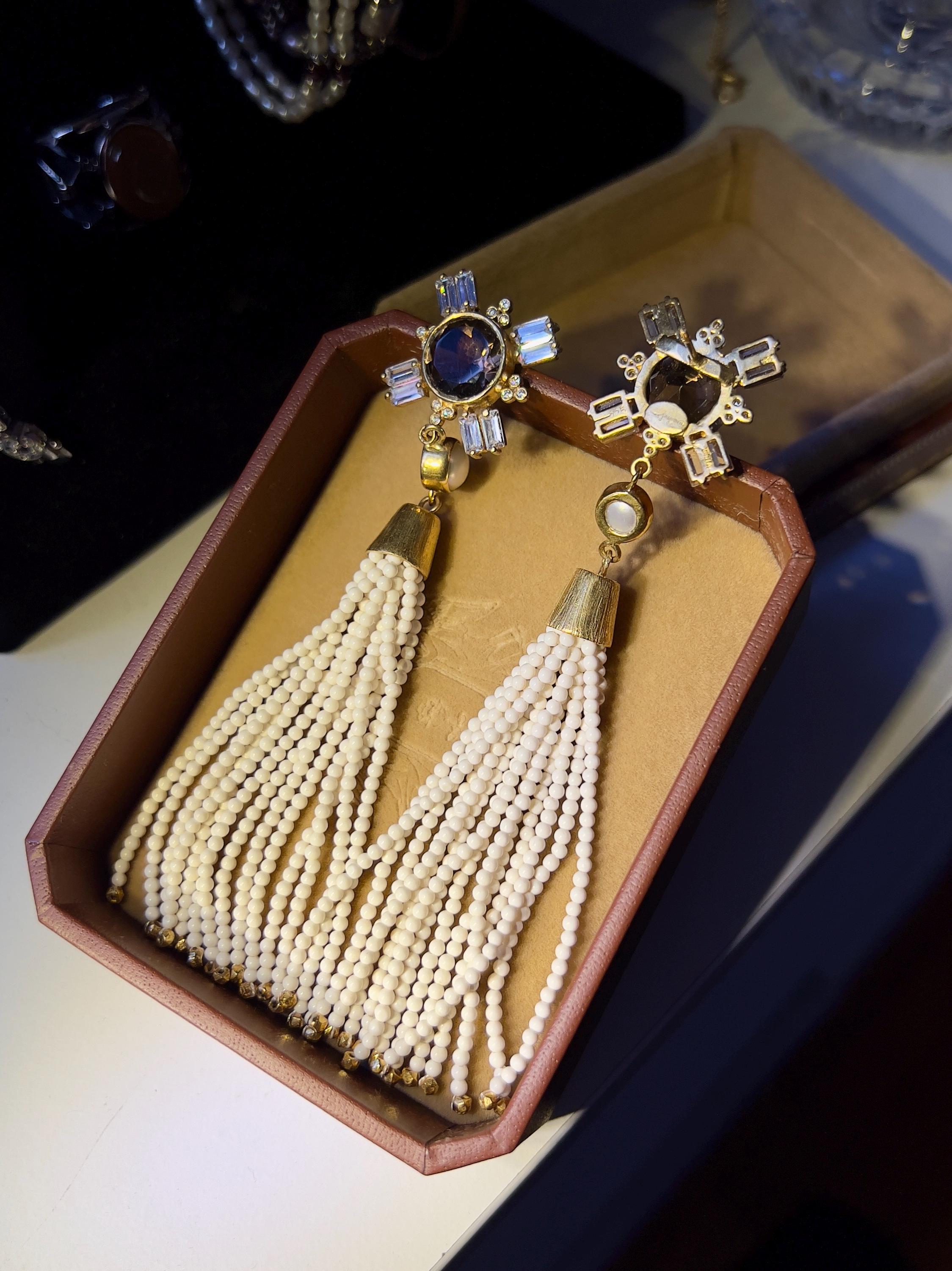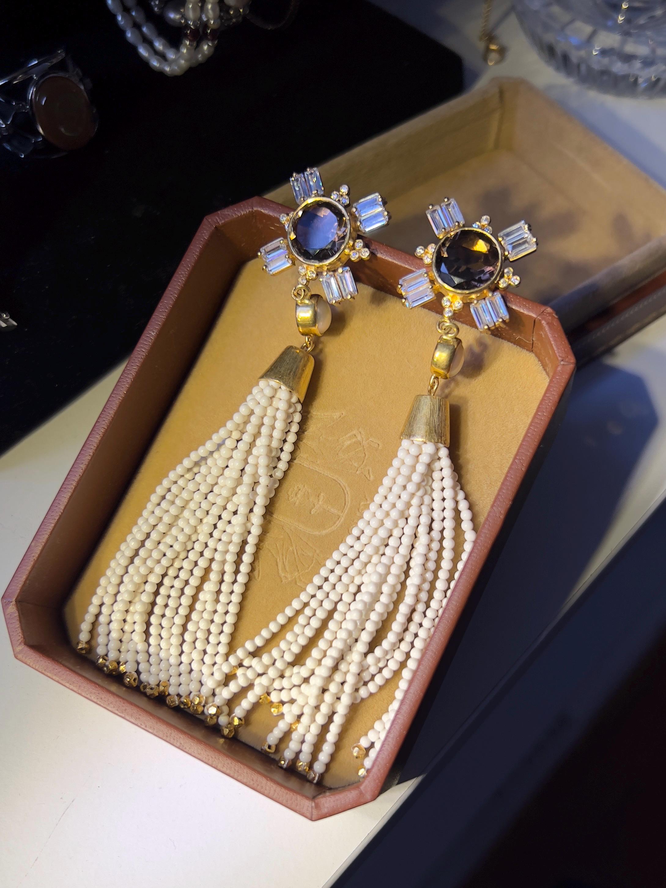 Smoky Quartz and Pearl with White Coral Beads Tassel 18k Gold Earrings