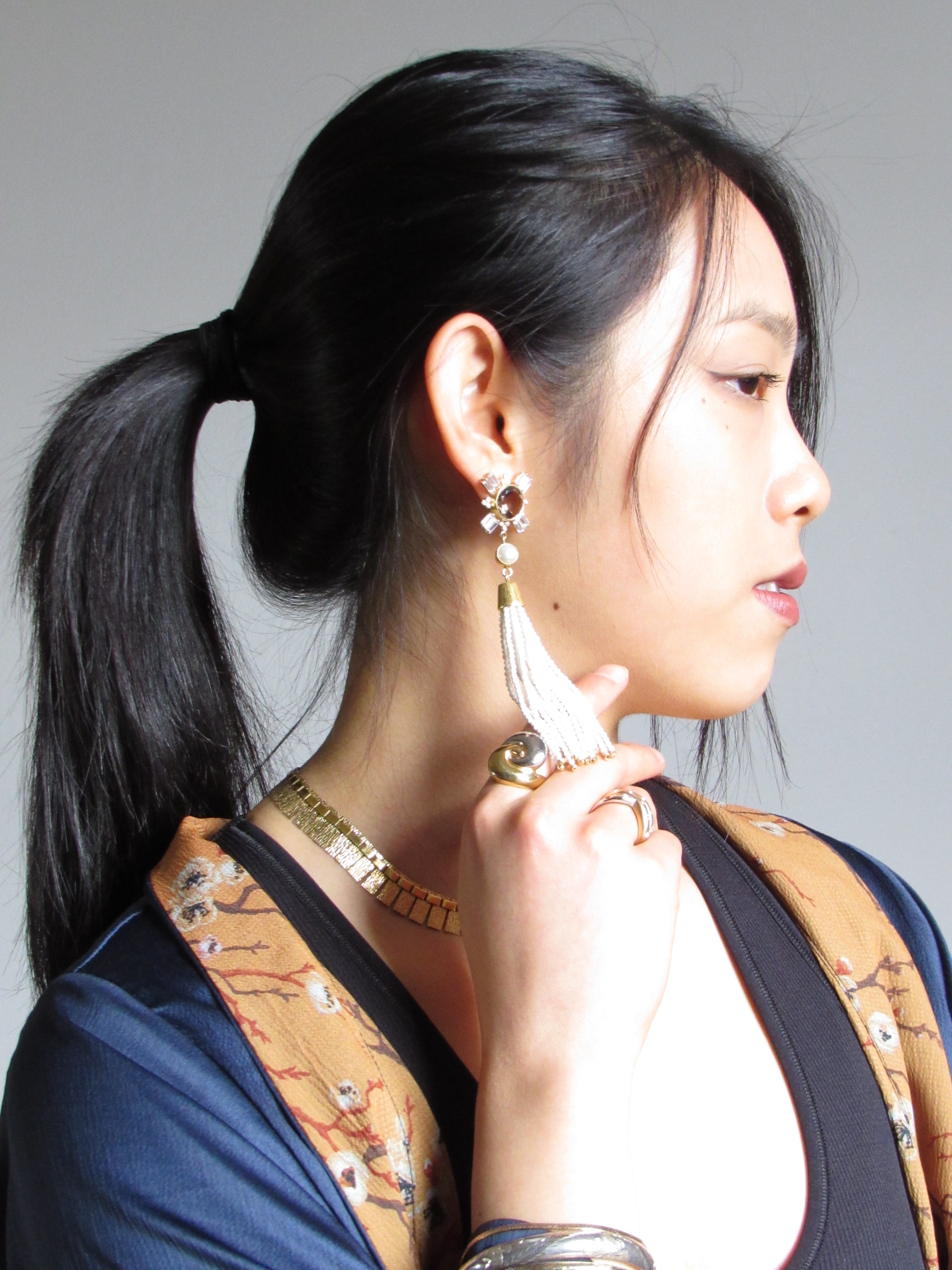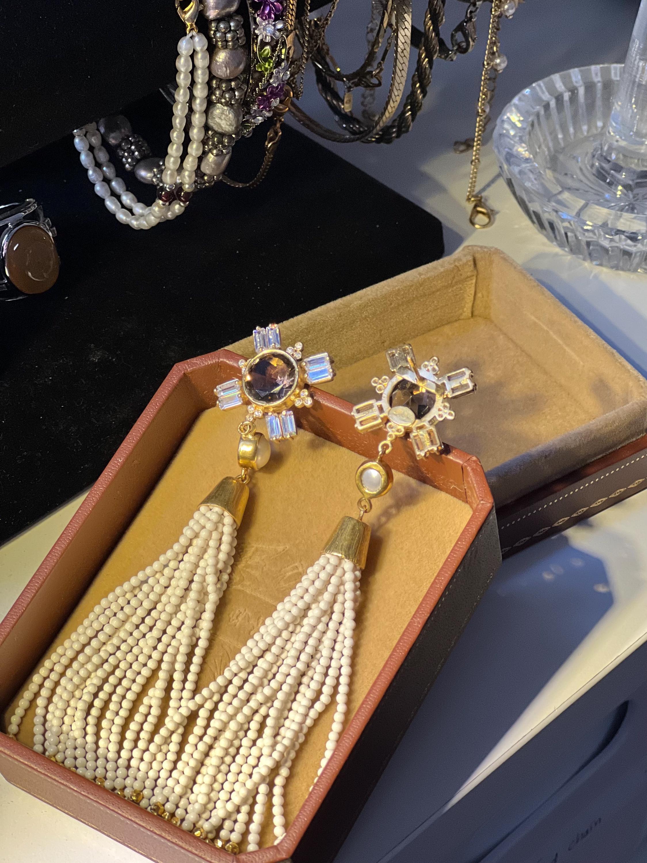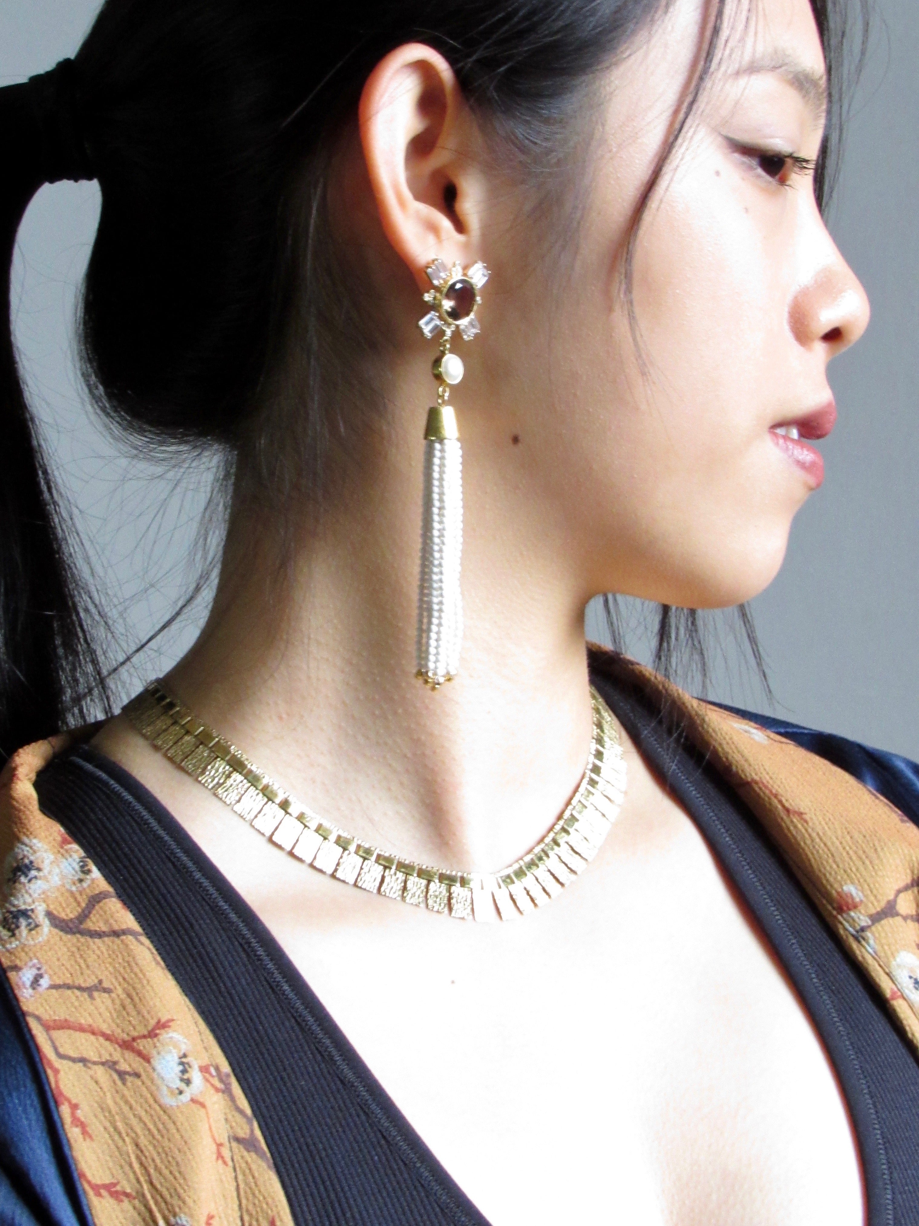 Materials: 18K Gold Vermeil• Stones: Smoky Quartz, Pearls, Coral Beads, Zircons (not zirconias)• Length: 4.25”• Width: 0.75”• Closure: Post-back• Style: Vintage-inspired, statement piece