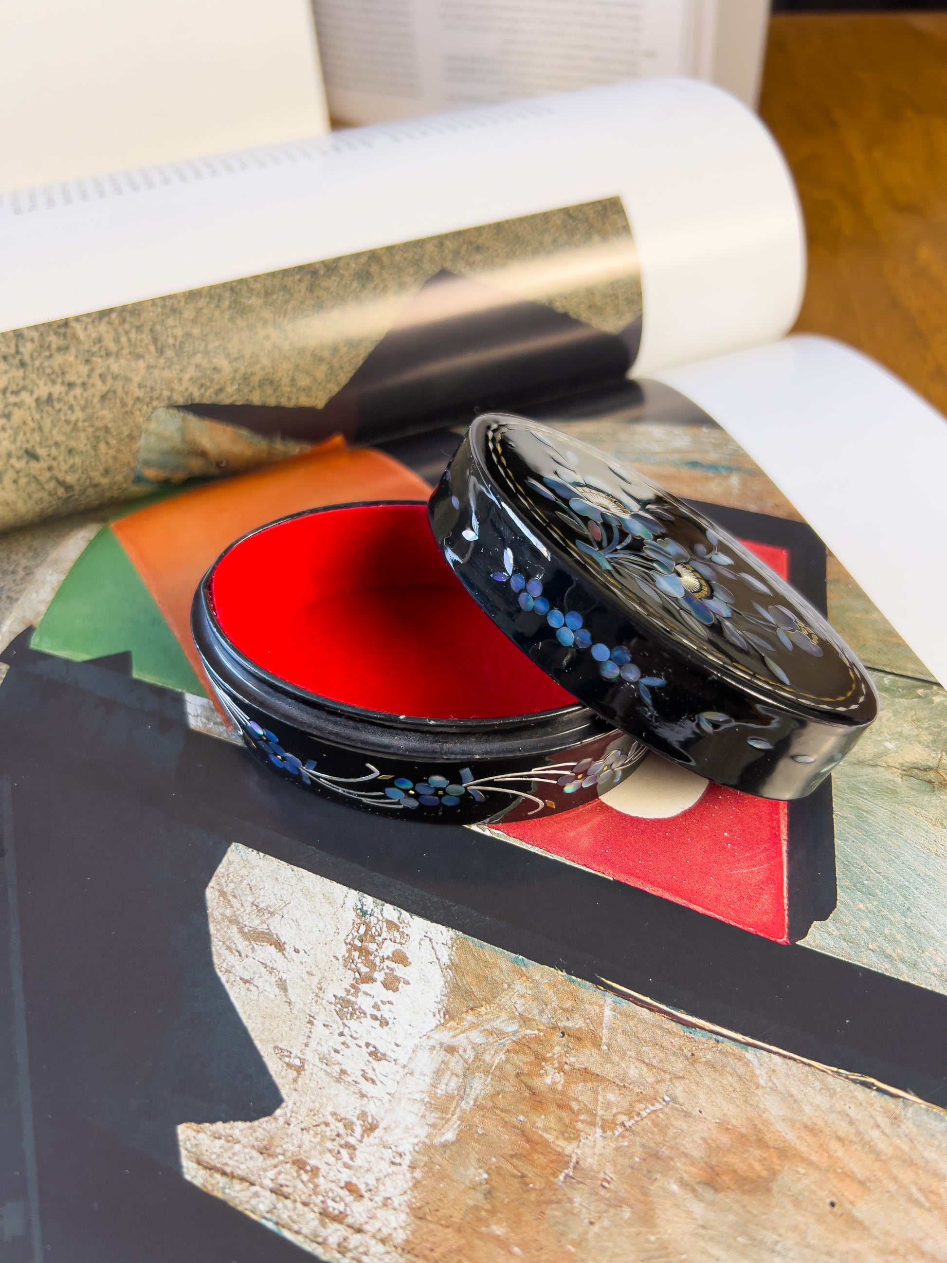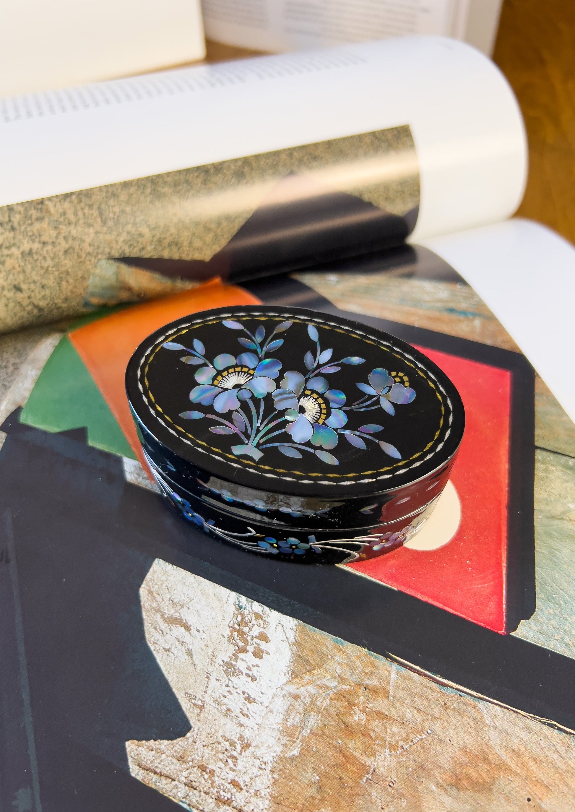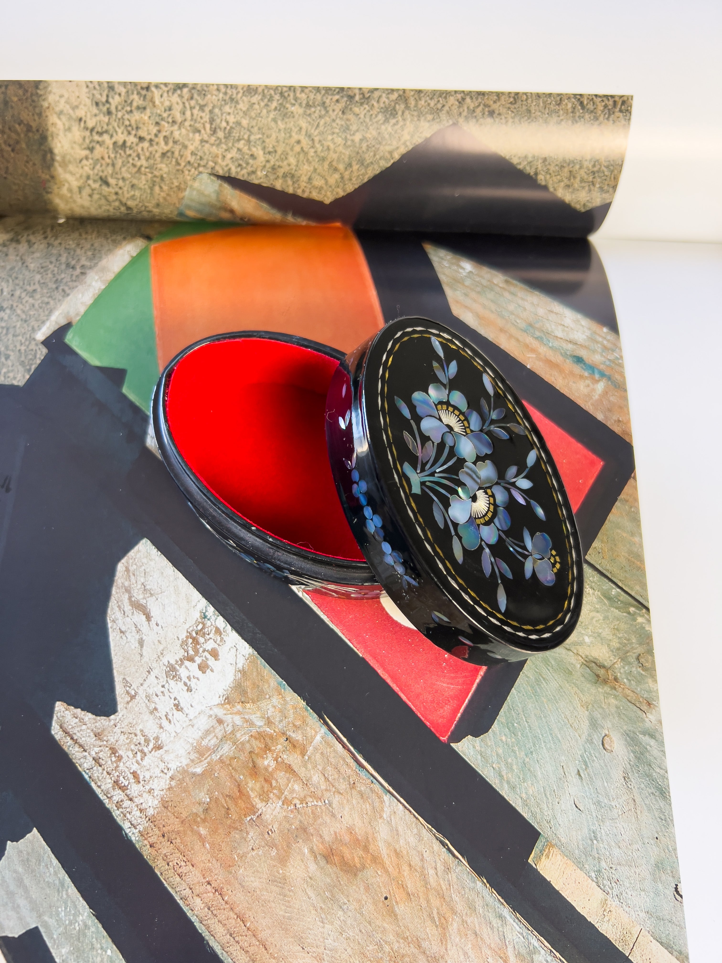 This exquisite small jewelry box perfect for storing your precious items. Handcrafted from walnut wood and embellished with mother of pearl and black lacquered accents, this 3.5" x 2.25" x 1.5" box is sure to become an elegant addition to any jewelry collection.