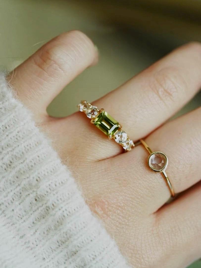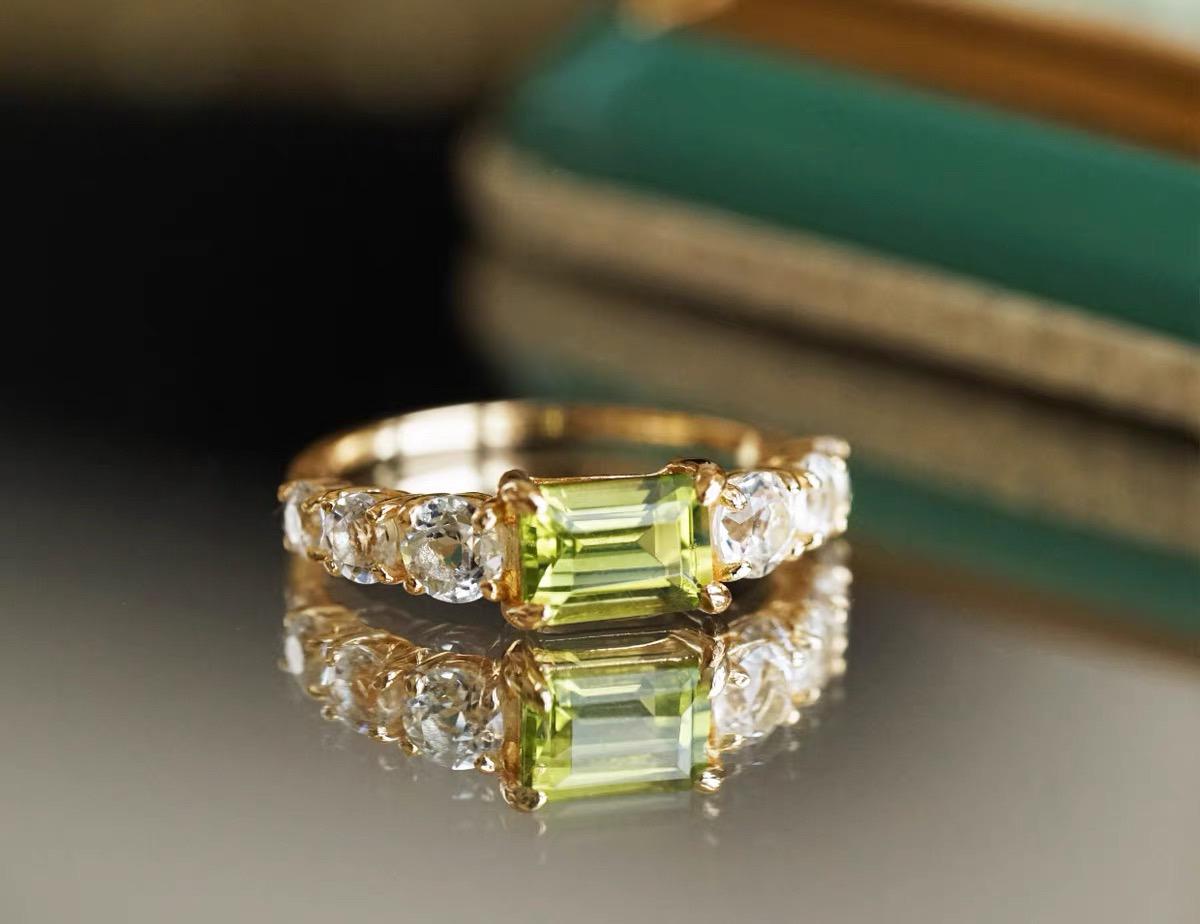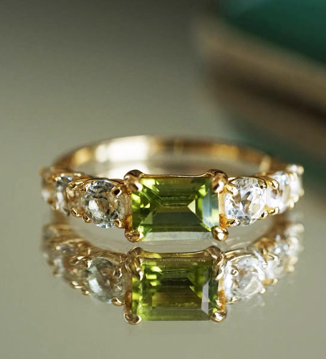 This ring is such a beautiful piece! The stunning natural peridot is the perfect pop of color, framed by sparkling white topaz stones that catch the light with every move. The vibrant green of the peridot adds a fresh, elegant touch to any outfit, whether you're dressing up or wearing it daily.