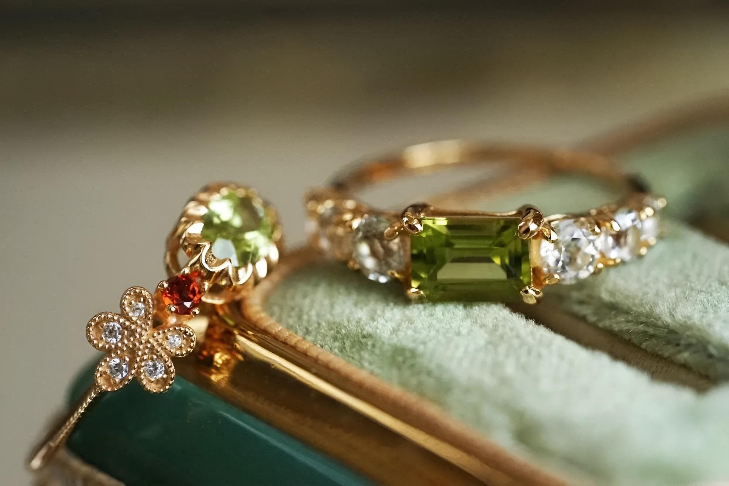 Peridot and White Topaz 14K Gold Ring – Natural Gemstone Vintage-Inspired Ring