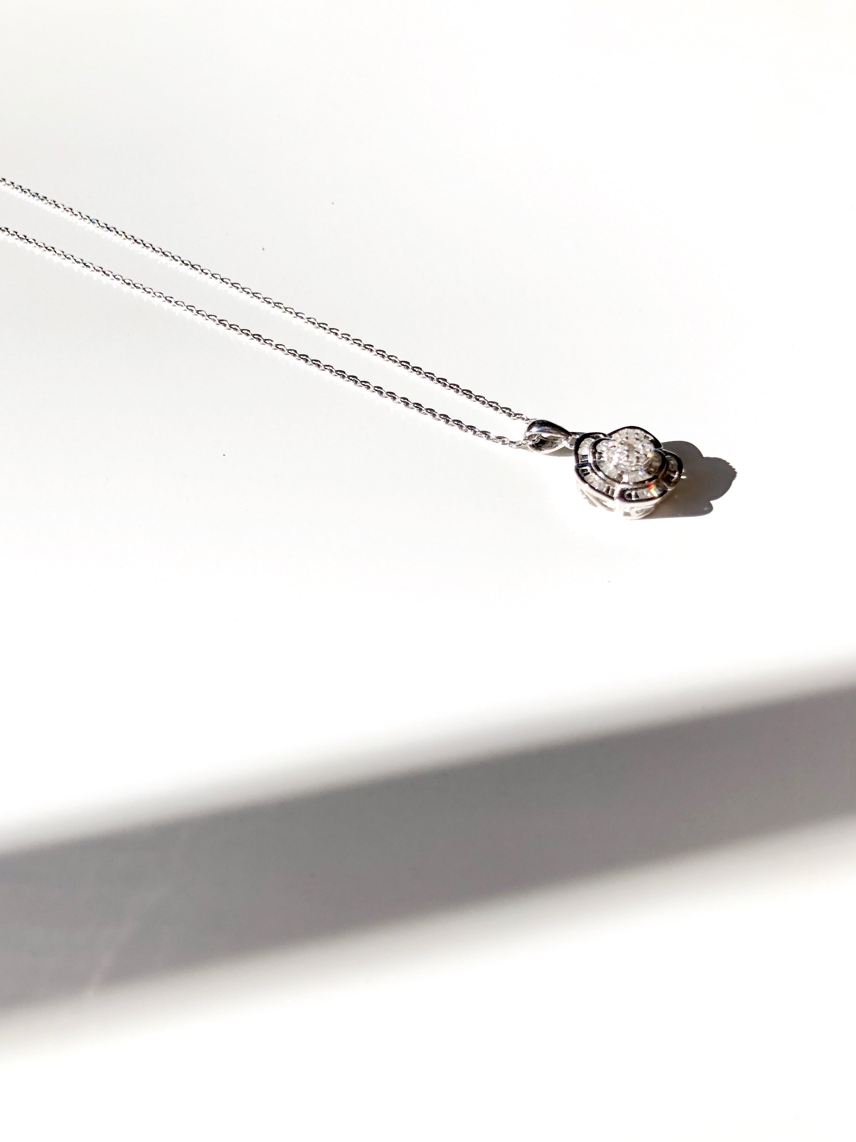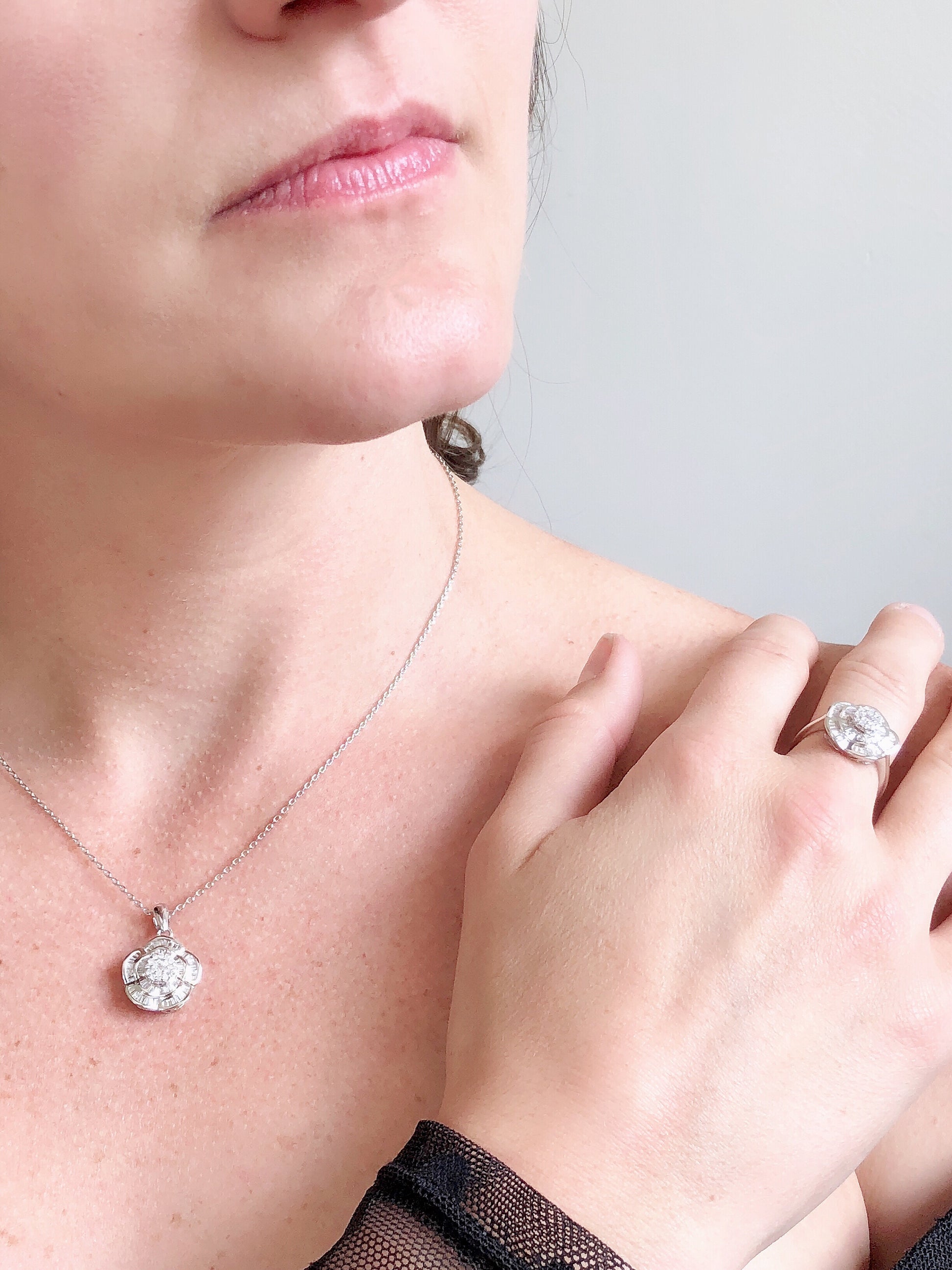 This lightweight necklace offers an everyday luxury feel, featuring a floral pendant adorned with hand-set white diamonds, bar-set diamond baguettes, and pavé diamonds.
