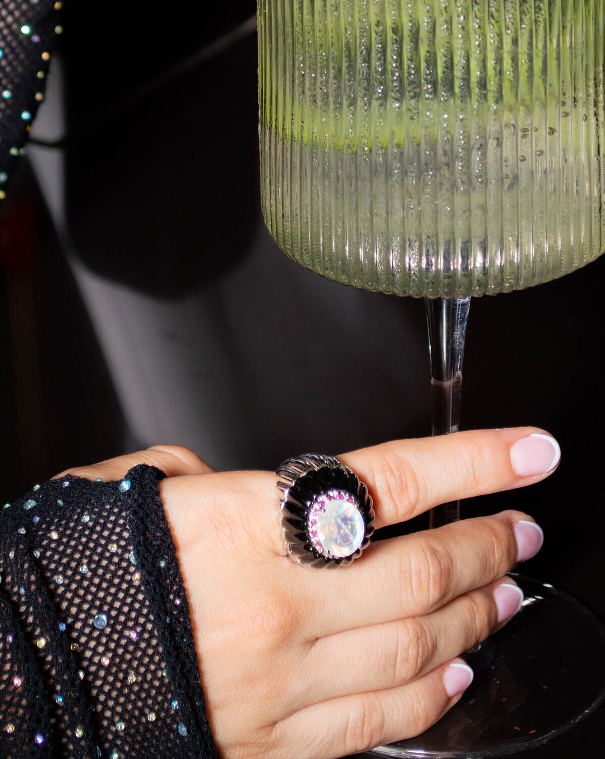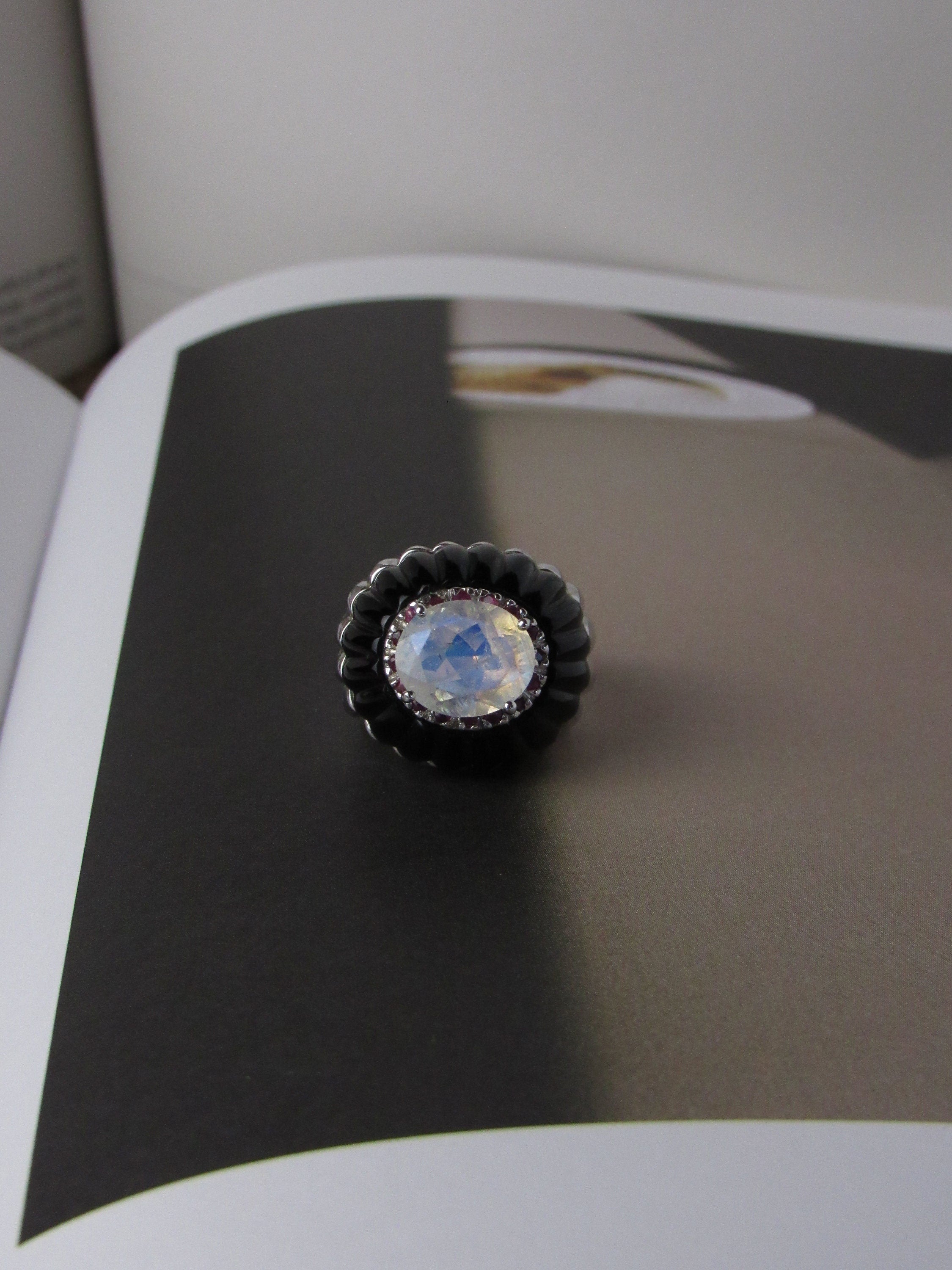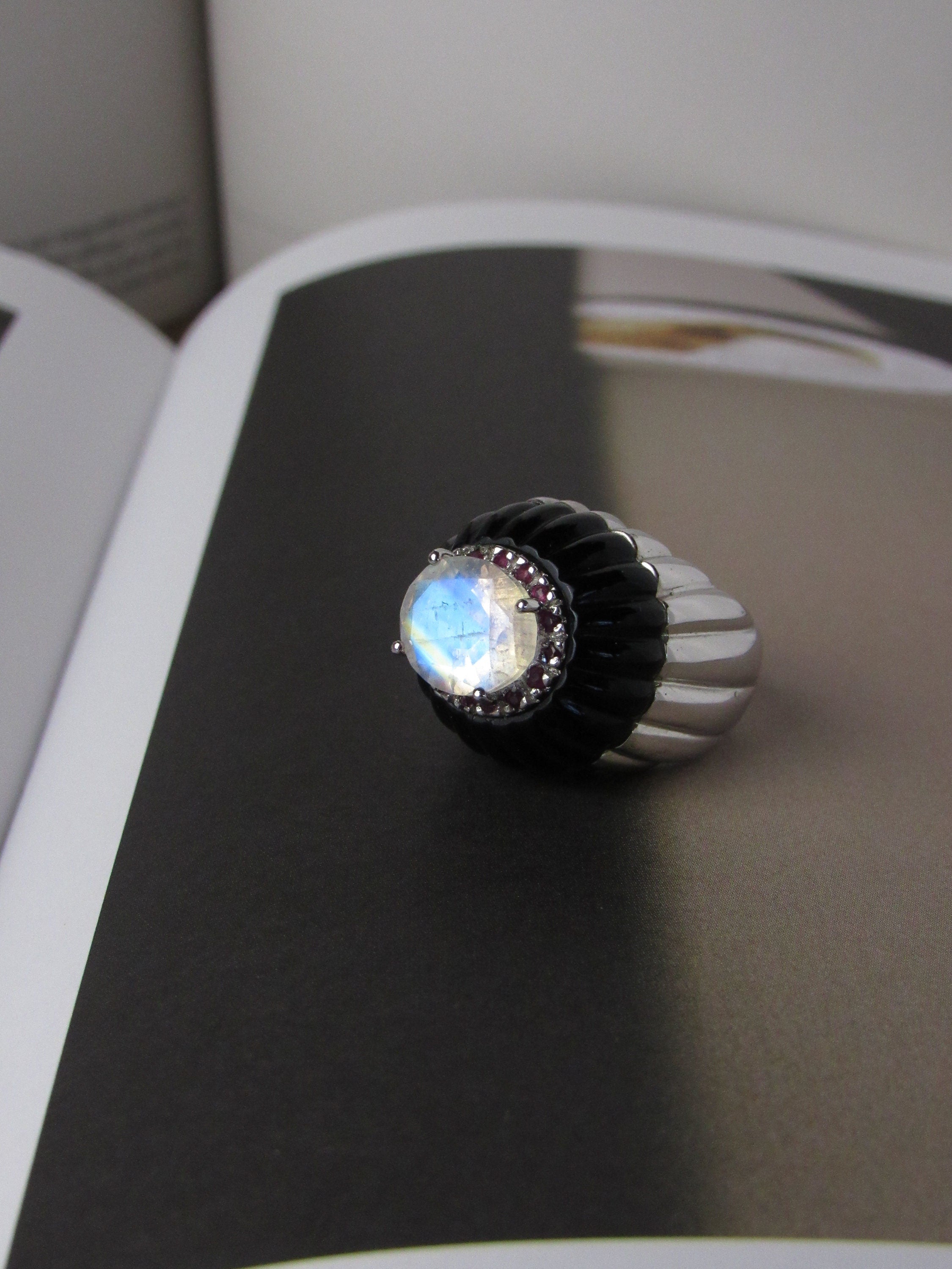 This breathtaking statement ring showcases a majestic Piatra Dura Deco design Blue Sheen Moonstone and round-cut rubies, all perfectly surrounded by a curvaceous dome of black onyx.