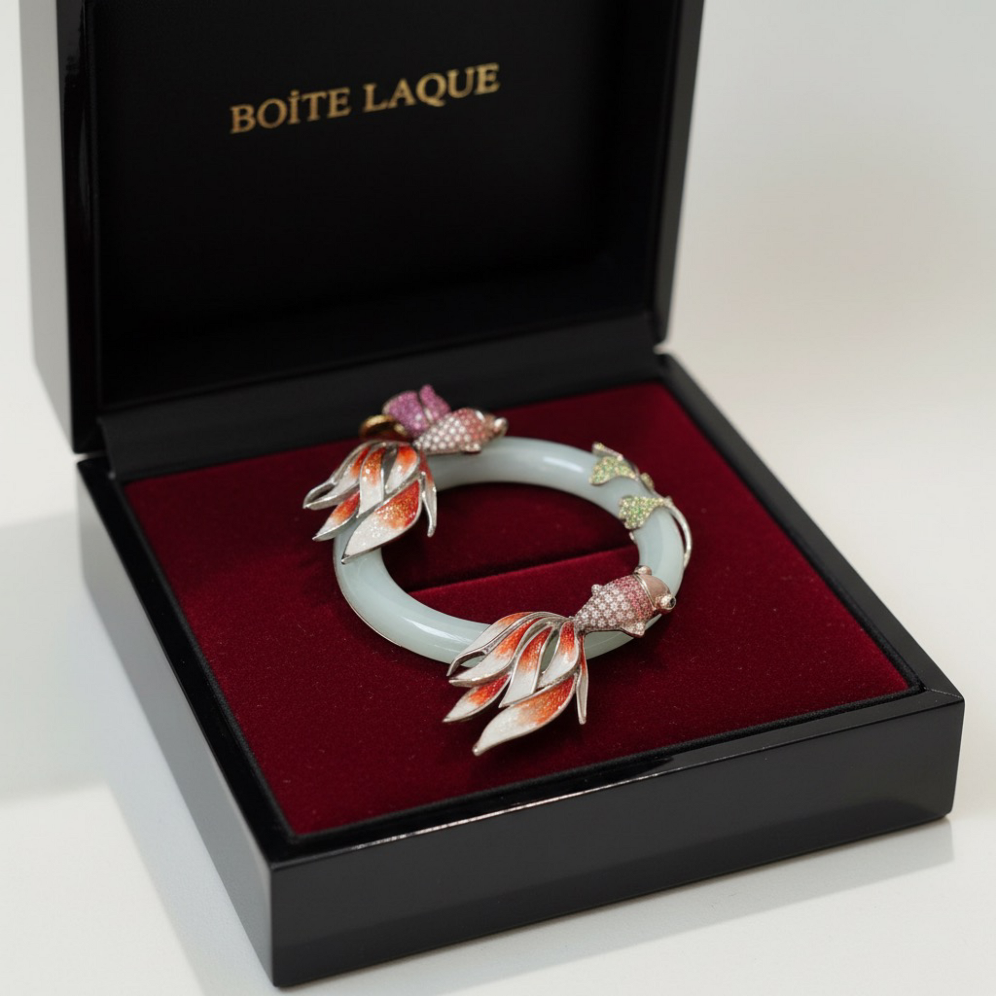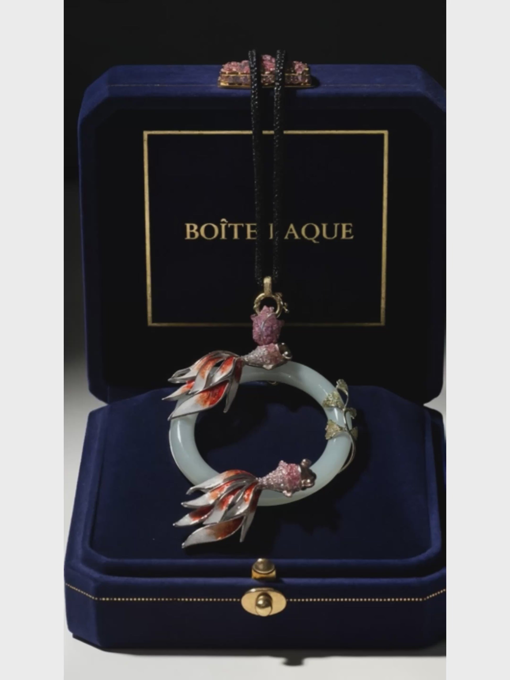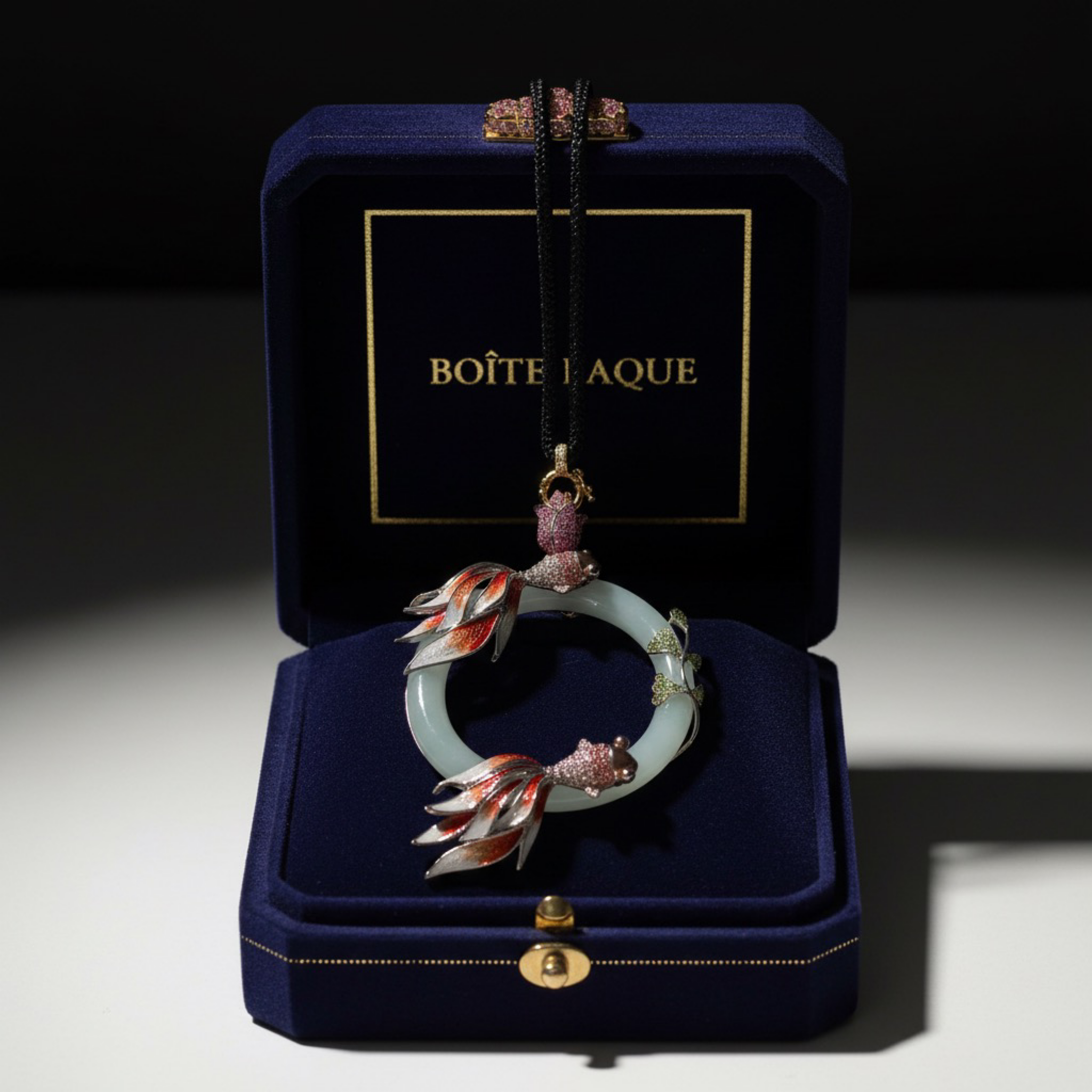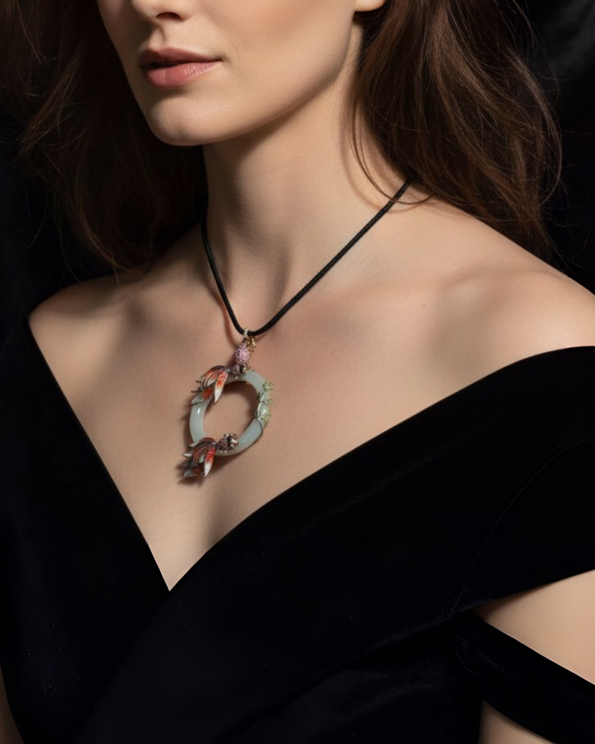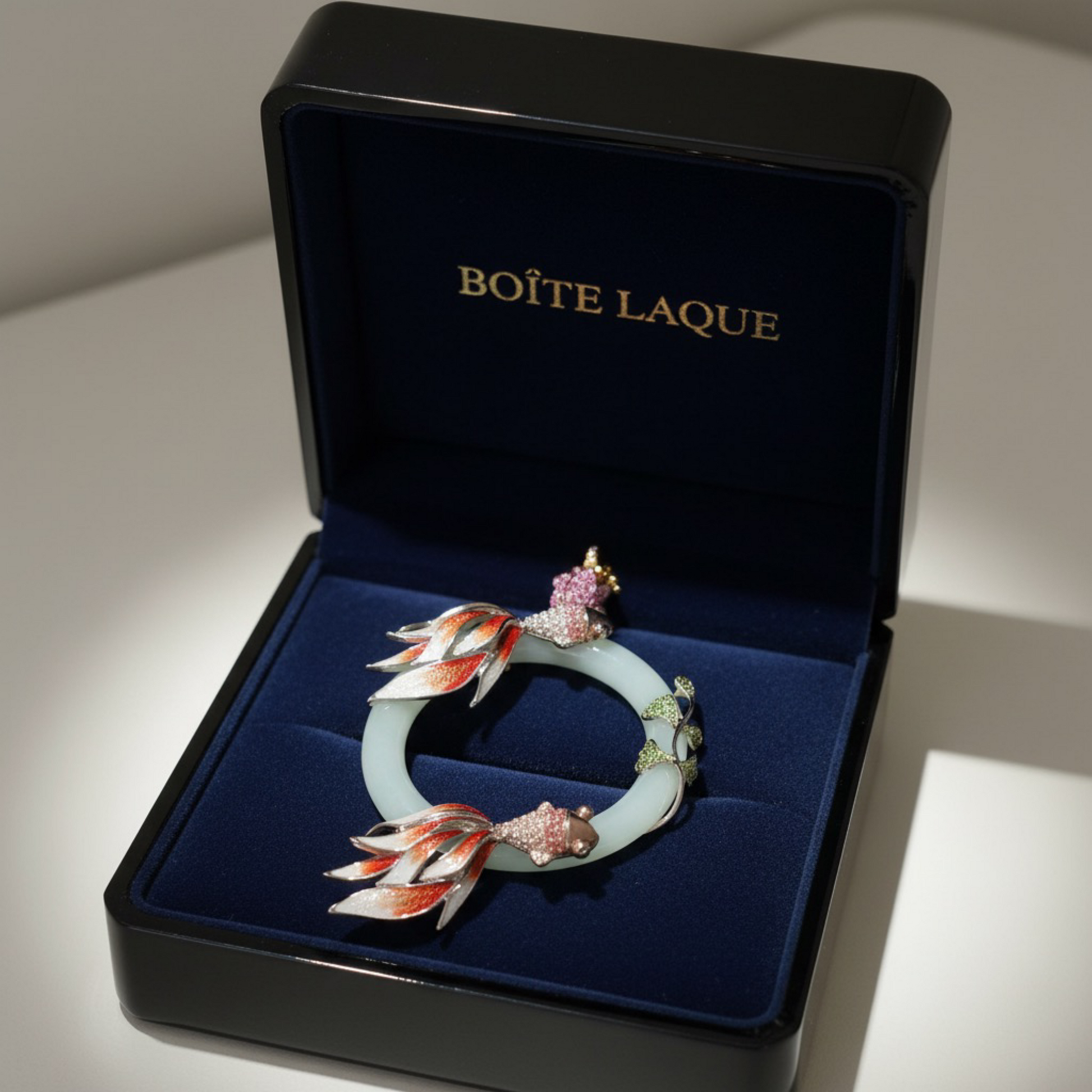 At its center is a natural jadeite jade ring, chosen for its calm translucency and symbolic meaning of continuity and protection. Two sculptural fish move in quiet orbit around the jade, rendered through traditional cloisonné enamel, a heritage technique that demands extreme precision and patience.