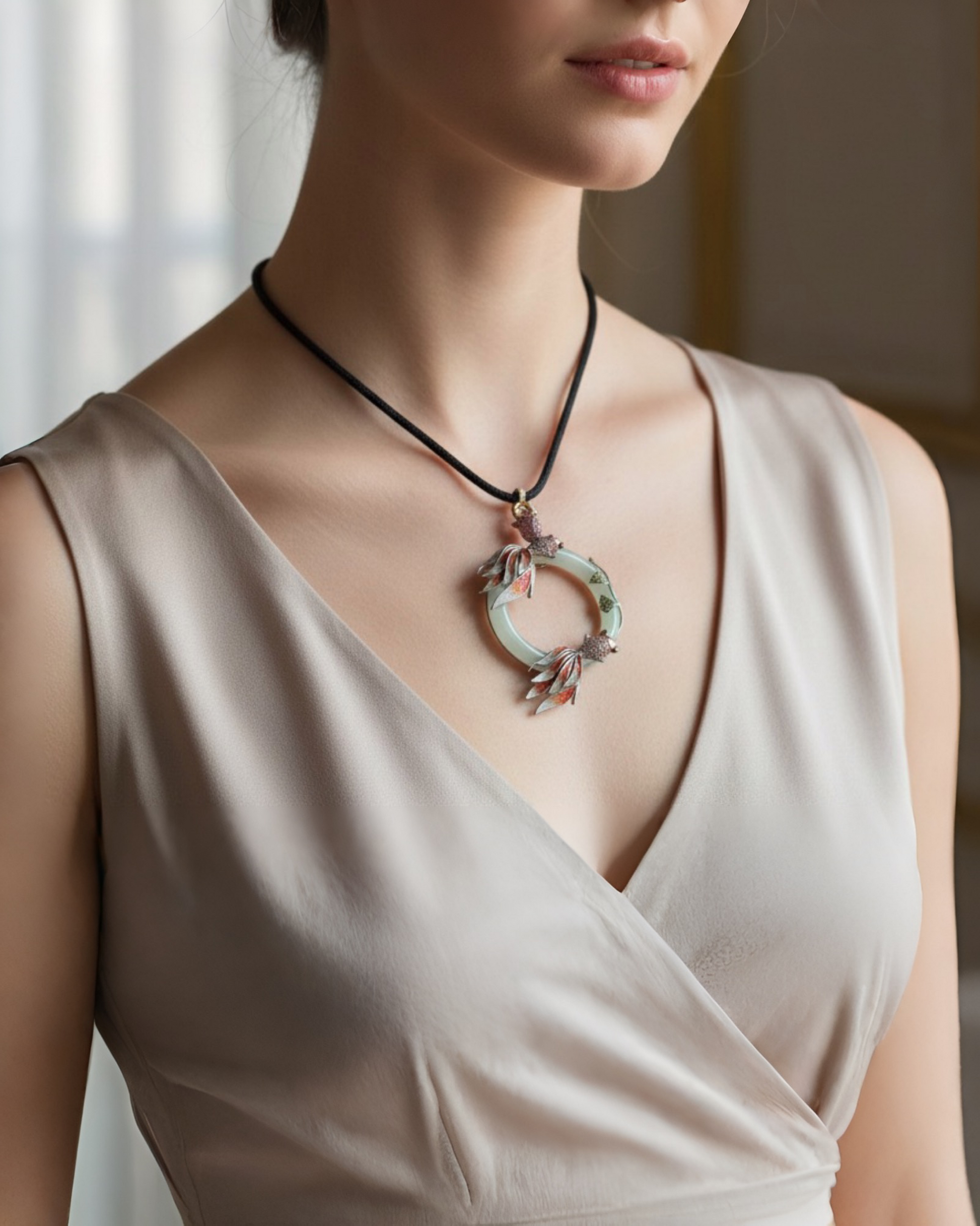 Crafted in solid sterling silver, the metal intentionally steps back—allowing the jade and enamel work to remain the focal point. The result is a piece that feels closer to a small jade sculpture than conventional jewelry.