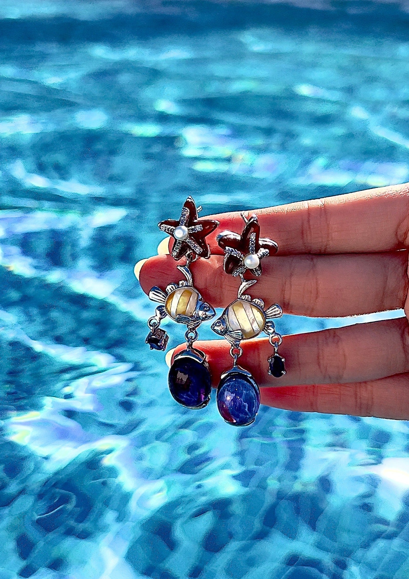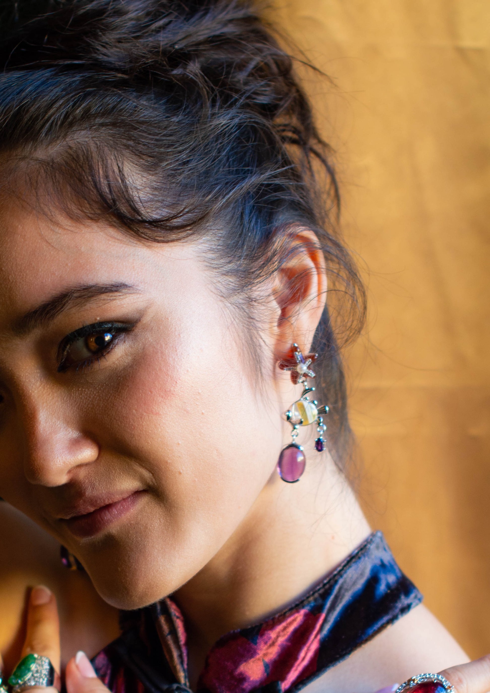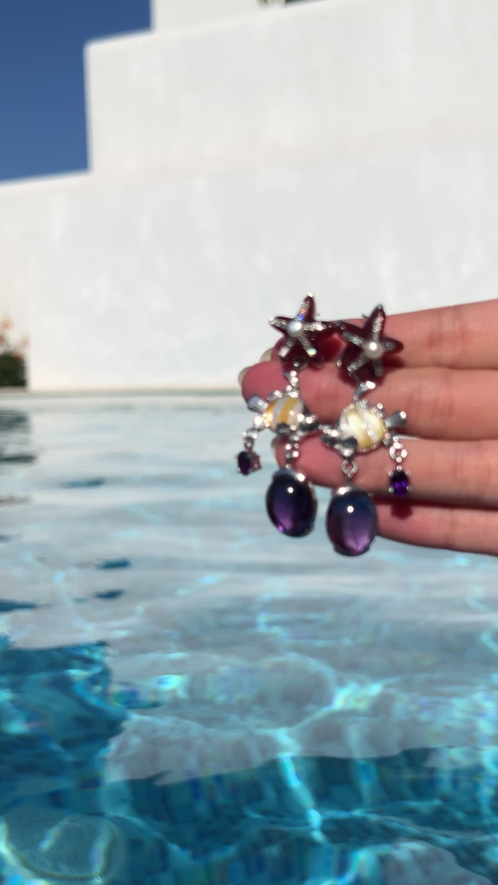 Elevate your beach vacation look with Playa Estrella Beach Resort Earrings. Handcrafted and inspired by ocean creatures, these earrings feature sparkling diamonds, lustrous pearls, and stunning amethyst. Let the natural beauty of agate, mother of pearl, and biwa pearl bring a touch of the sea to your style.