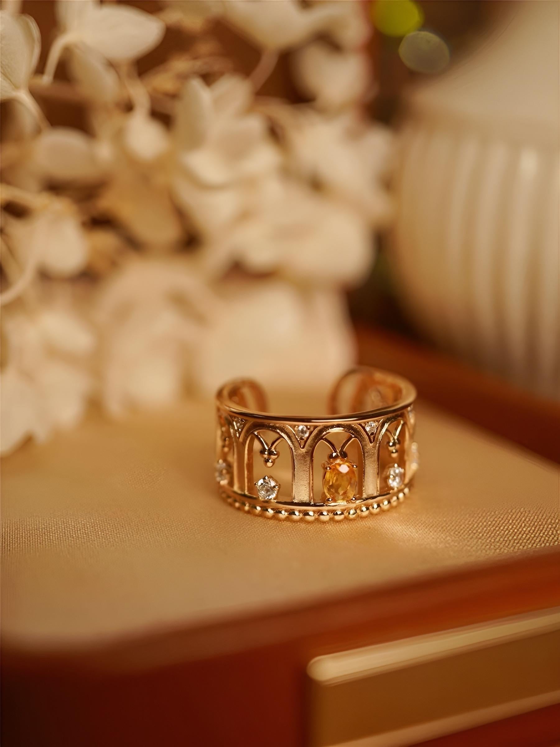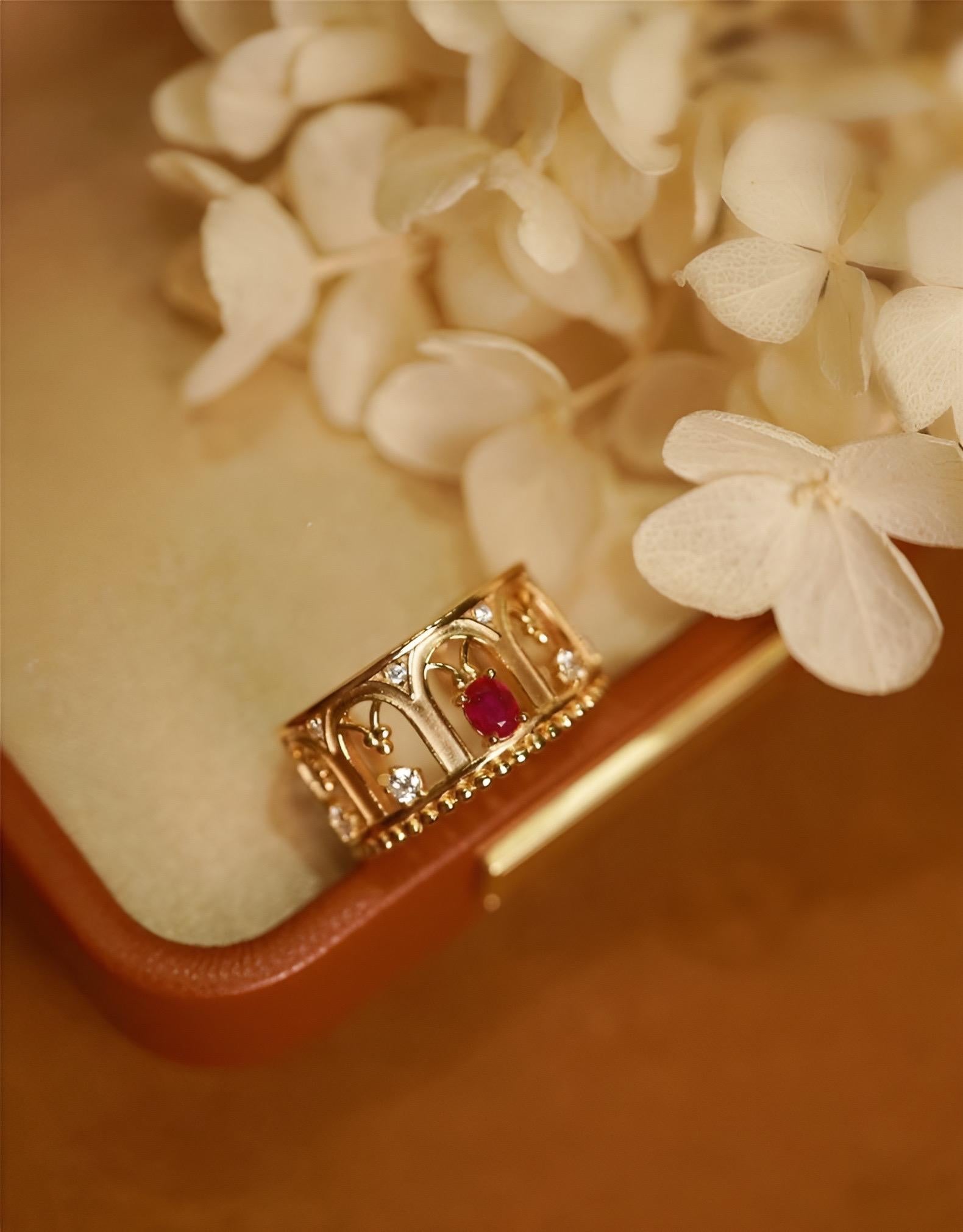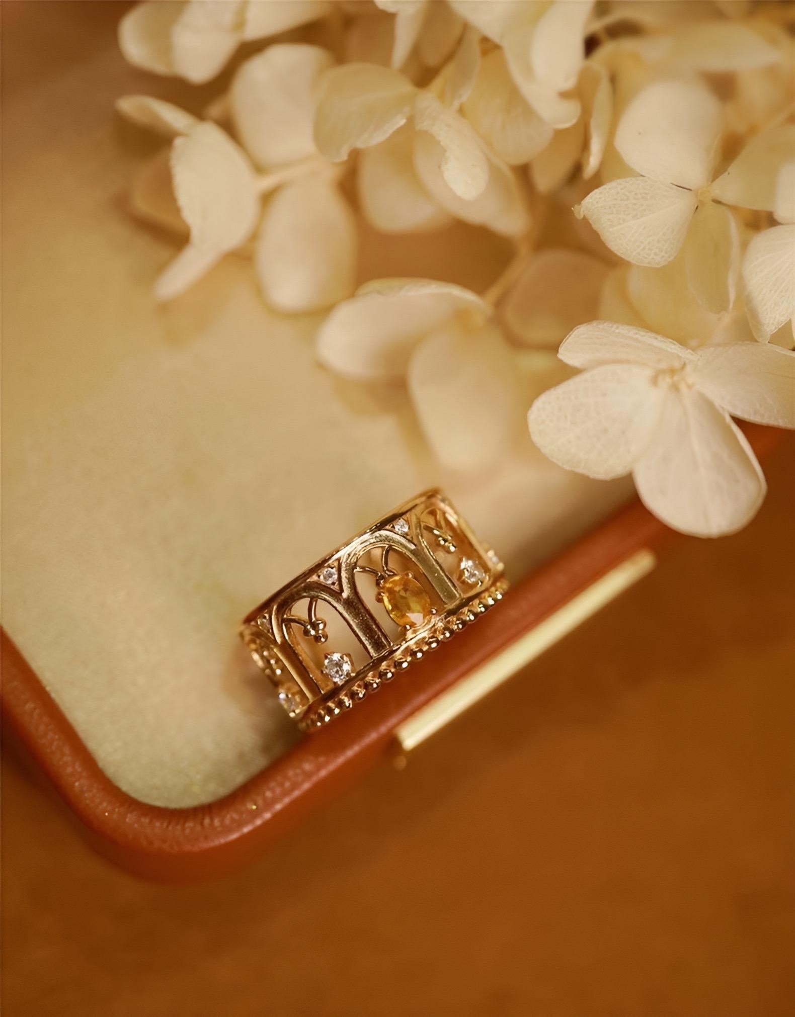This exquisite openwork ring showcases Ruby or Yellow Sapphire alongside diamonds. Its three-dimensional design echoes the architectural and decorative arts of the Renaissance, evoking a sense of virtue and tranquility through its masterful interplay of light and form.