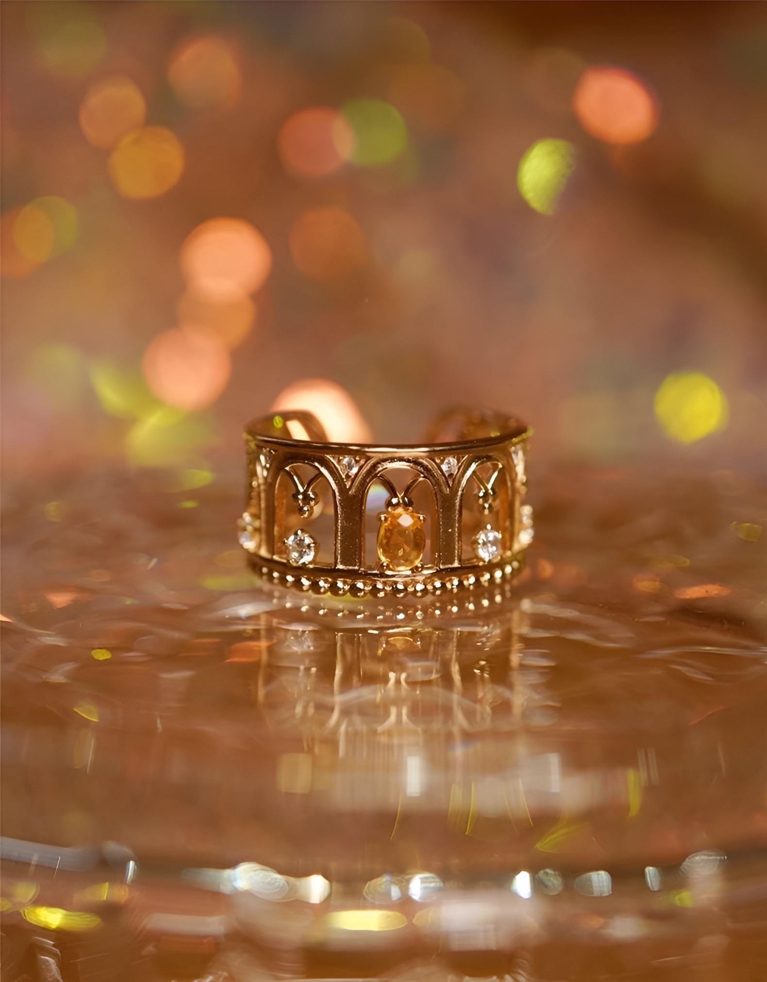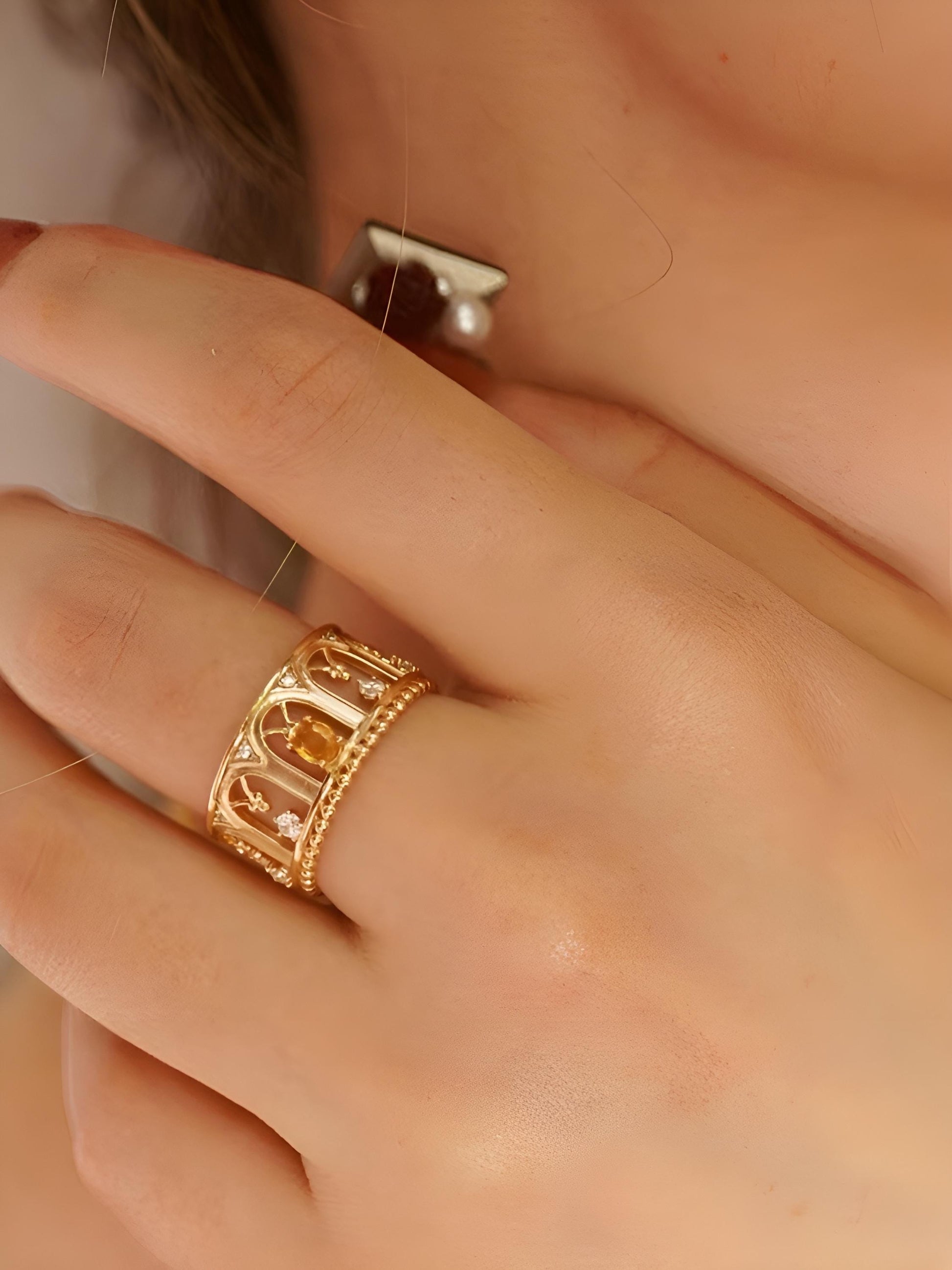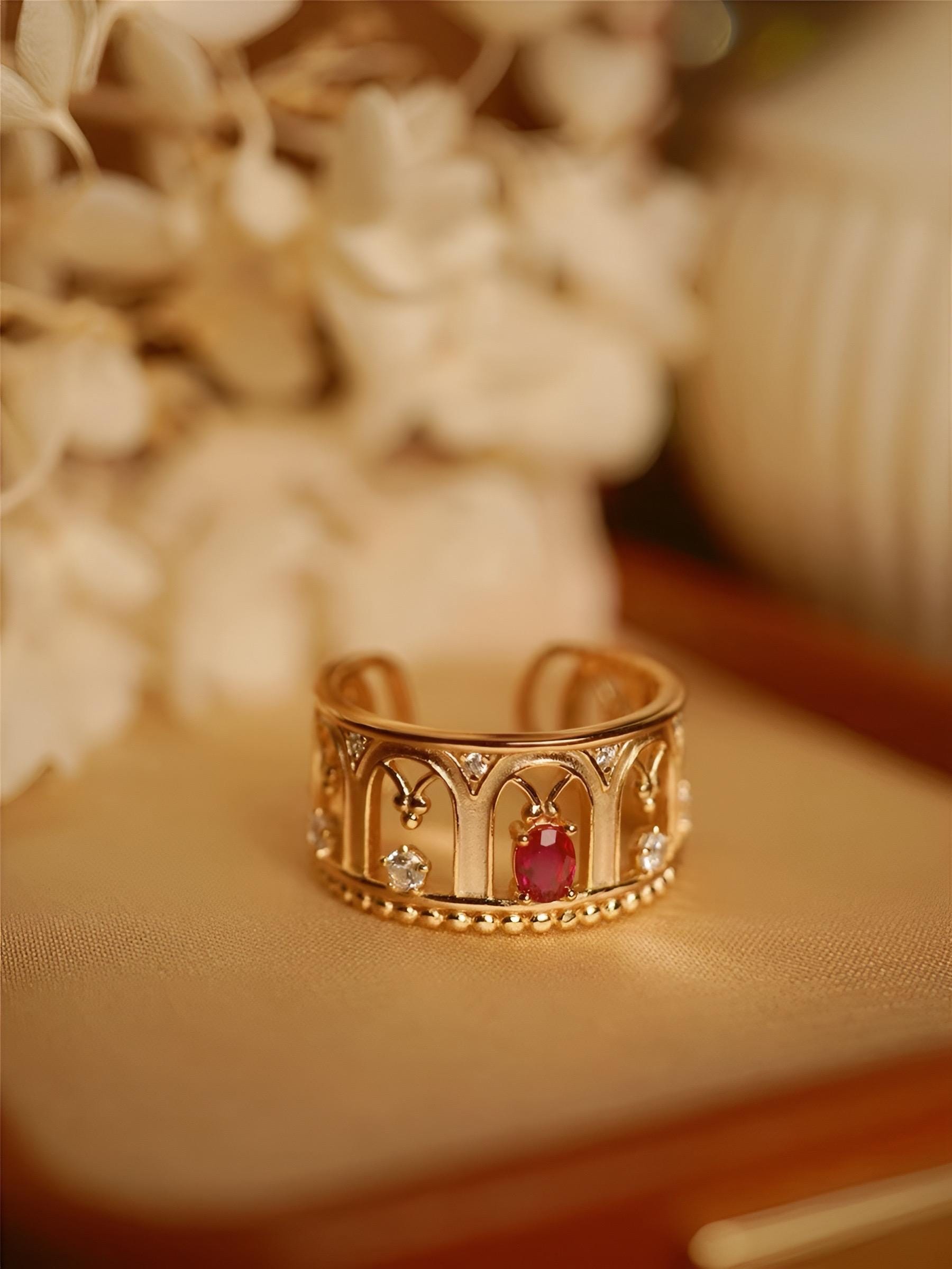 This exquisite openwork ring showcases Ruby or Yellow Sapphire alongside diamonds. Its three-dimensional design echoes the architectural and decorative arts of the Renaissance, evoking a sense of virtue and tranquility through its masterful interplay of light and form.