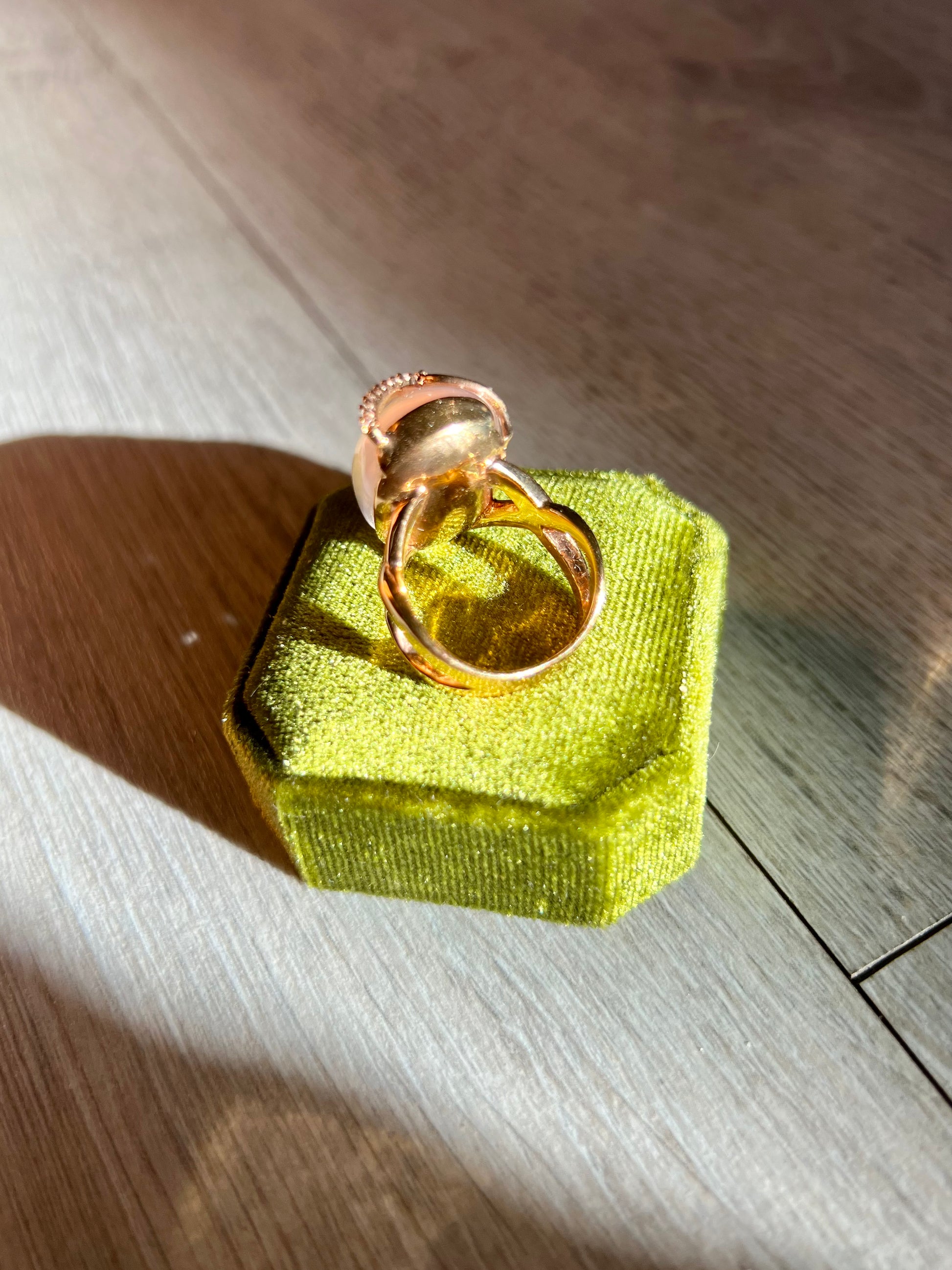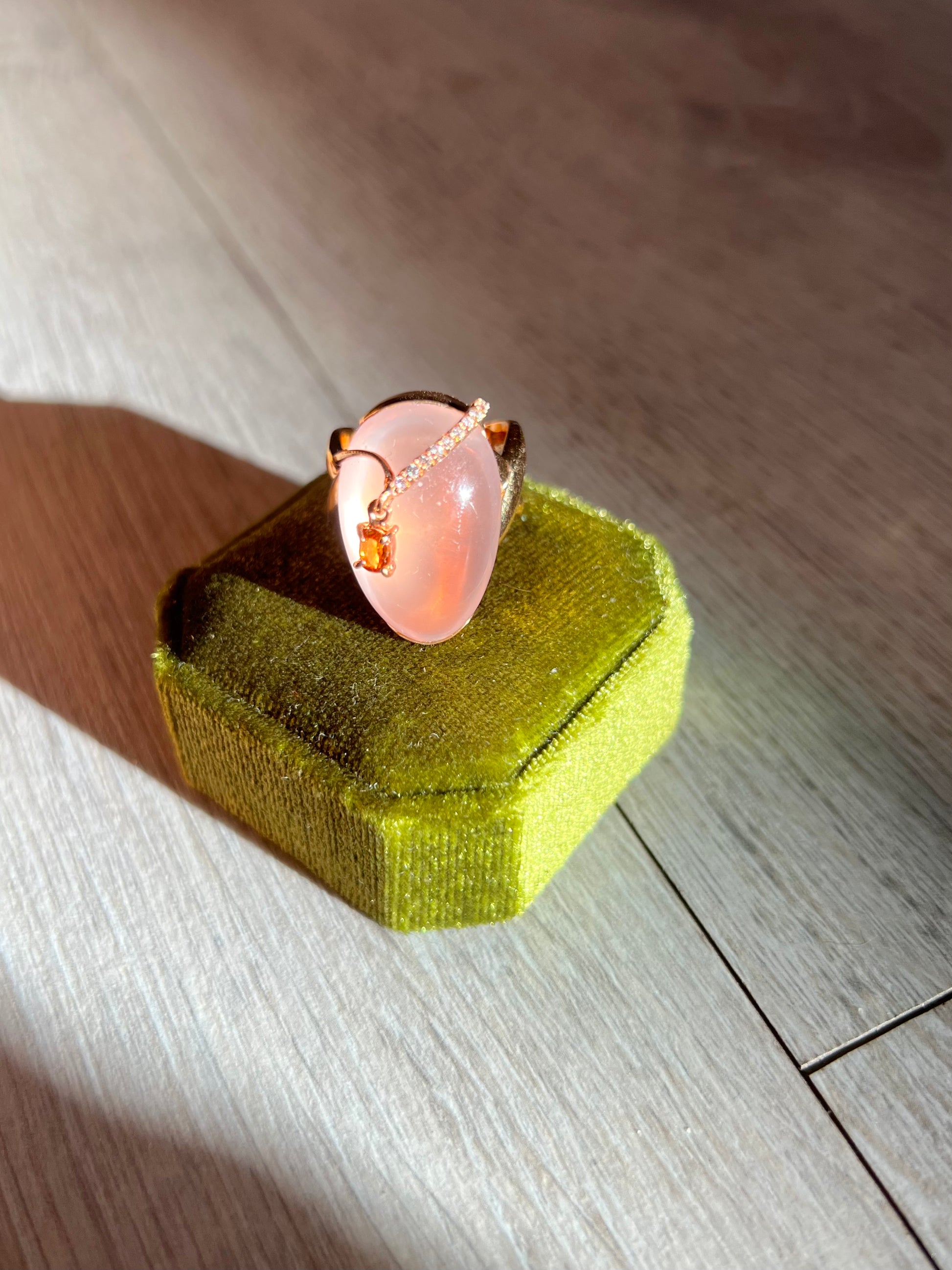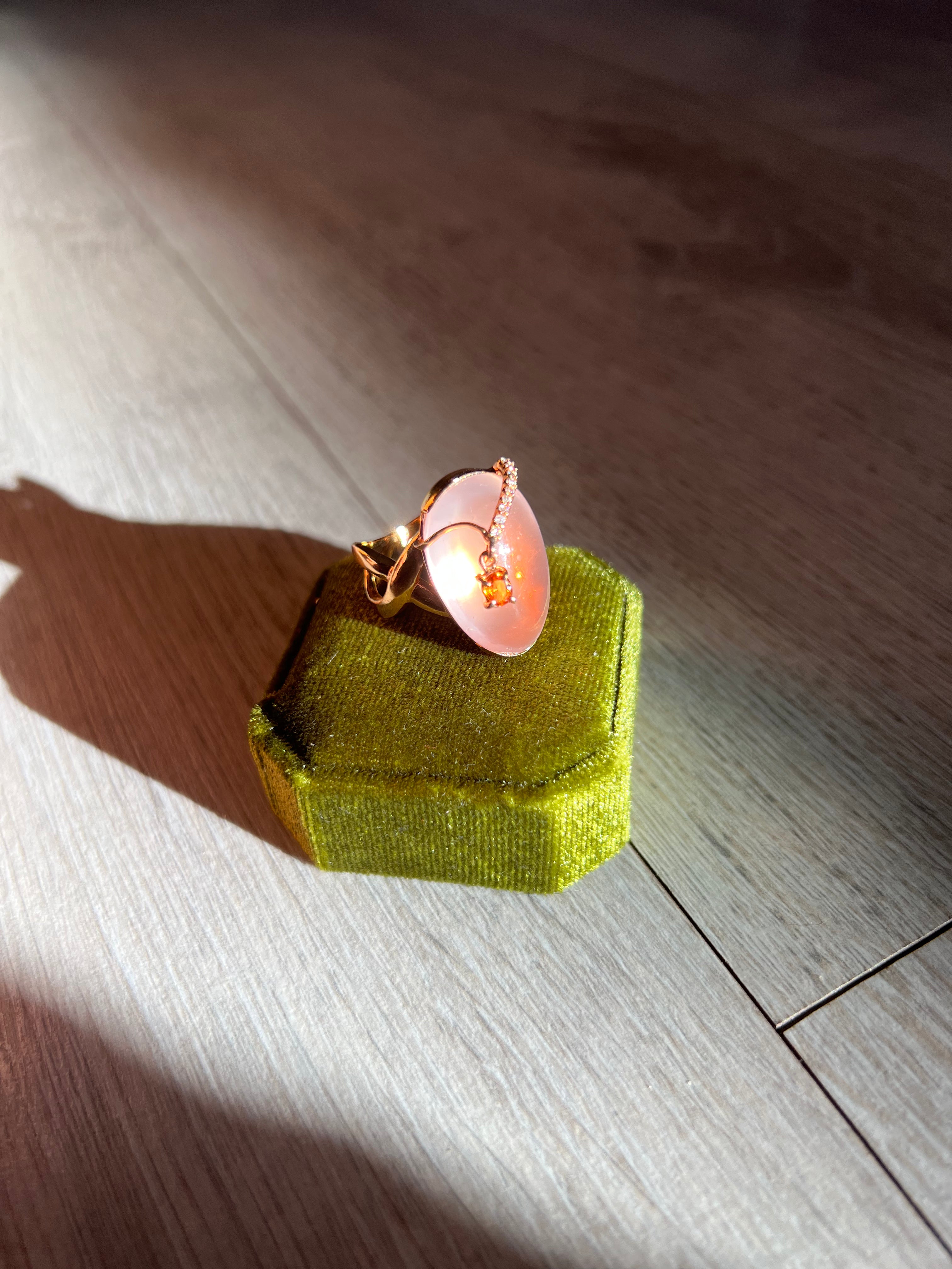 Featuring 7 carats of fine-quality cabochon rose quartz with a twinkling asterism, sourced from the majestic hues of Mozambique, and complemented by a faceted amber citrine gemstone, this unique, speakeasy-inspired cocktail ring is a standout piece.
