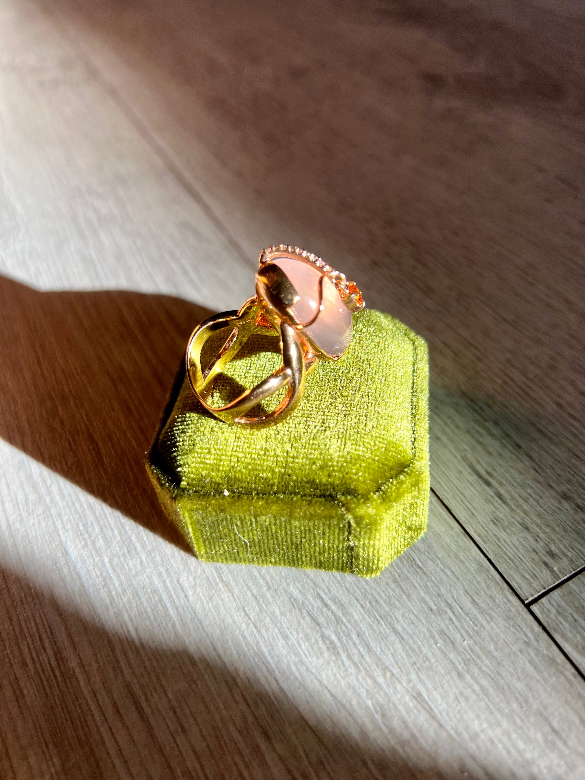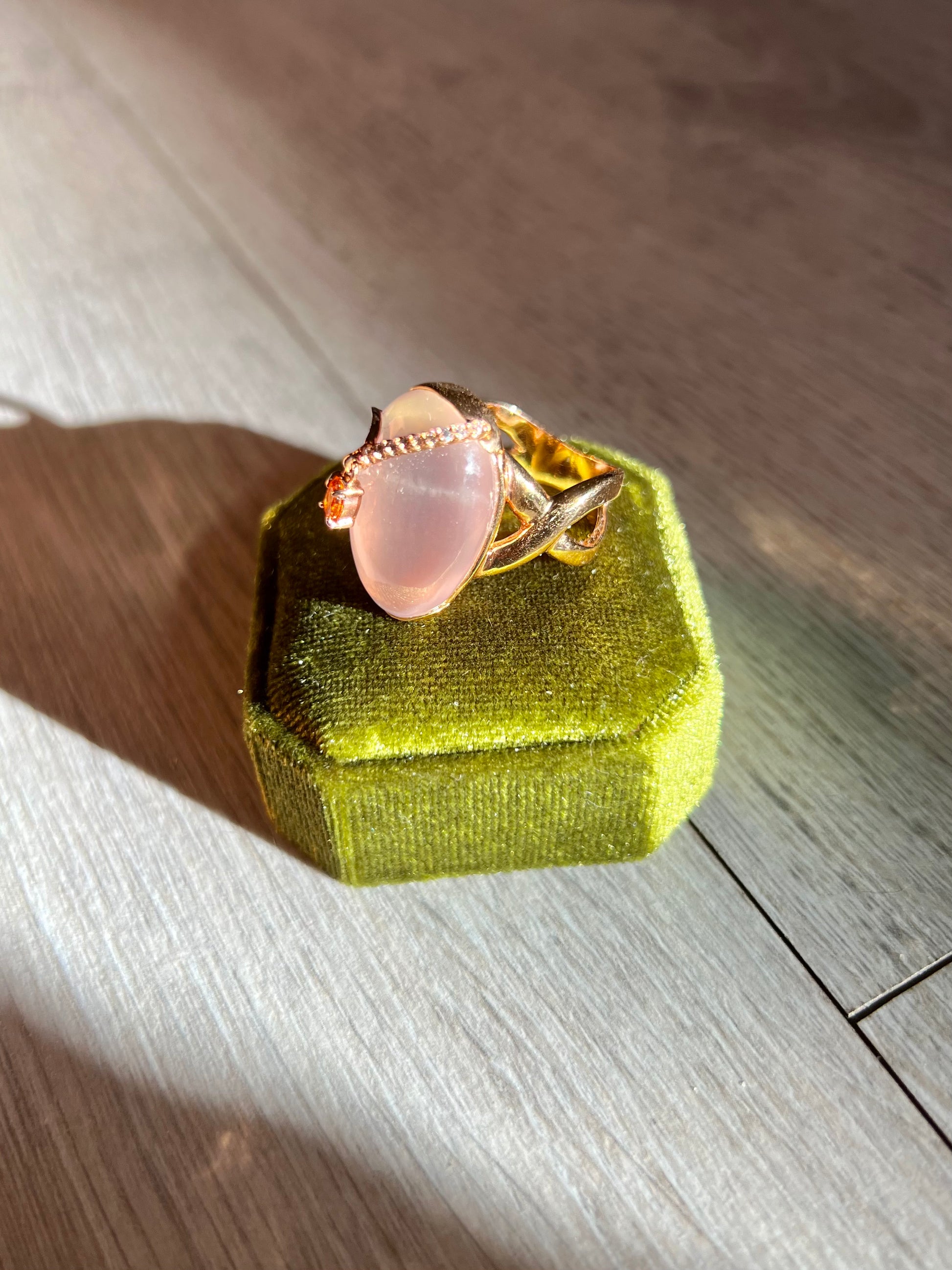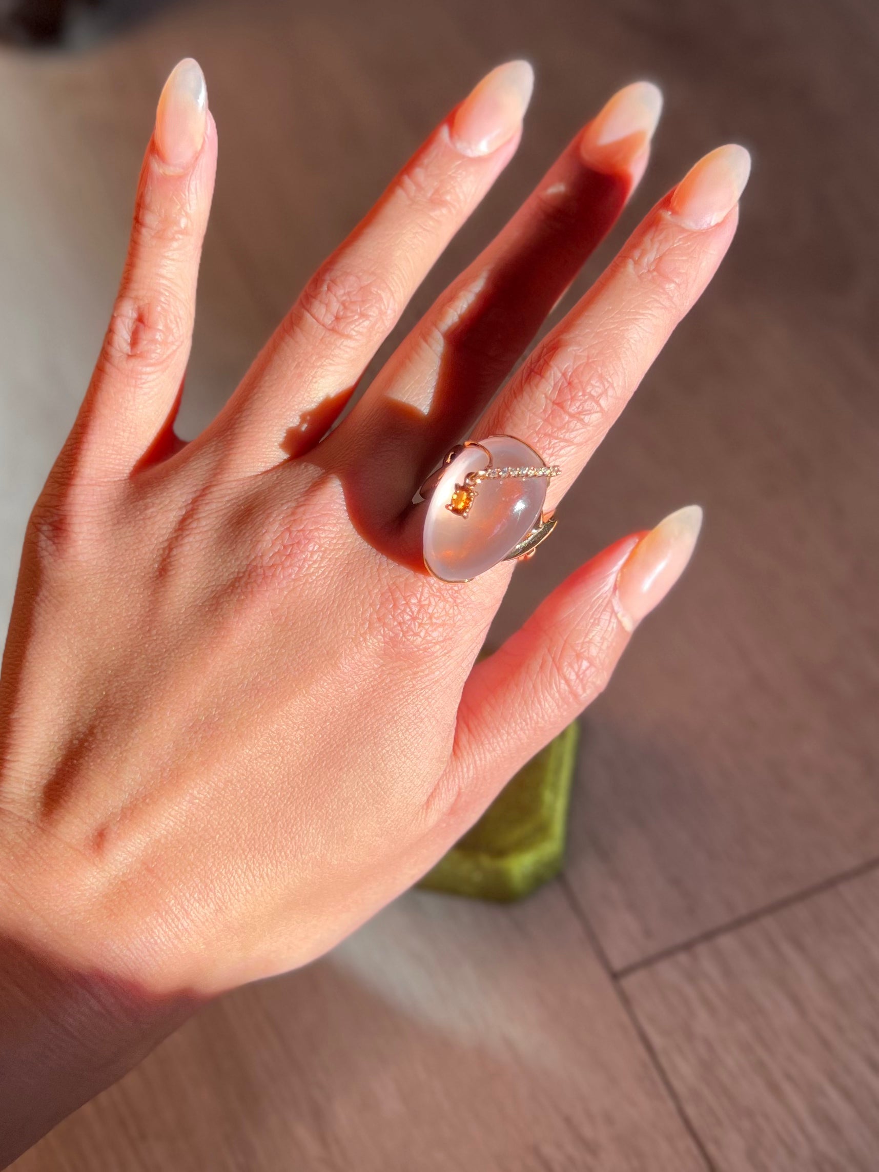 Featuring 7 carats of fine-quality cabochon rose quartz with a twinkling asterism, sourced from the majestic hues of Mozambique, and complemented by a faceted amber citrine gemstone, this unique, speakeasy-inspired cocktail ring is a standout piece.