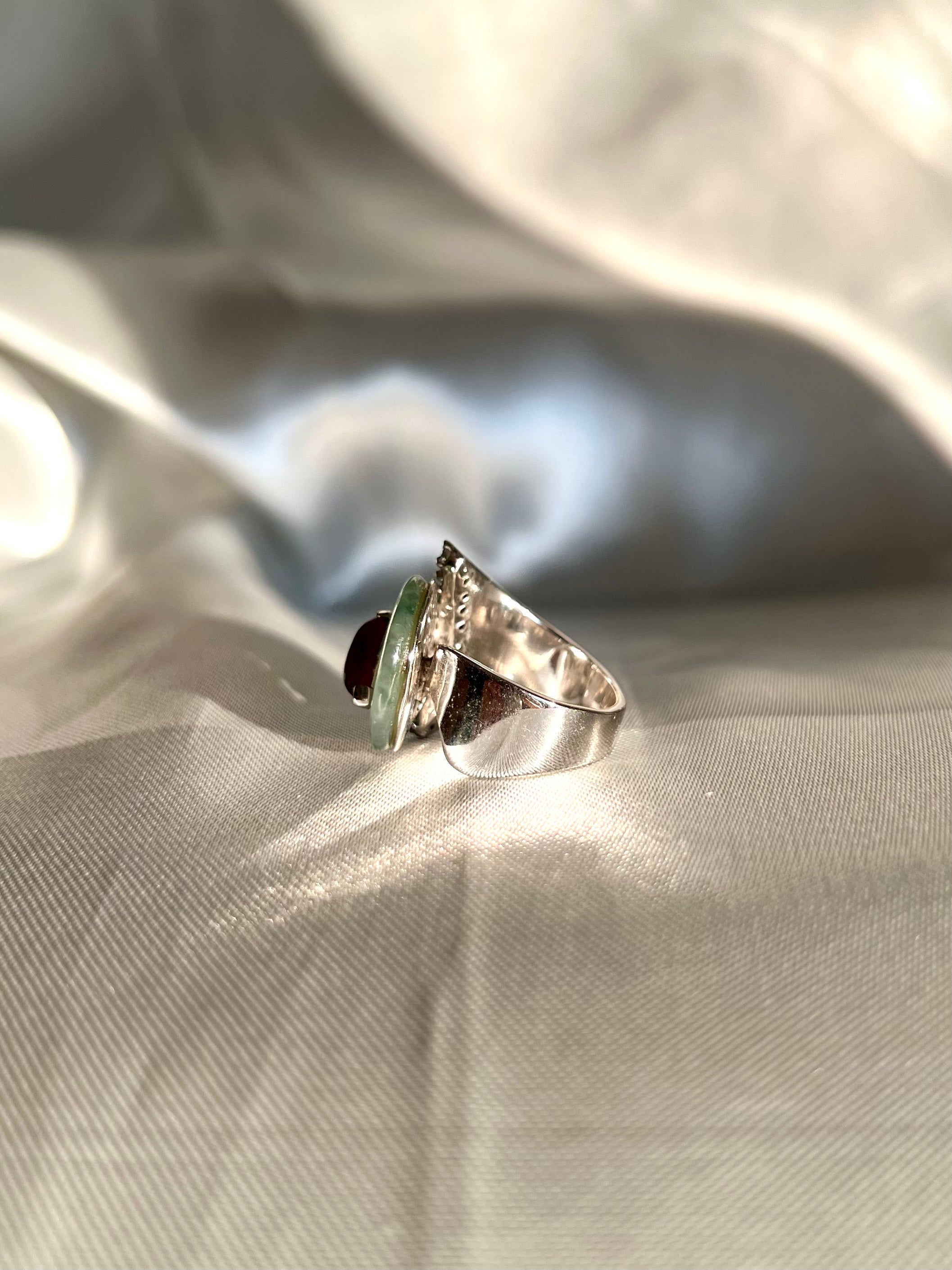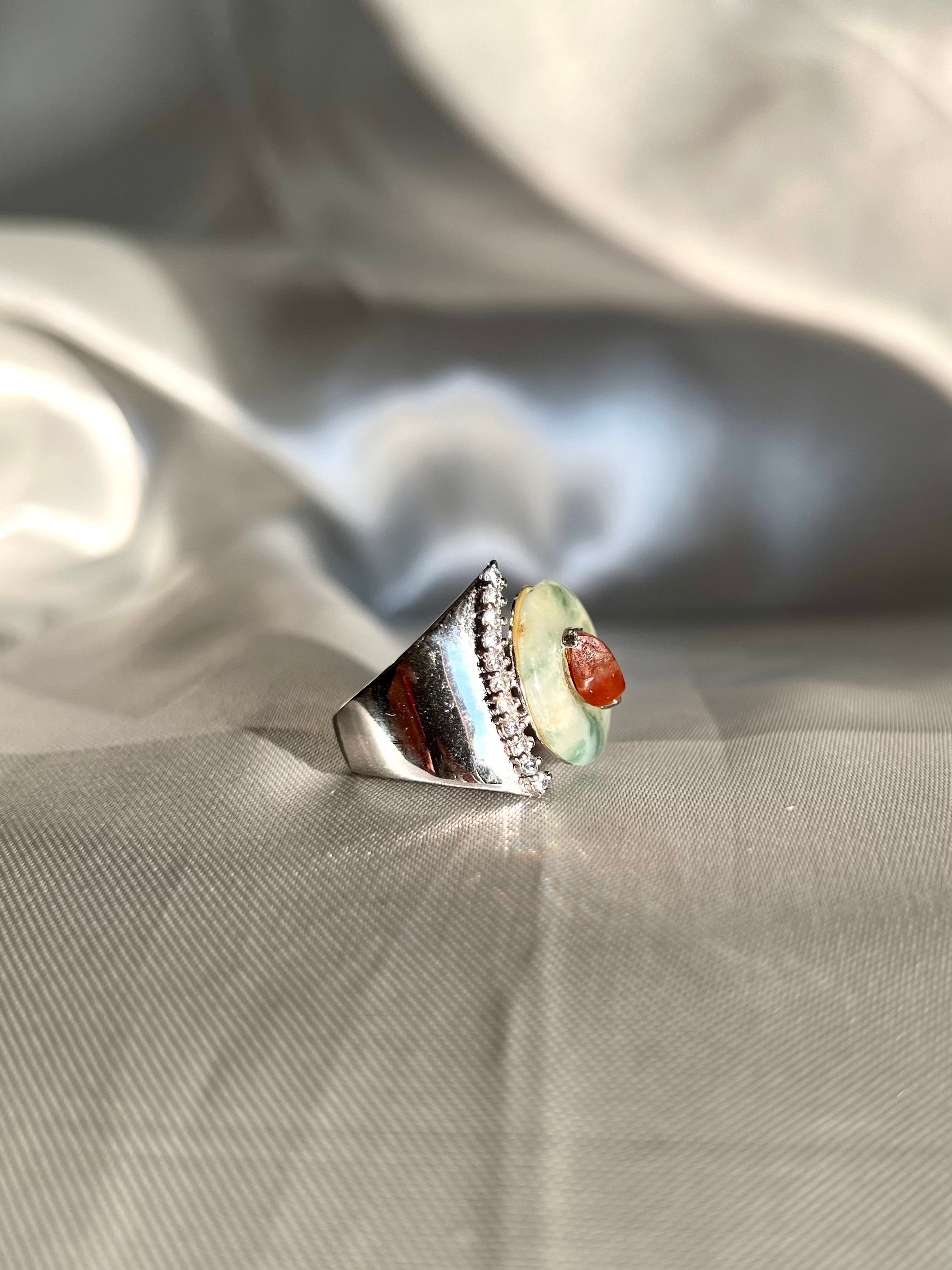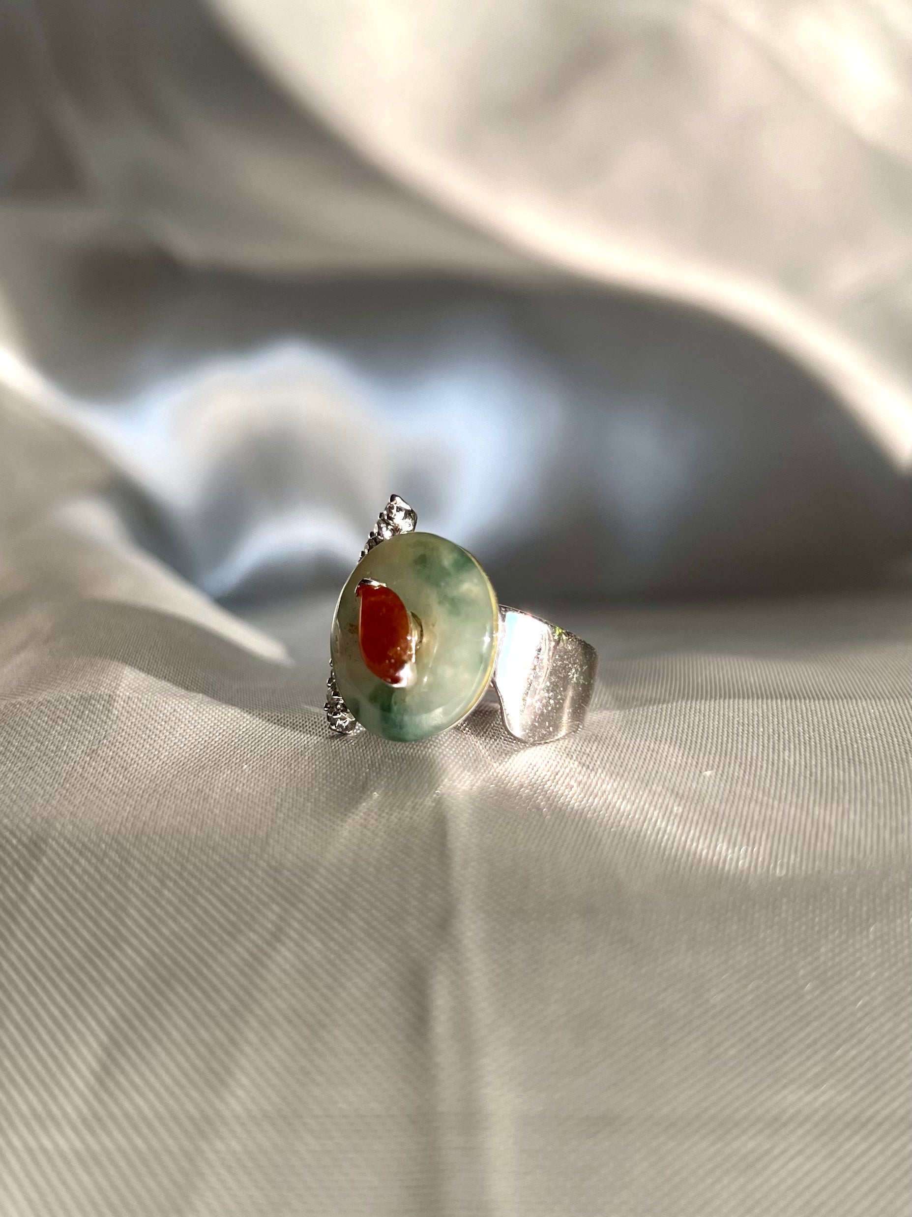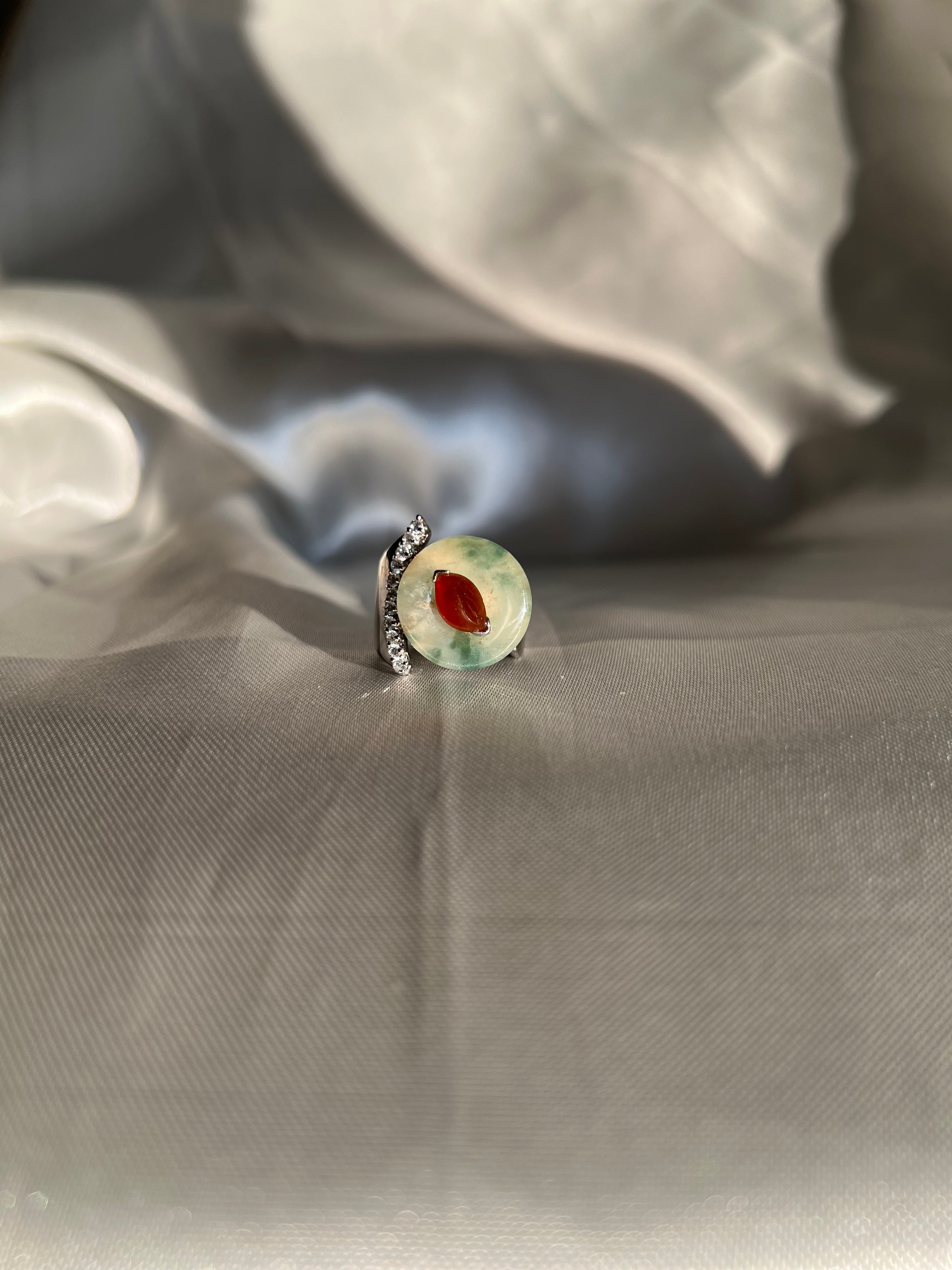 An elegant ring featuring a natural round disc-shaped 'Fei Cui' jadeite jade and a red bird-shaped jade, complemented by shiny crystals. 'Fei Cui' is a stone believed to protect and nourish heart energy and is often worn in Asian culture to calm its wearer. This exquisite piece combines cultural significance with timeless beauty