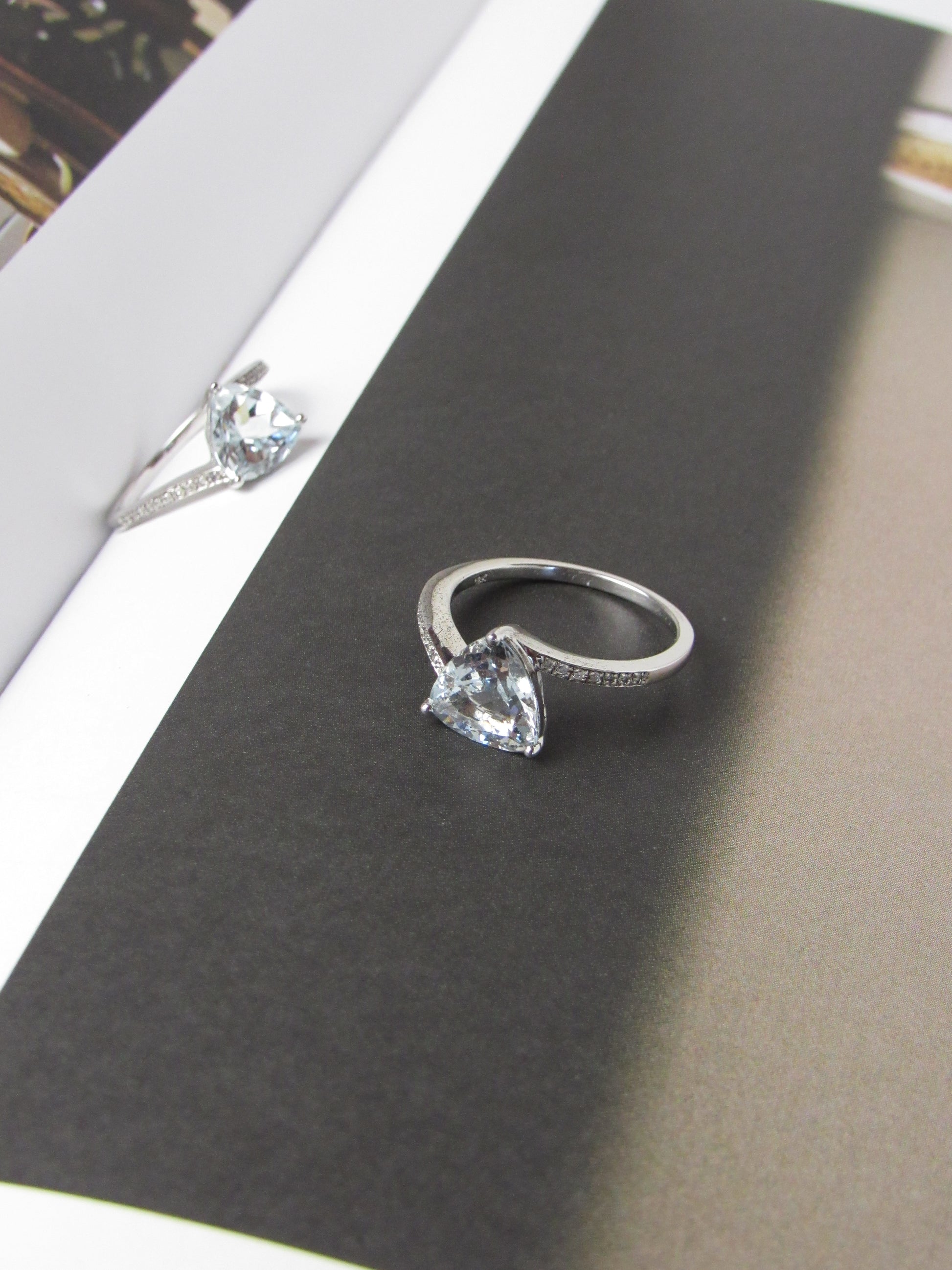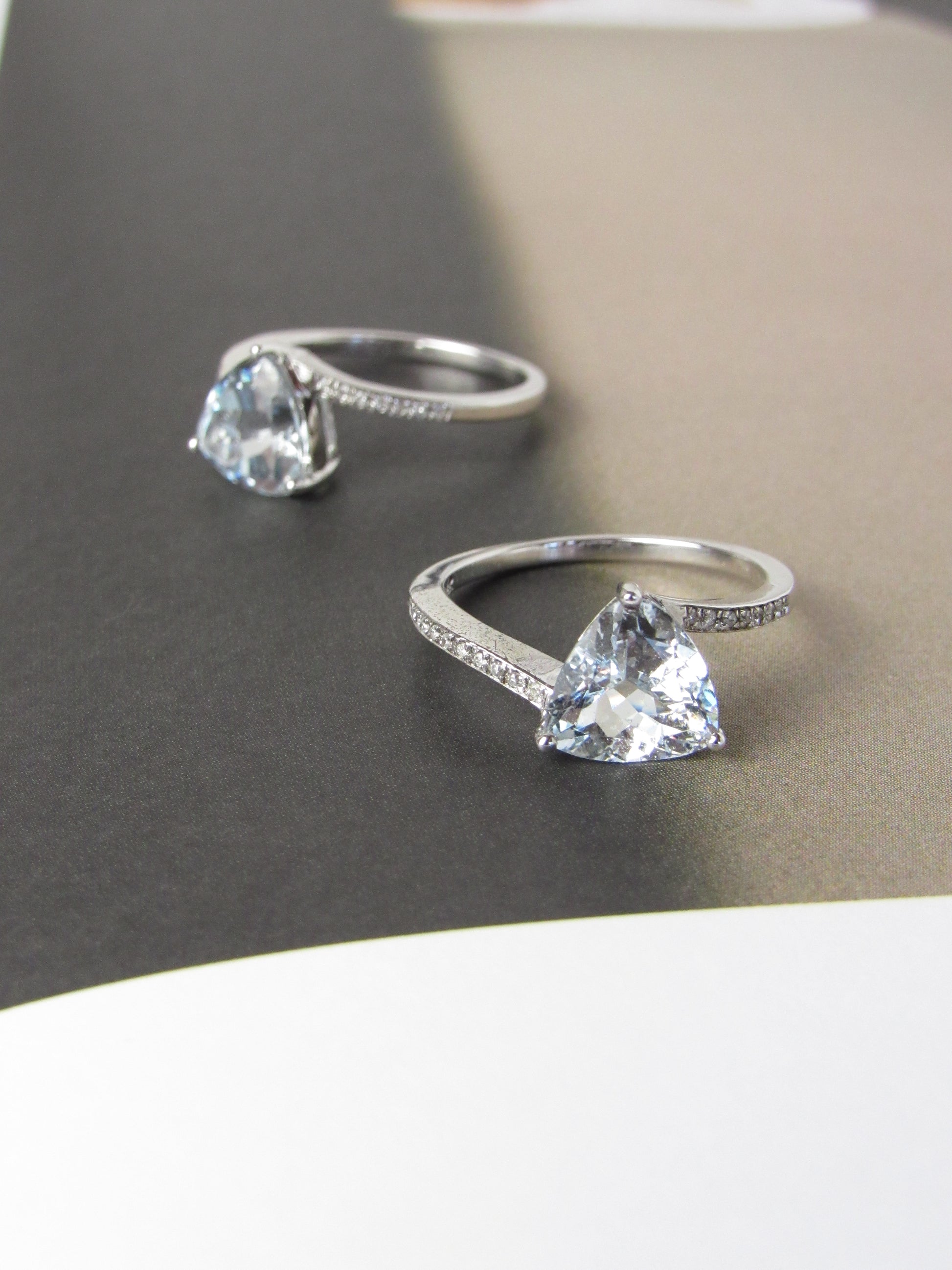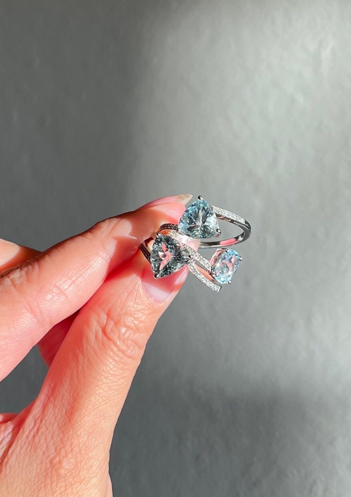 The beauty of this exceptional 3.8 CT trillion cut natural aquamarine ring makes it a piece that will always be cherished. An elegant 18K white gold band creates a perfect setting for the stunningly sparkling central gem and its surrounding 0.50CT of ethical natural diamonds.