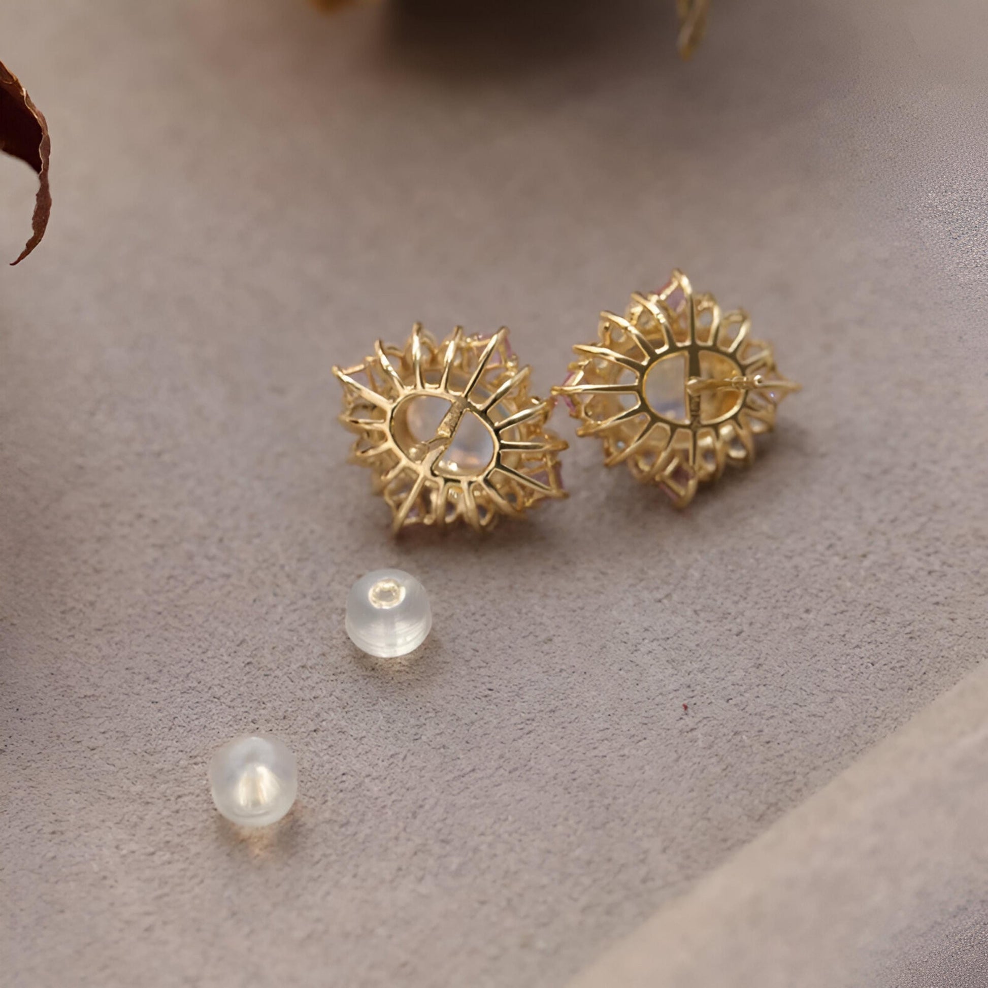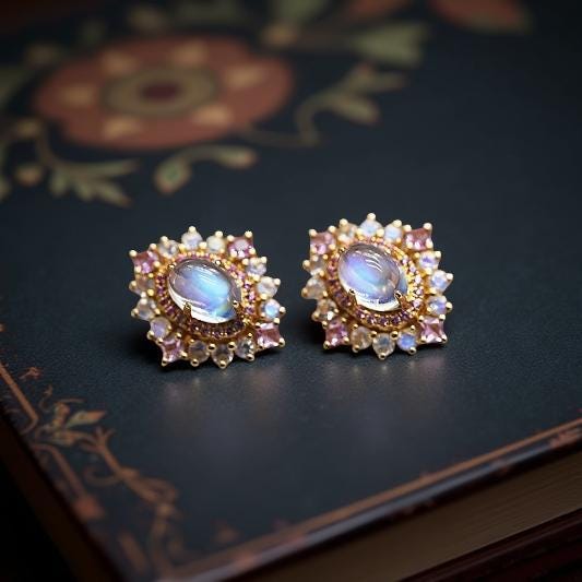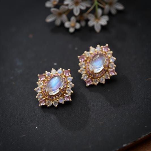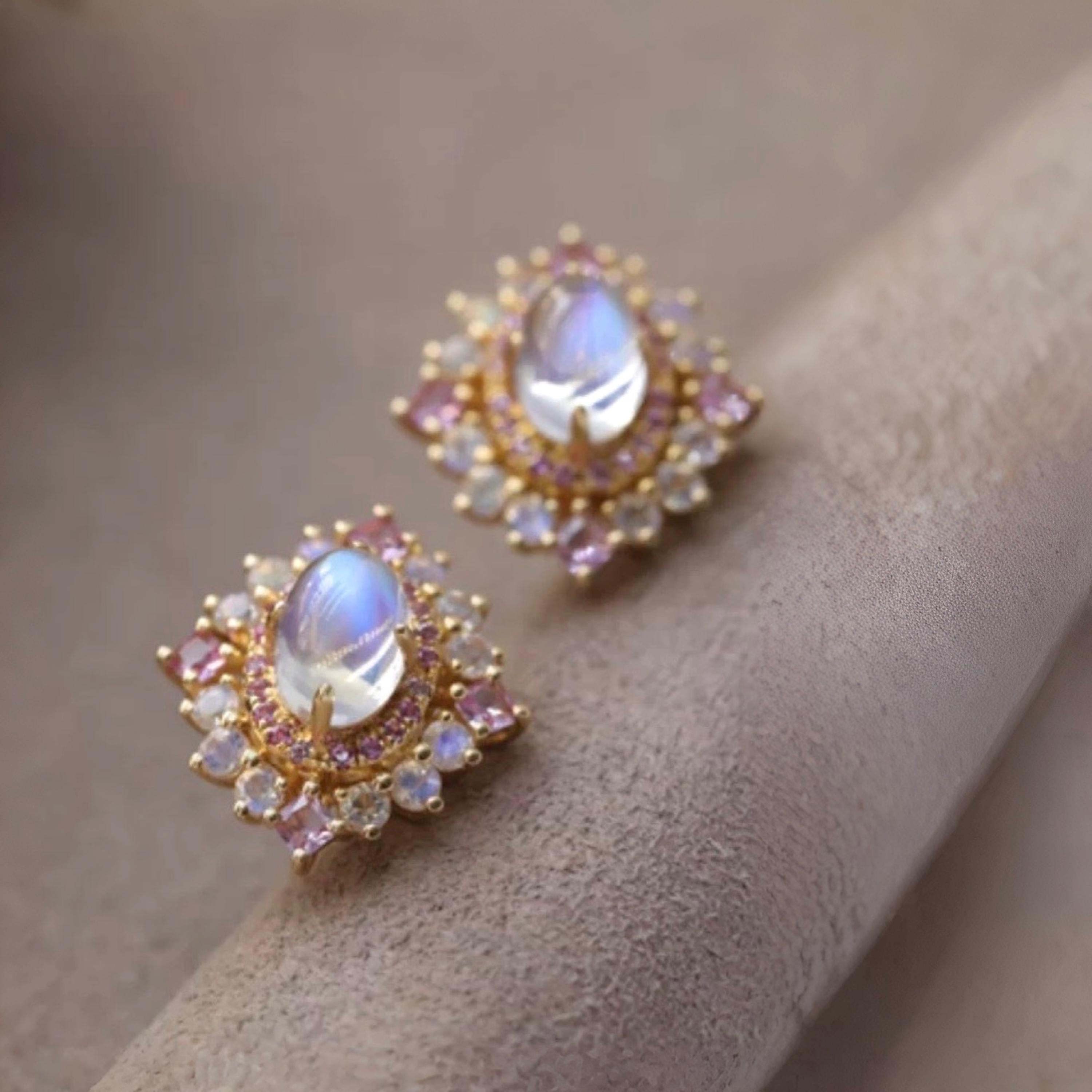 We designed this pair to feel like a little universe at your ears. The moonstone is known for intuition, clarity, and new beginnings—while pink sapphire carries the vibration of love, compassion, and emotional strength.