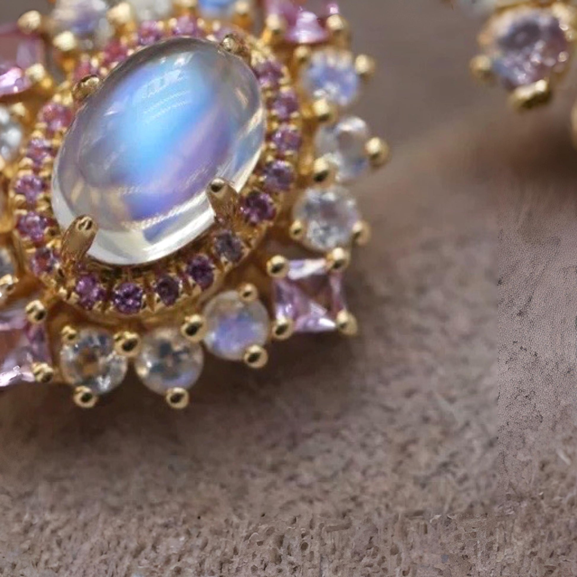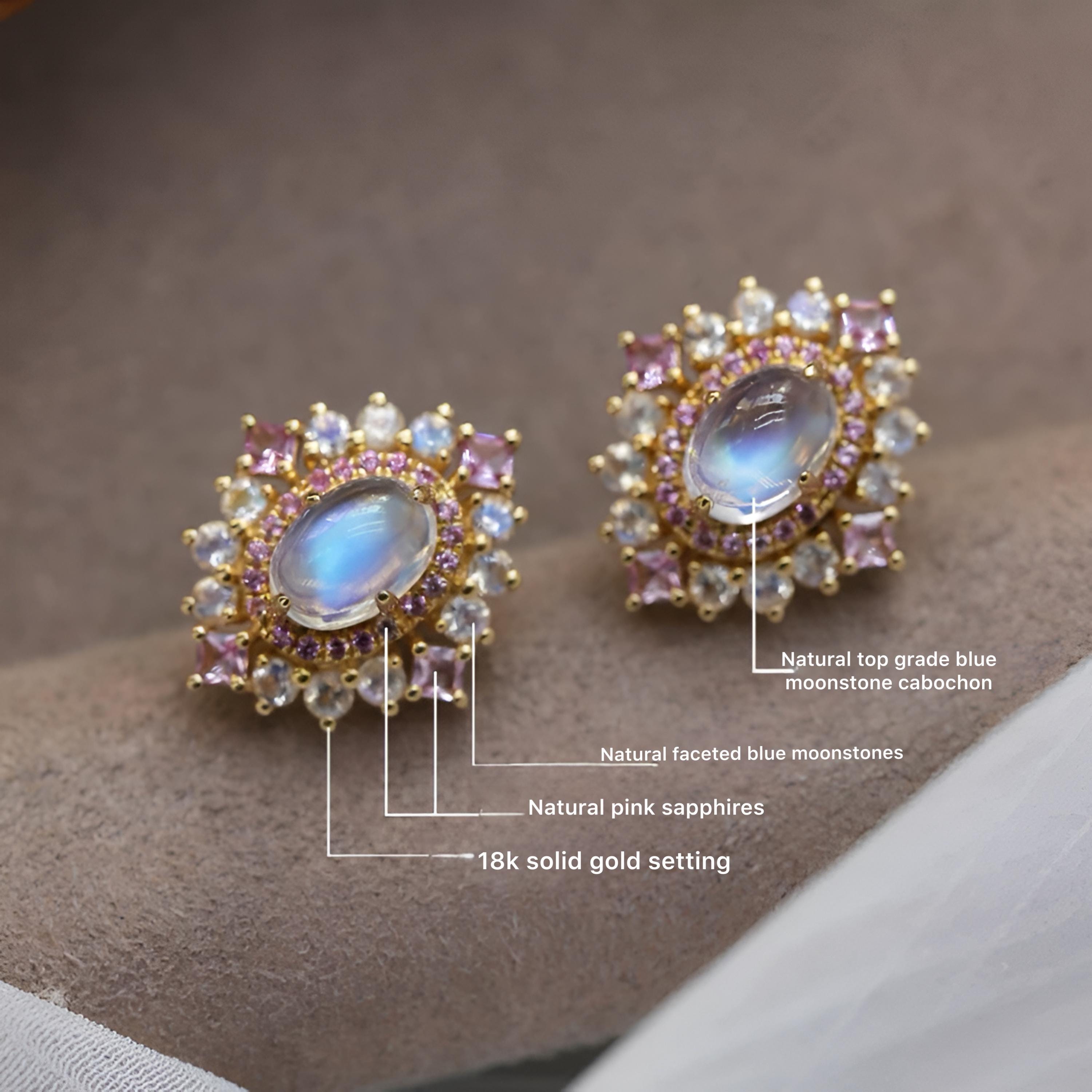 Crafted in solid 18K gold, each piece features a luminous, natural blue moonstone cabochon at the center—glowing softly like moonlight on still water. It’s surrounded by a halo of faceted moonstones and vivid pink sapphires, creating a balance of softness and strength, feminine energy and inner calm.