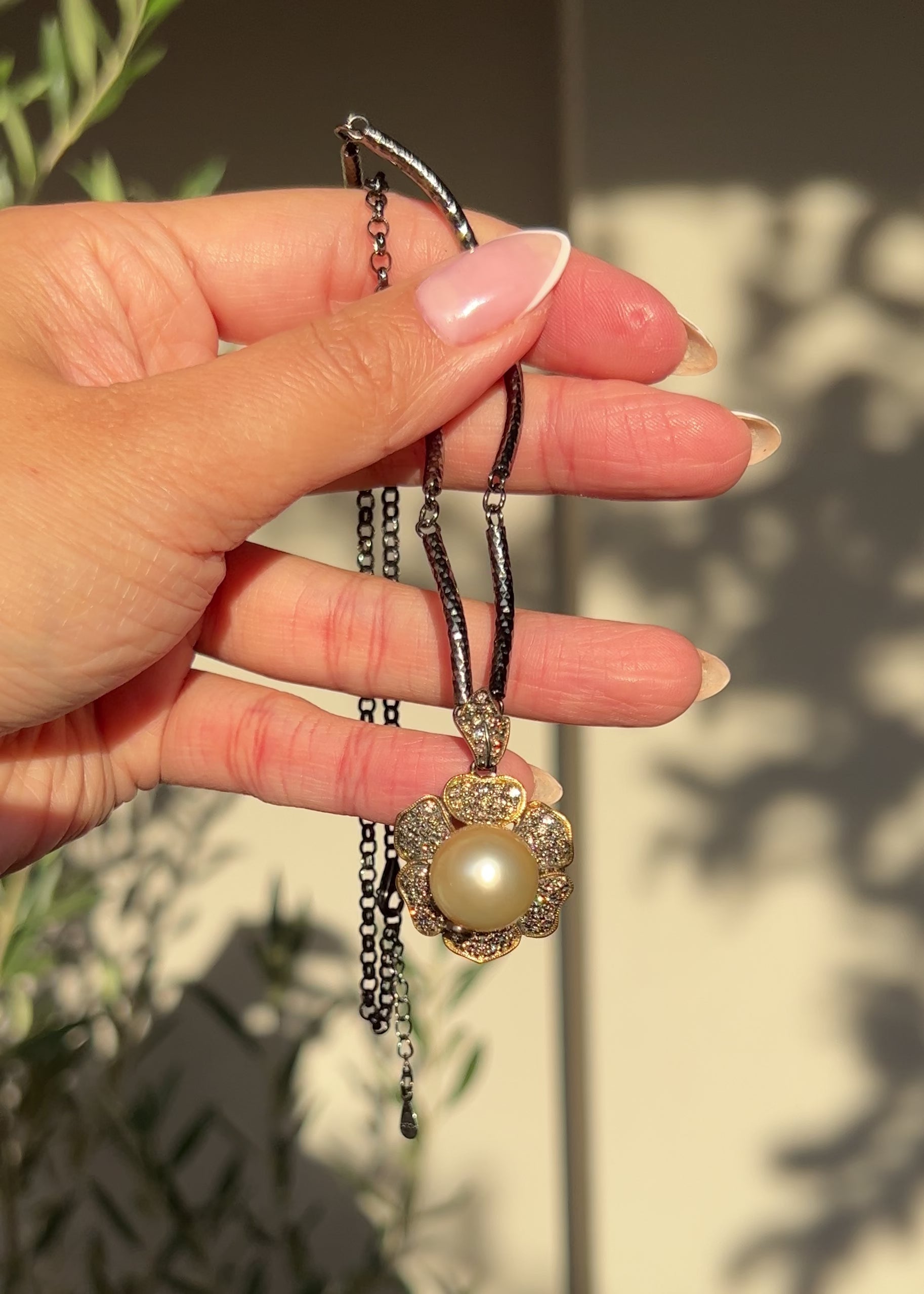 The Gorgeous Prairie Rose Pendant features a South Sea golden pearl with a beautiful luster. This exquisite piece is adorned with 80 sparkling champagne diamonds totaling 0.8 carats. Crafted in the 90s in Taipei, Taiwan, this pendant was made in collaboration with a local Taiwanese metalsmith for a limited production using gems we sourced. The pendant also includes an elegant chain, perfect for adding a touch of sophistication to your style.