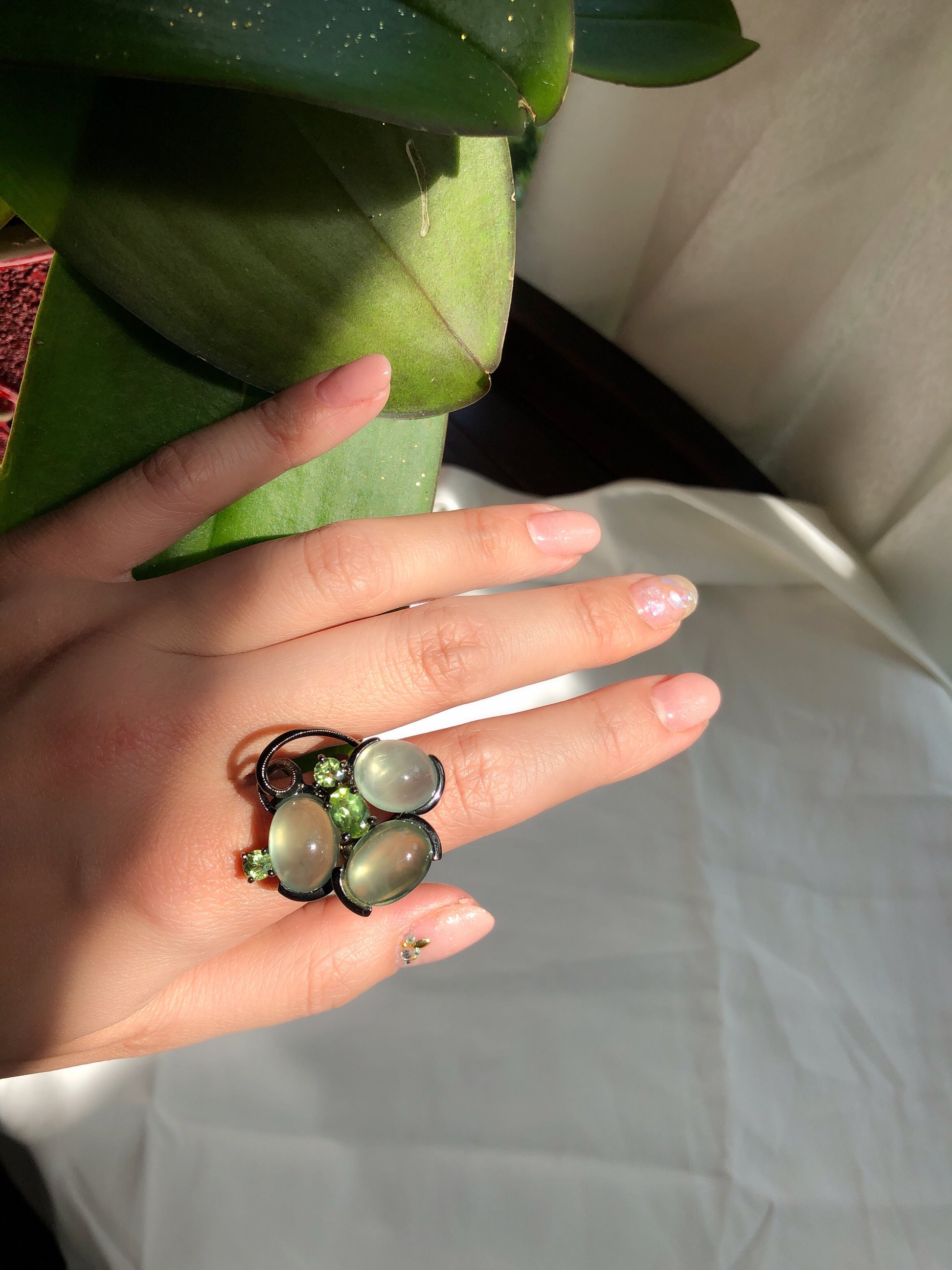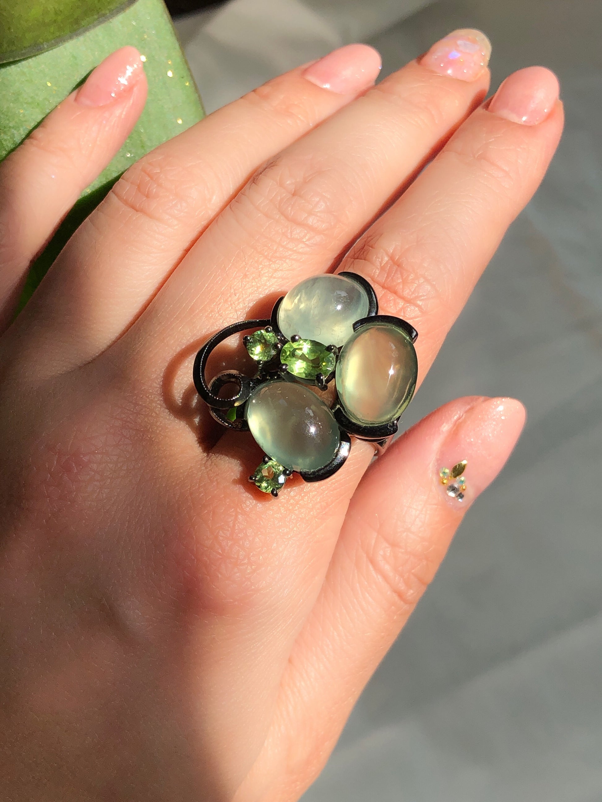 The classic cocktail-style ring showcases the vibrant energy of prehnite and peridot stones, creating a balanced atmosphere of positive and loving energy.
