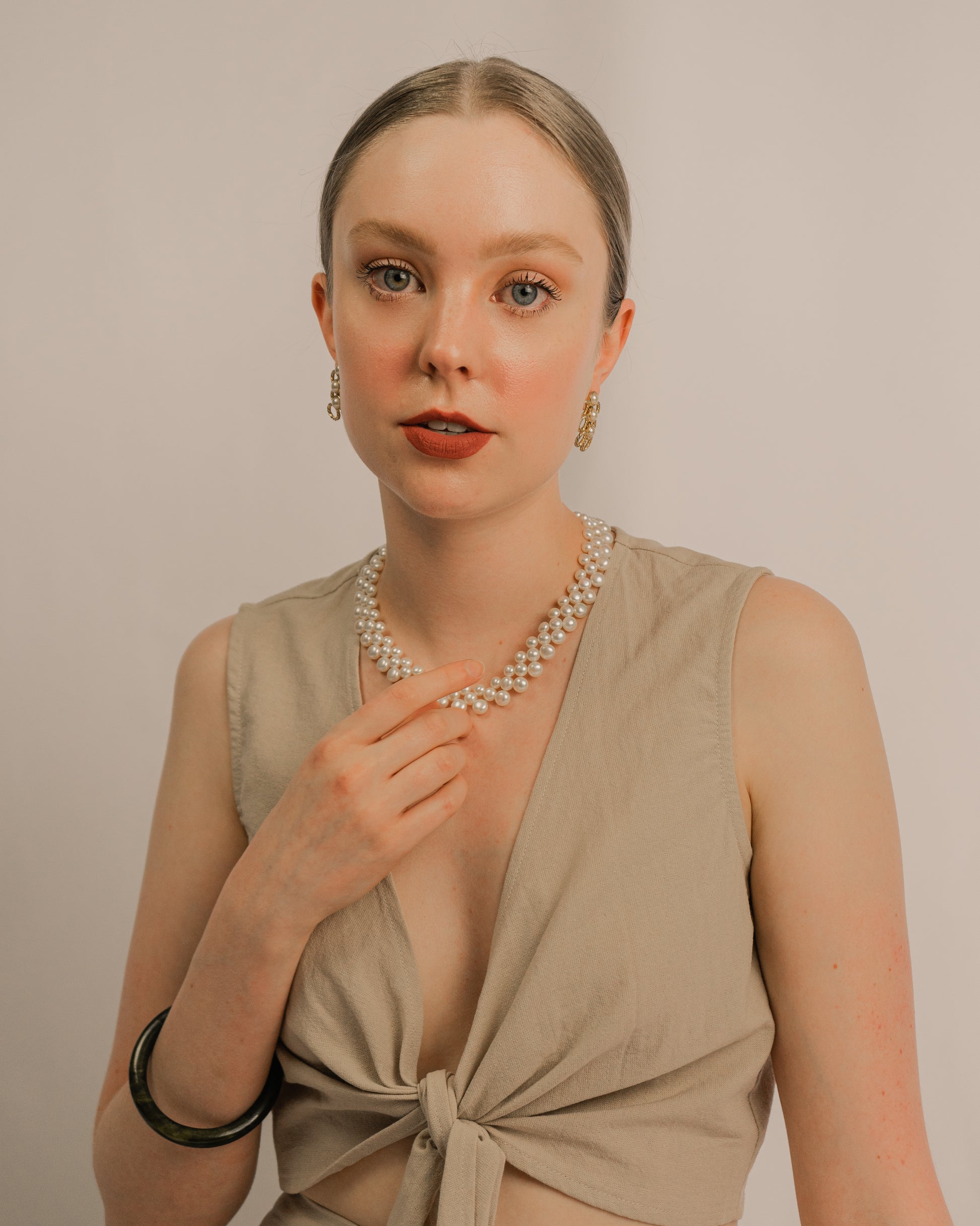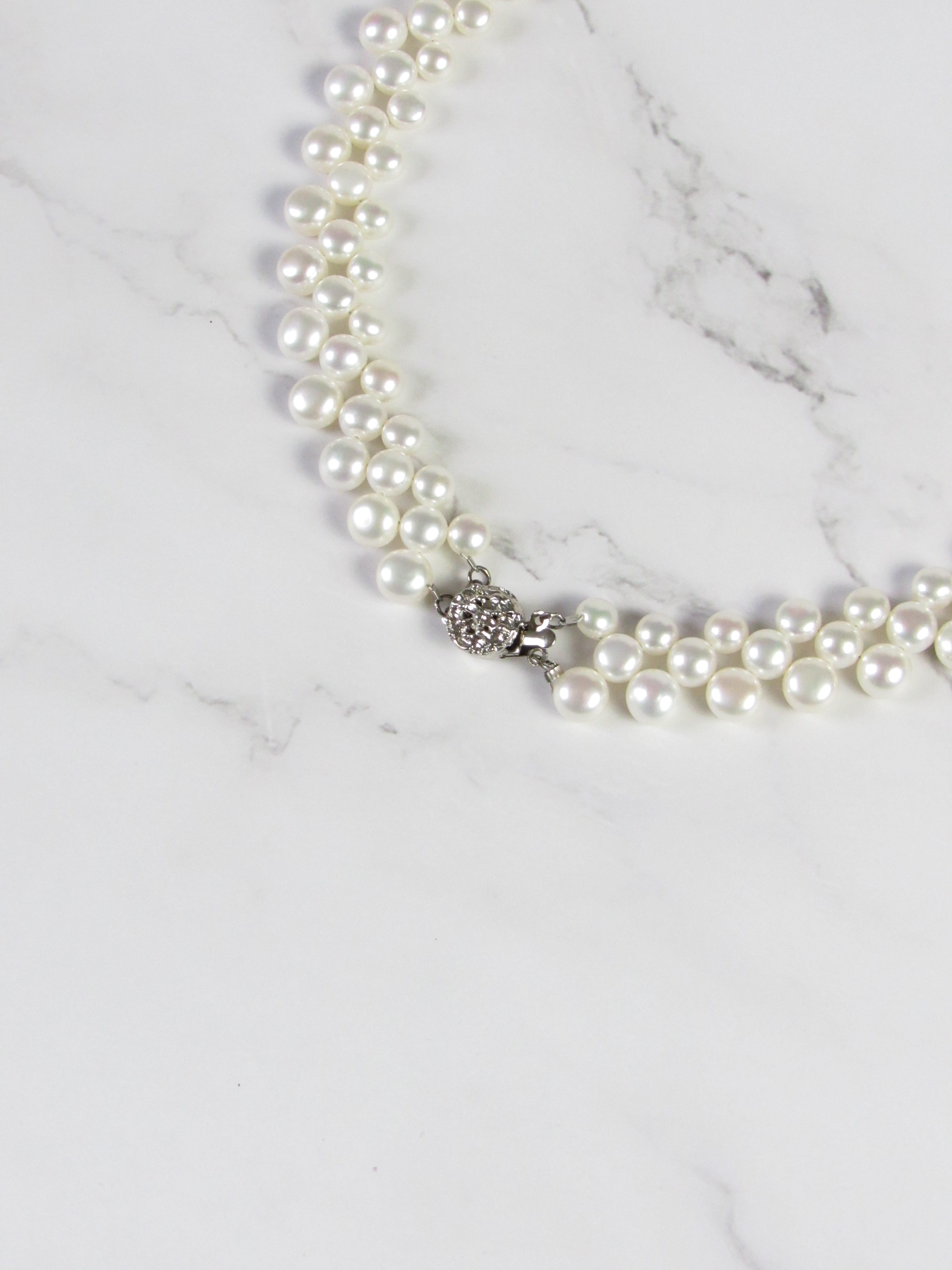 Designed with sophistication in mind, this stunning piece features gracefully layered strands of lustrous freshwater pearls, each carefully selected for their radiant glow and impeccable quality.