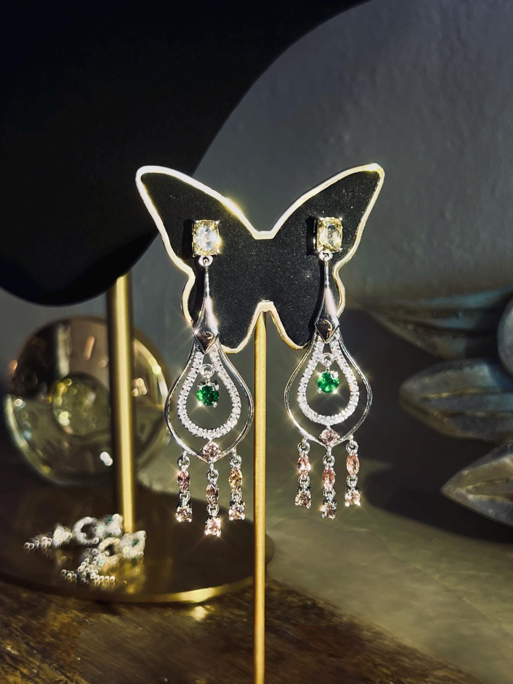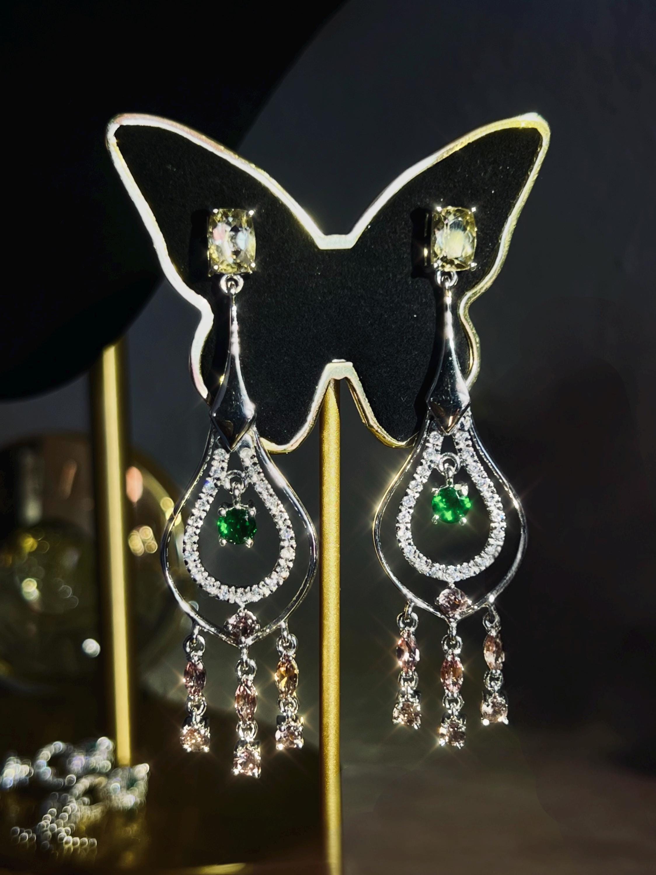 These earrings celebrate that transformation through a luminous pairing of natural Tsavorite and Malaya Color-Change Garnet, accented with Golden Beryl and White Sapphires.