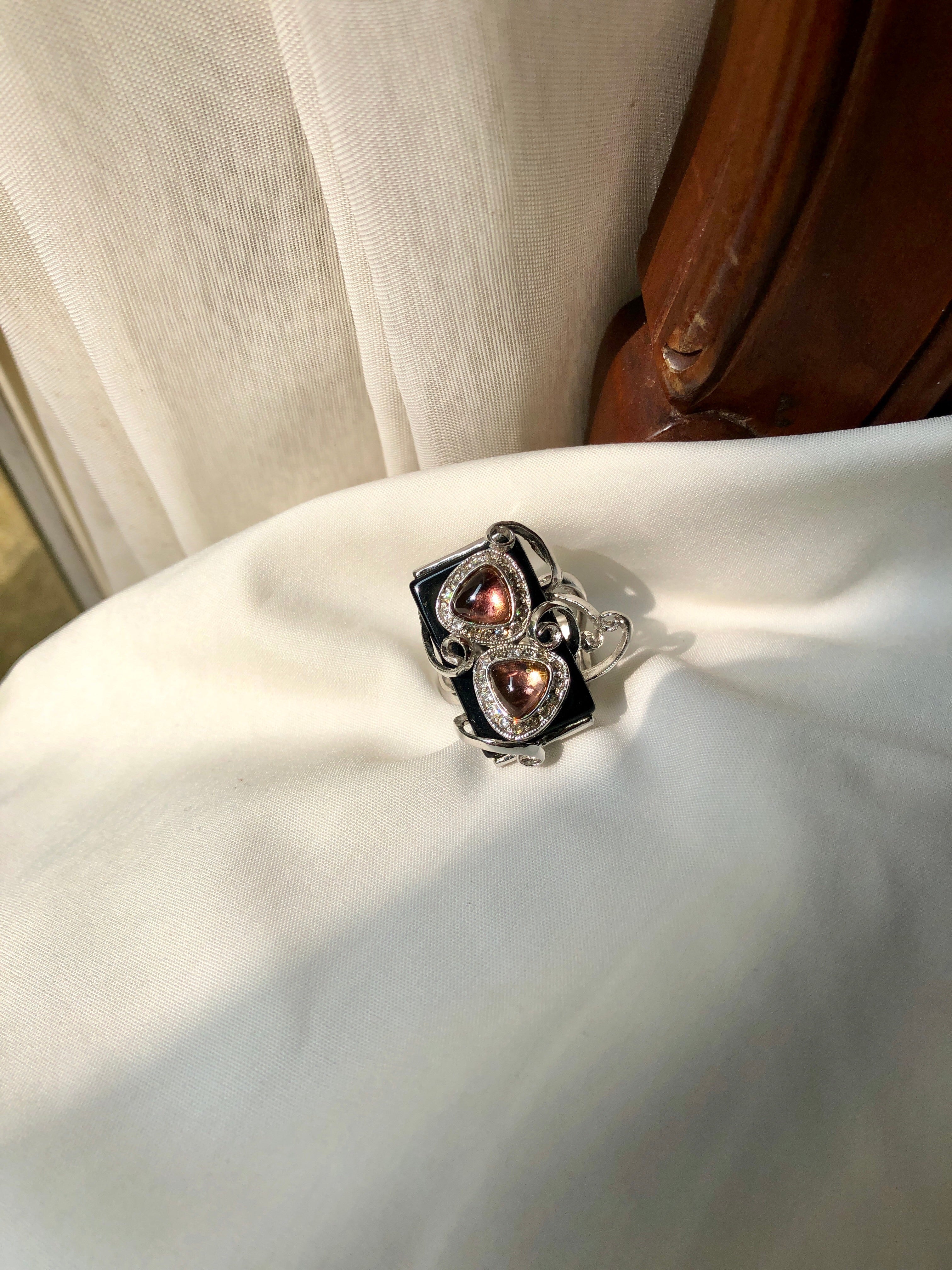 This stunning ring features two vibrant Rubellite Tourmaline twins accented by a sleek black onyx bar.