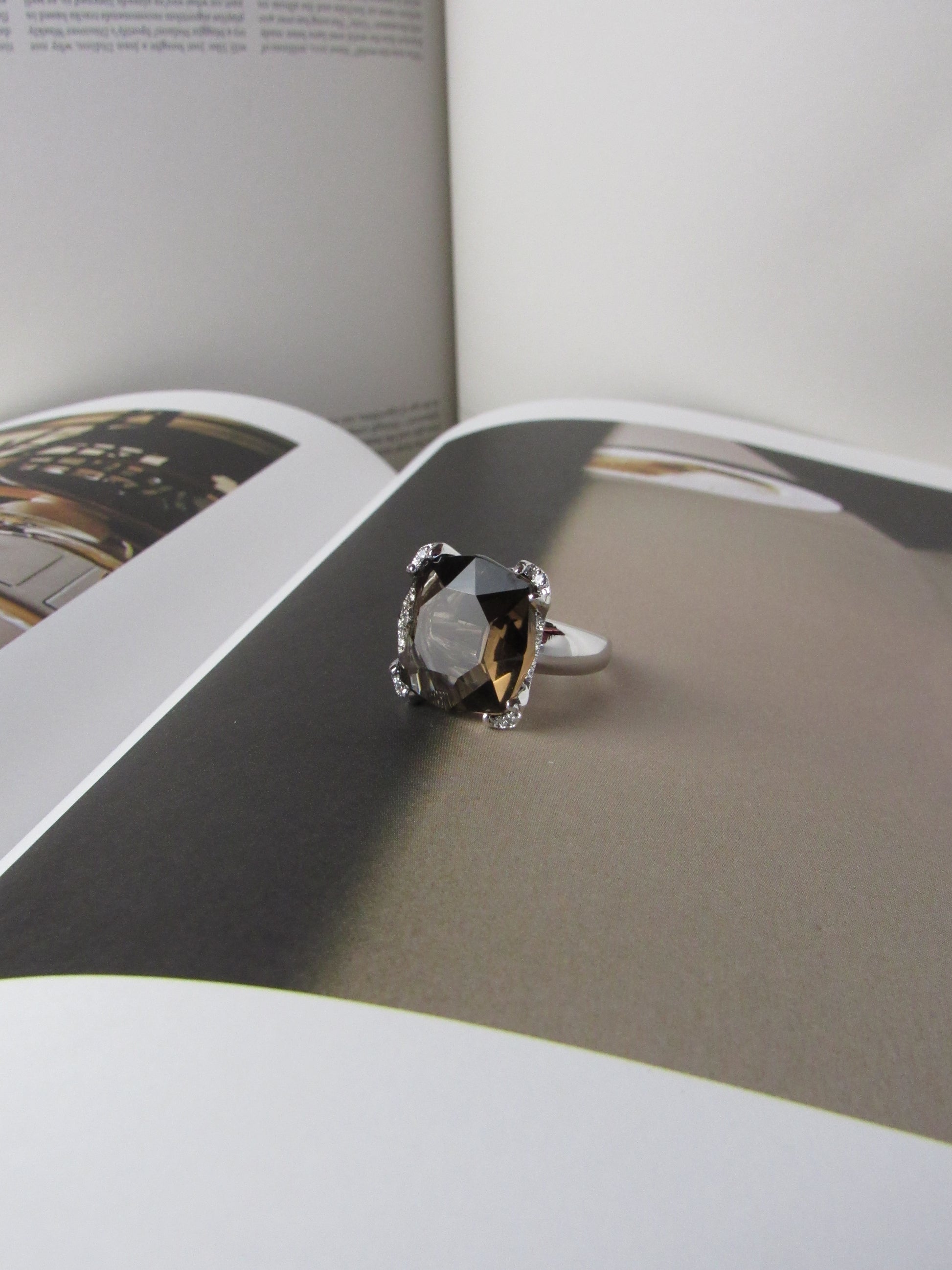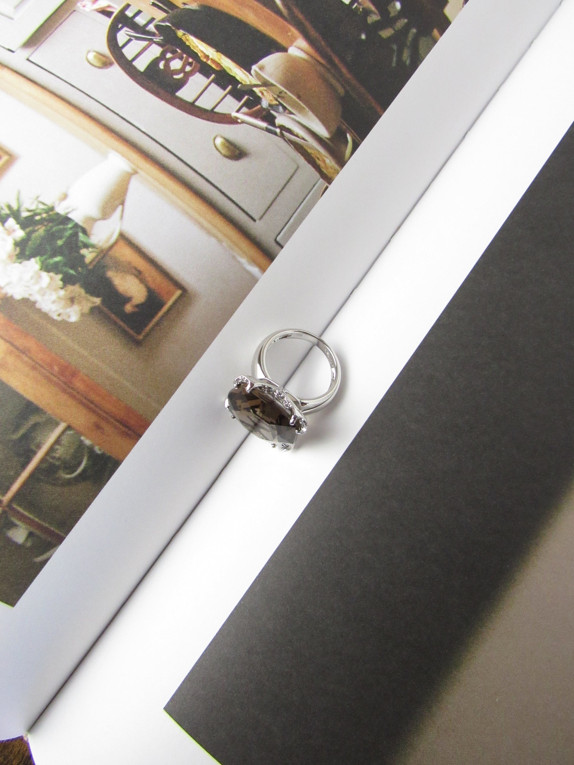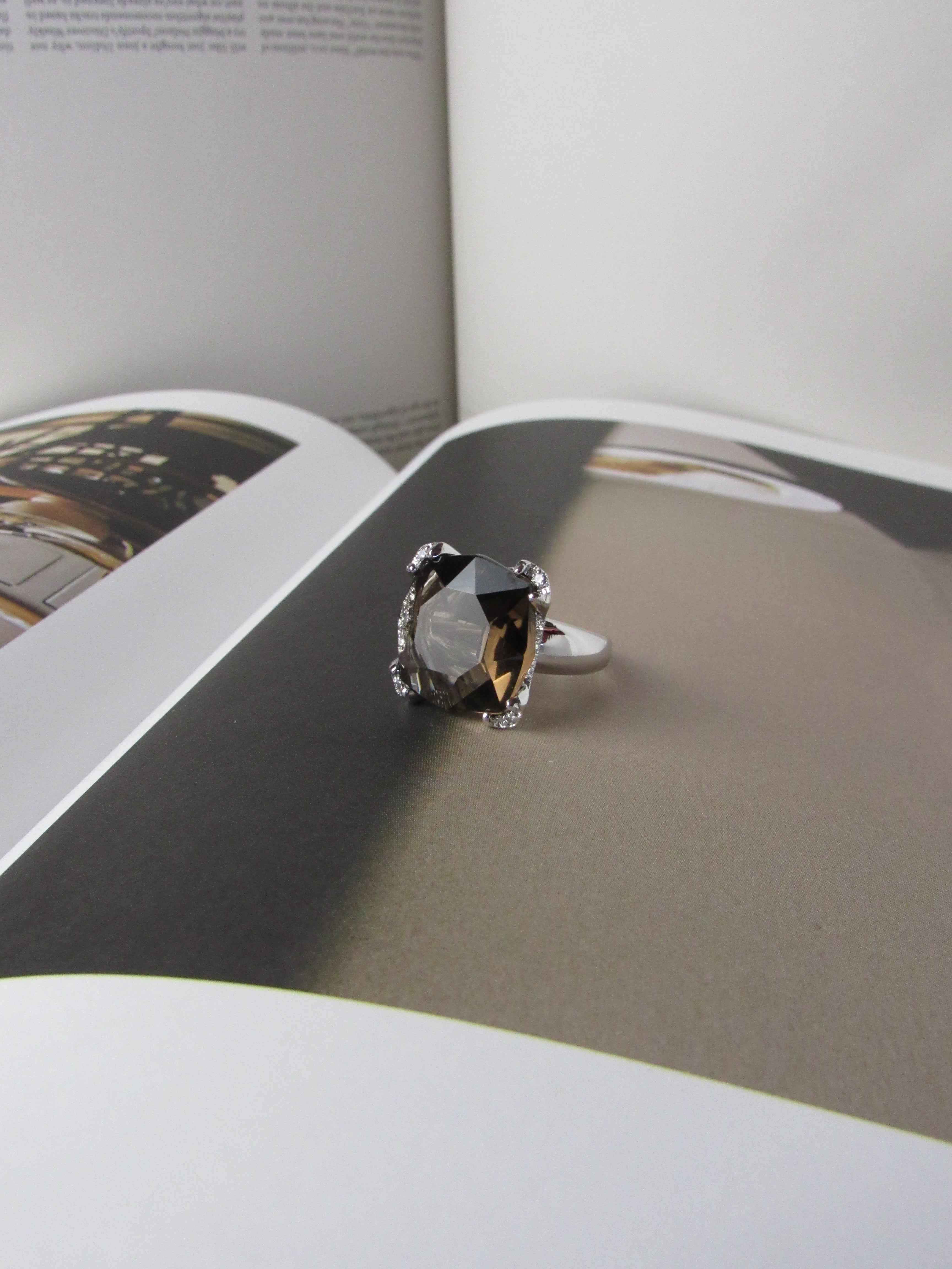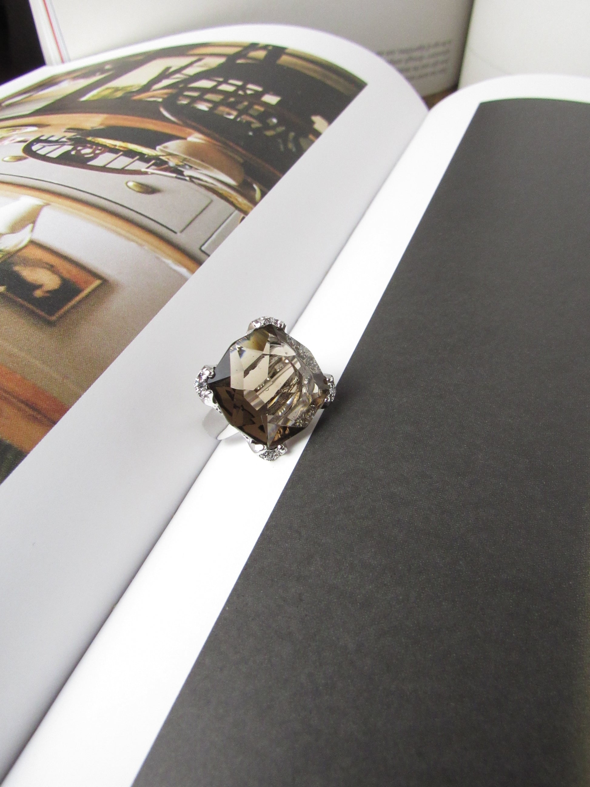 This stunning vintage inspire statement ring features a beautiful 14-carat cushion-cut smoky quartz. Its exquisite design and exceptional craftsmanship make it a timeless piece.