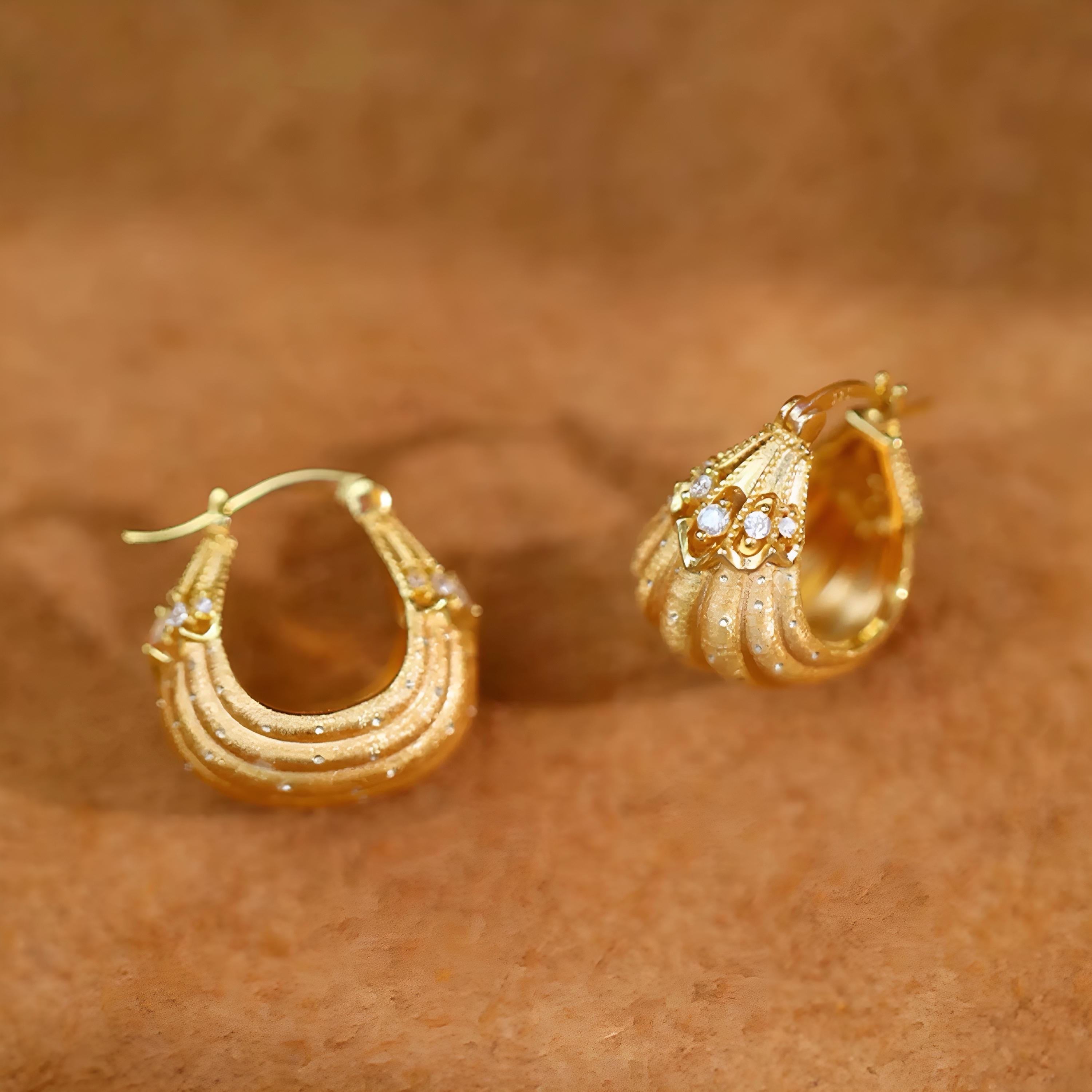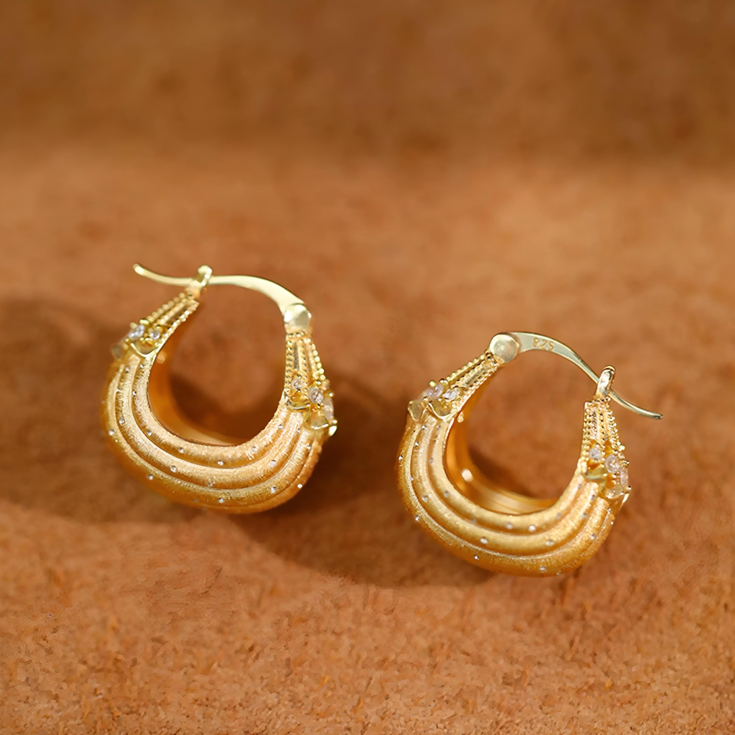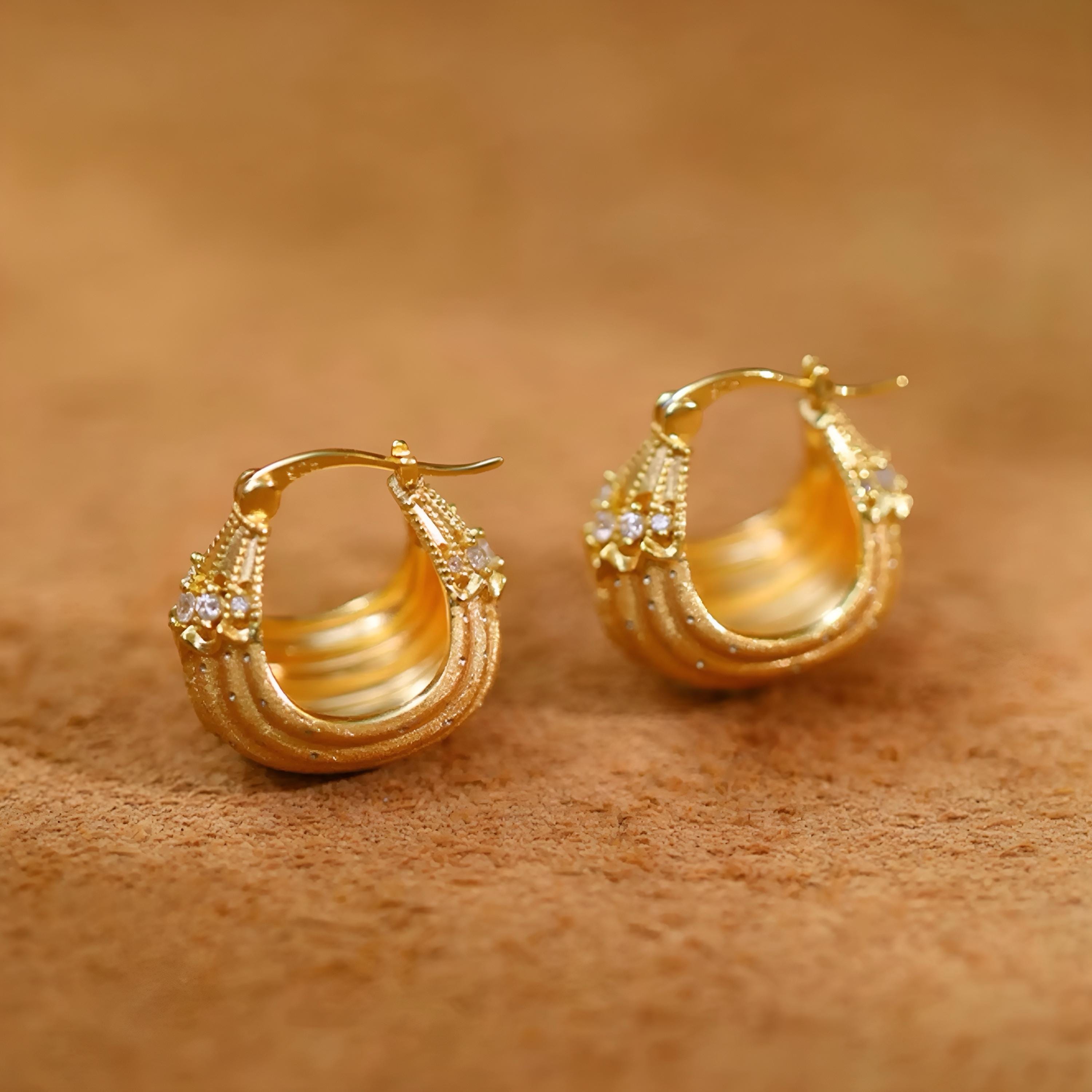 These elegant hoop earrings feature a French-inspired design, crafted with precision and attention to detail, the earrings showcase a luxurious and sophisticated aesthetic, perfect for those who appreciate jewelry with a touch of old-world charm. unique, small-batch piece that exudes timeless elegance.
