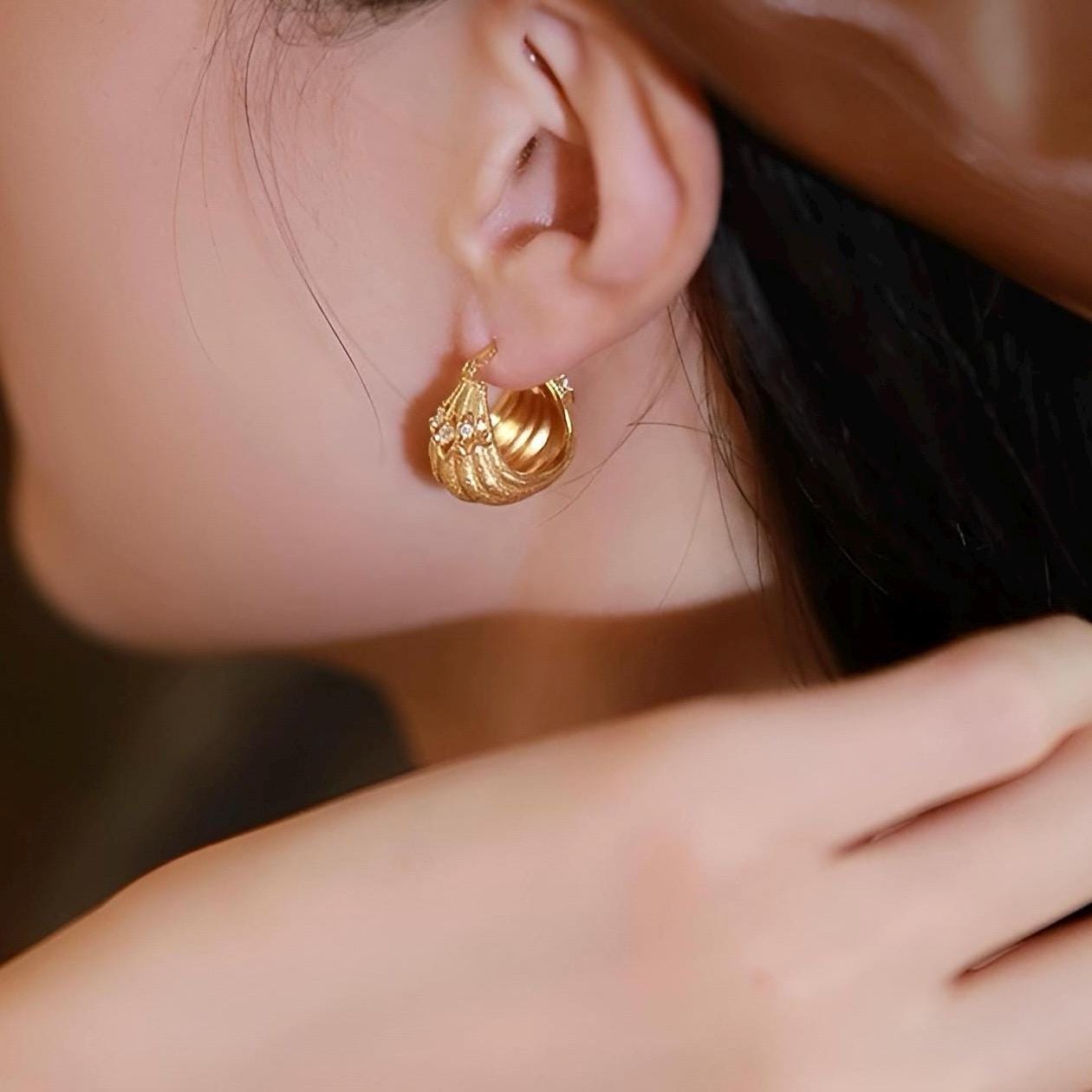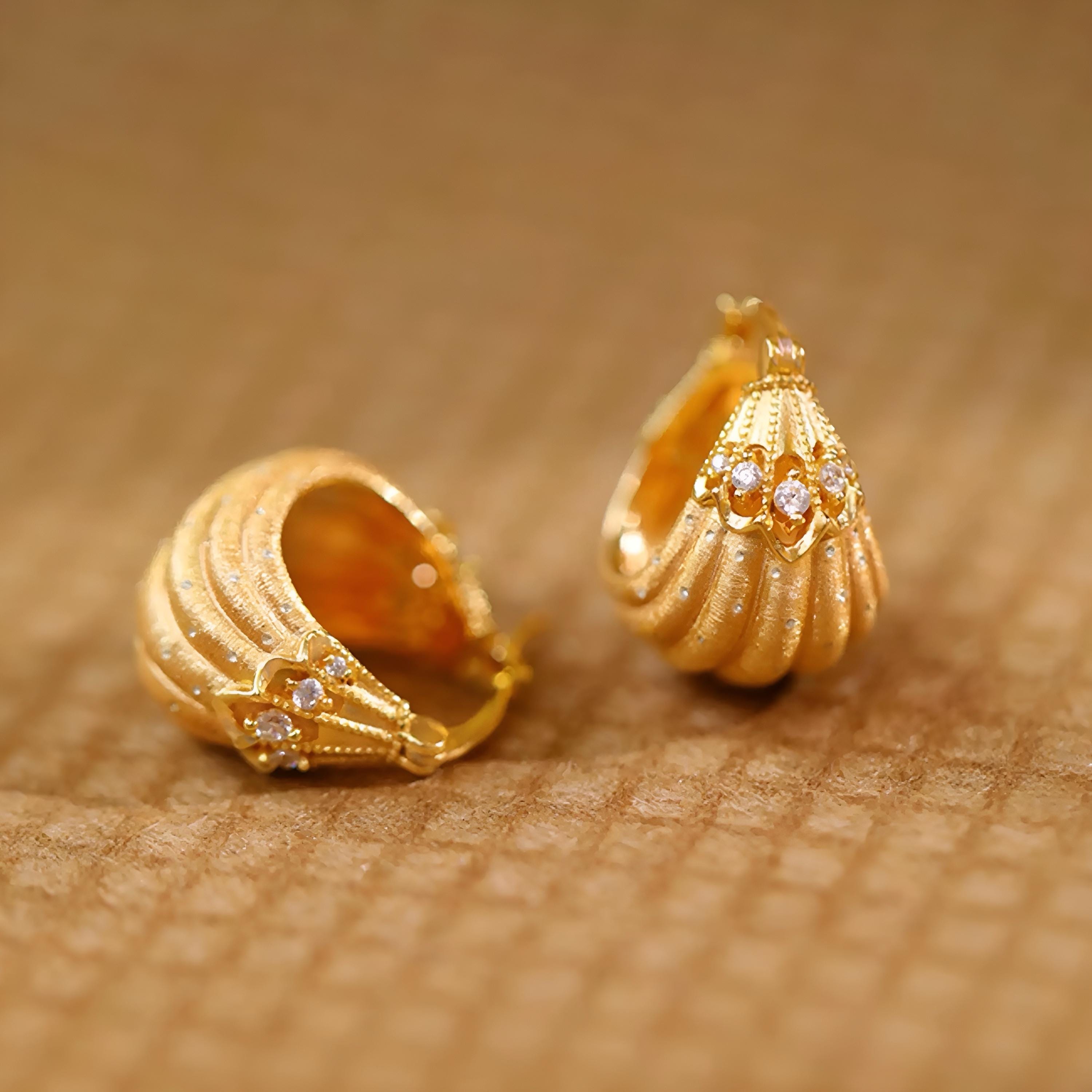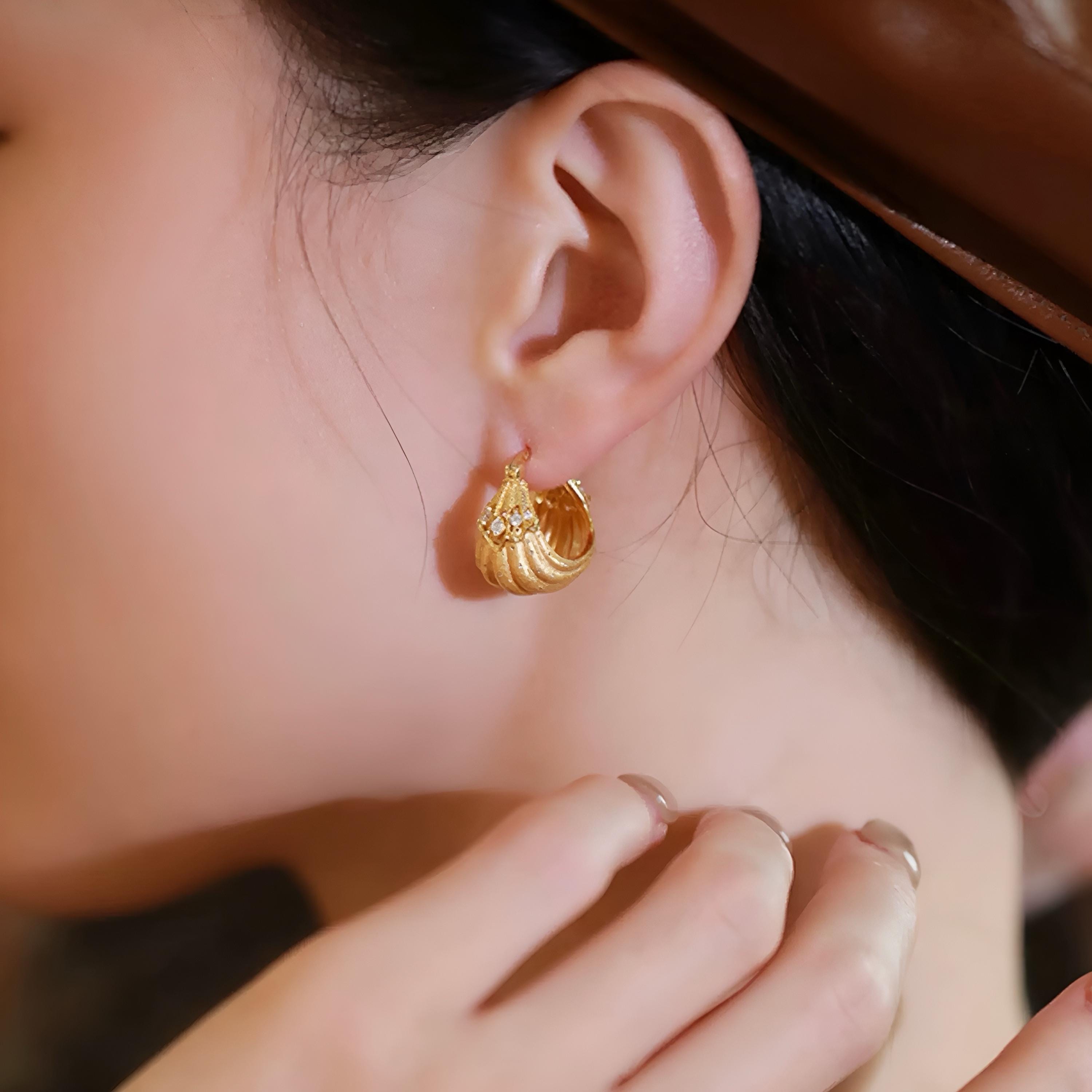 These elegant hoop earrings feature a French-inspired design, crafted with precision and attention to detail, the earrings showcase a luxurious and sophisticated aesthetic, perfect for those who appreciate jewelry with a touch of old-world charm. unique, small-batch piece that exudes timeless elegance.