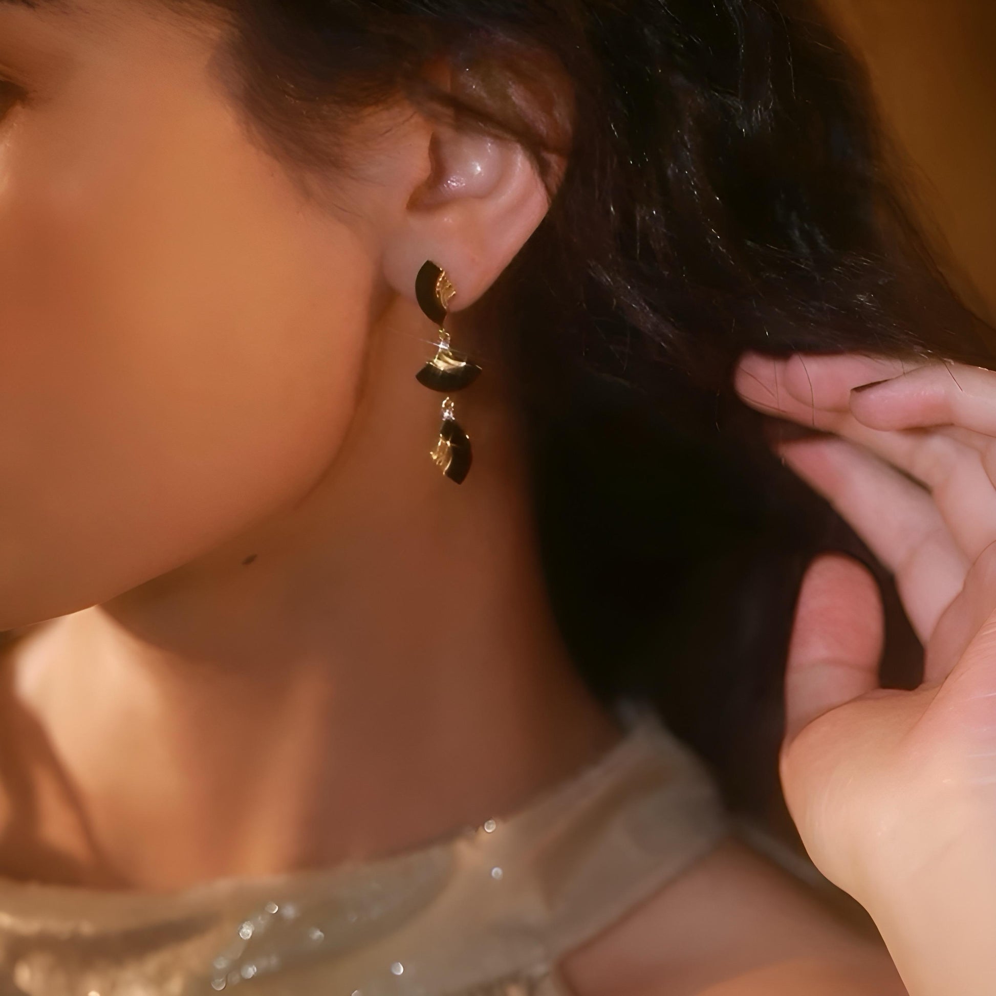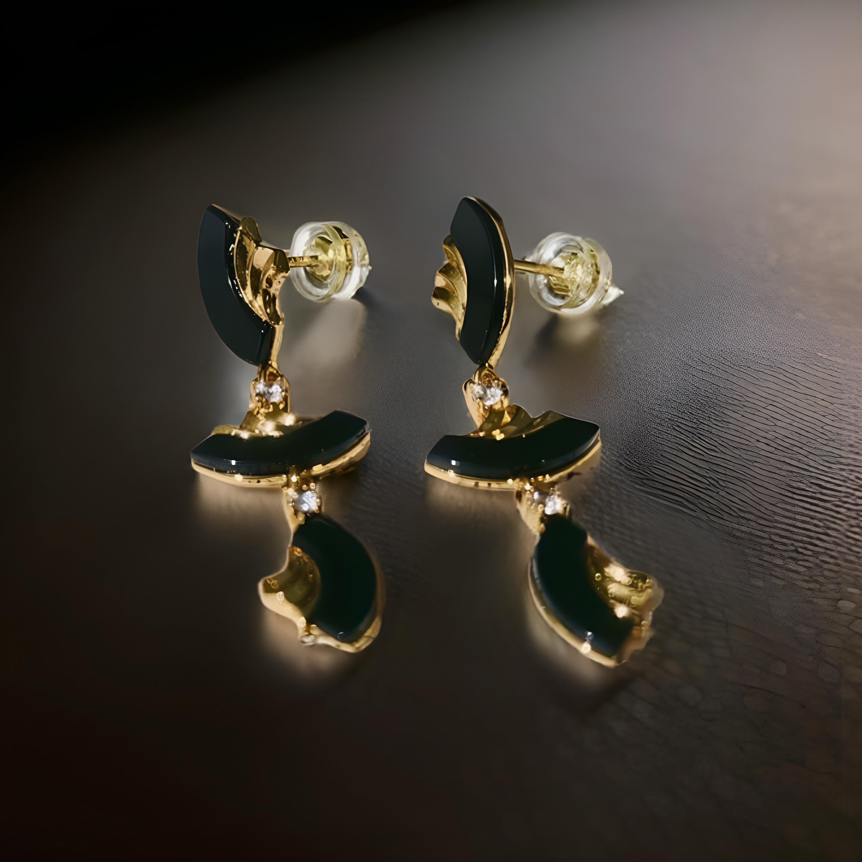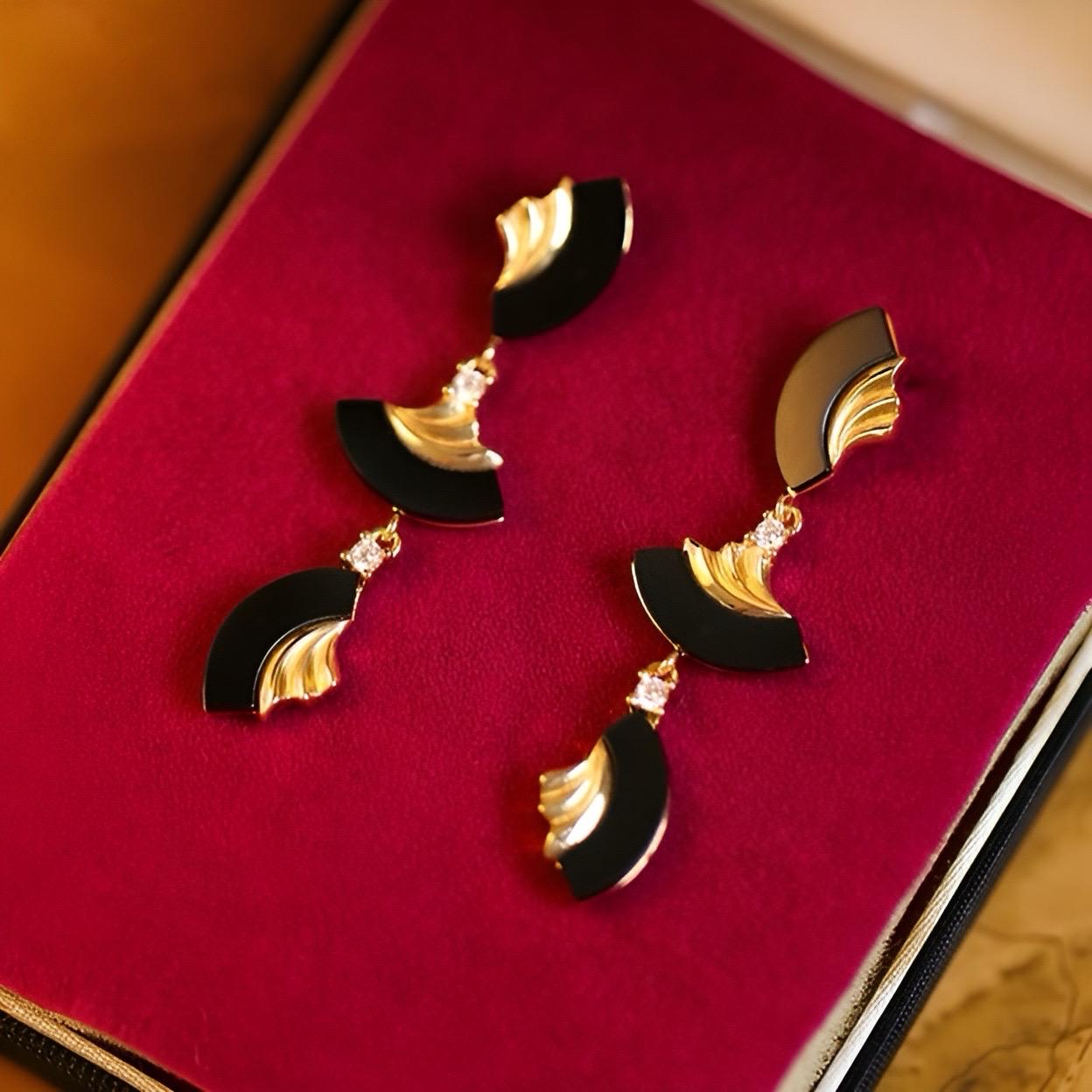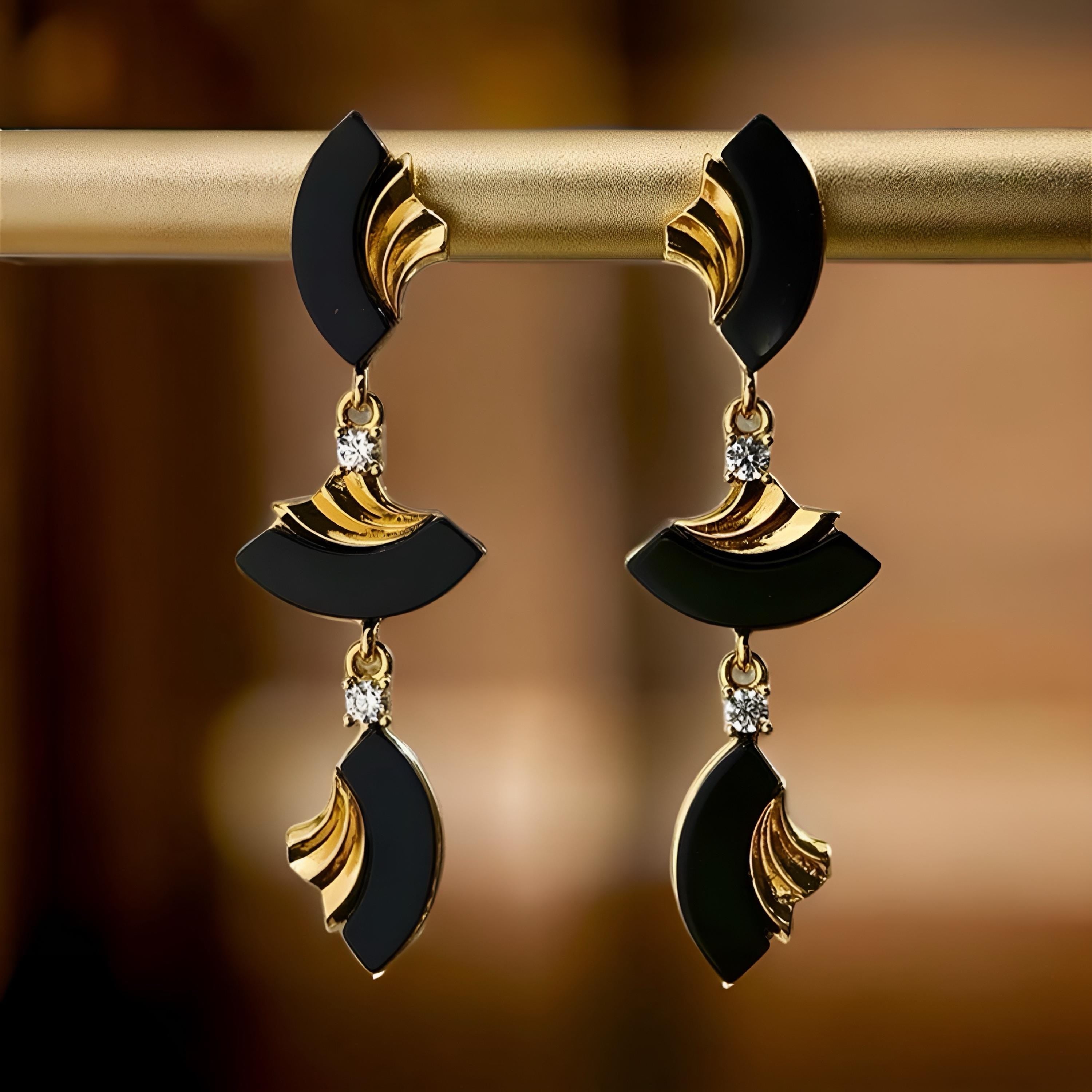 These statement earrings are a perfect blend of timeless Art Deco elegance and modern sophistication. Featuring fan-shaped black onyx details paired with gleaming gold accents and sparkling crystals, the earrings showcase a luxurious and sophisticated aesthetic, perfect for those who appreciate jewelry with a touch of old-world charm. unique, small-batch piece that exudes timeless elegance.