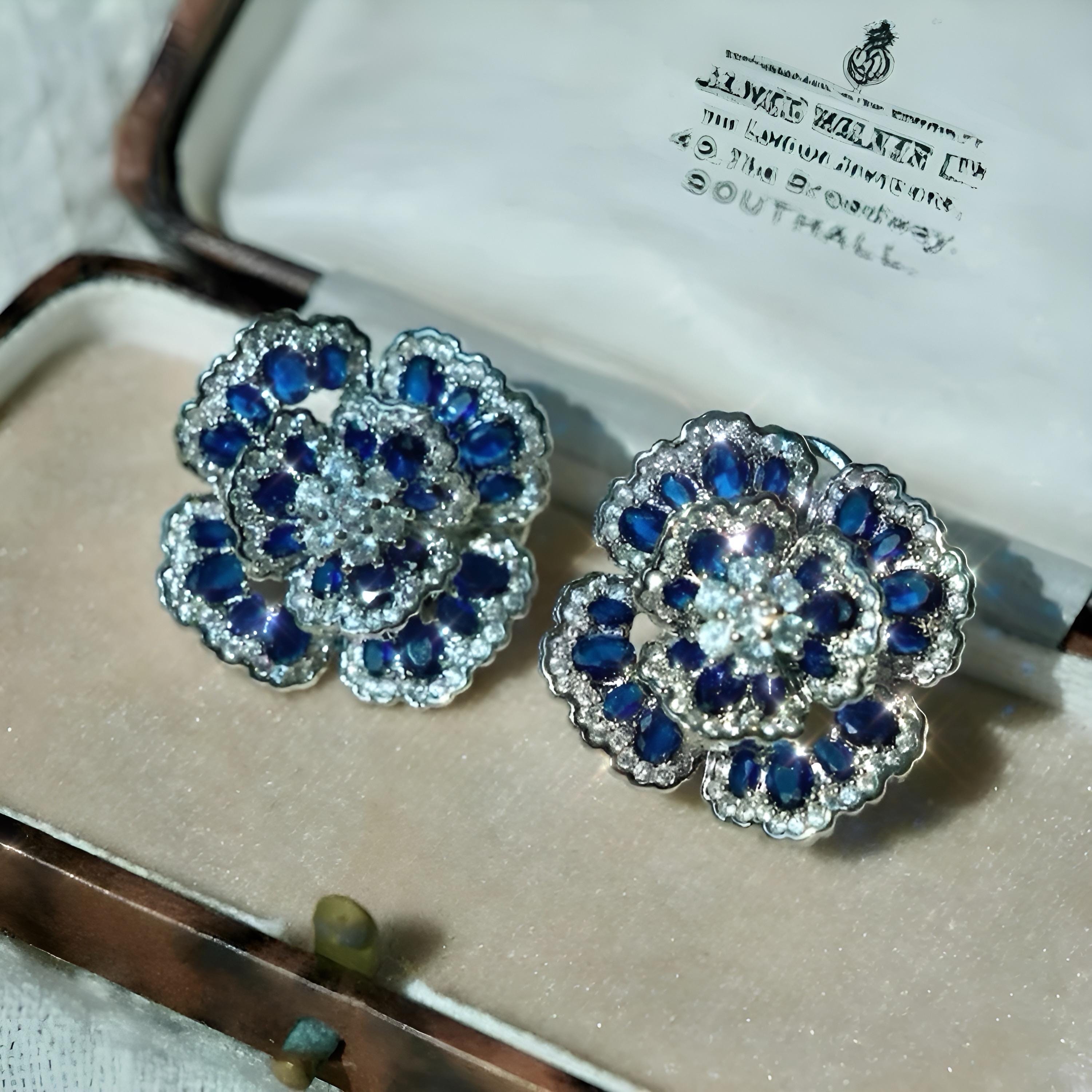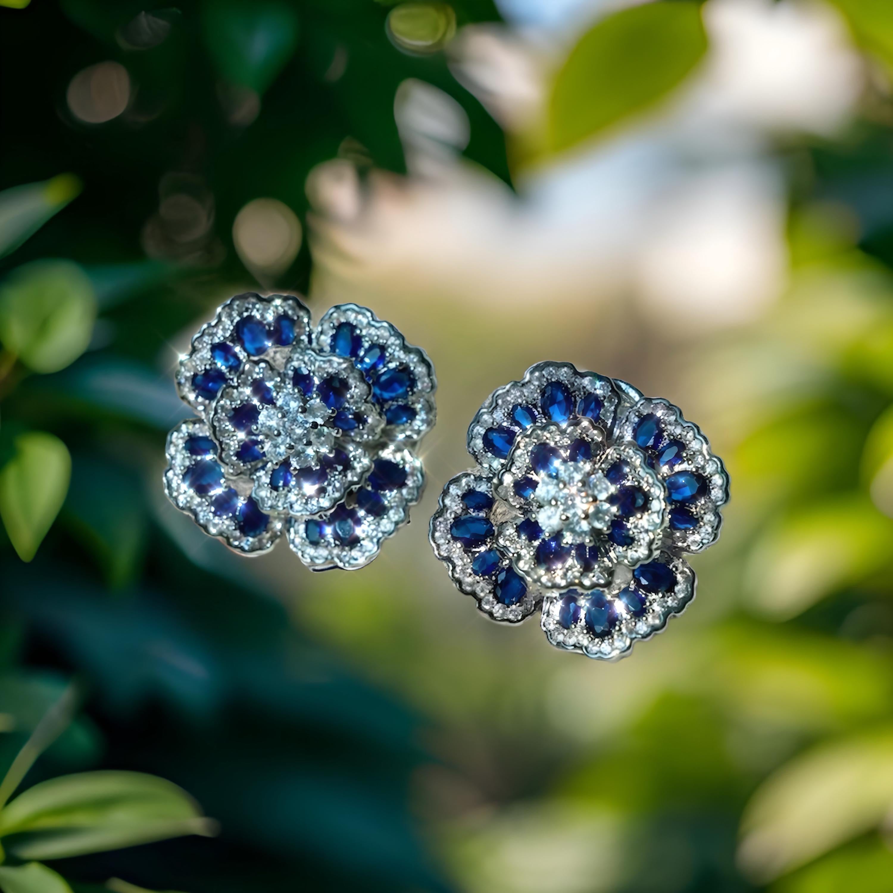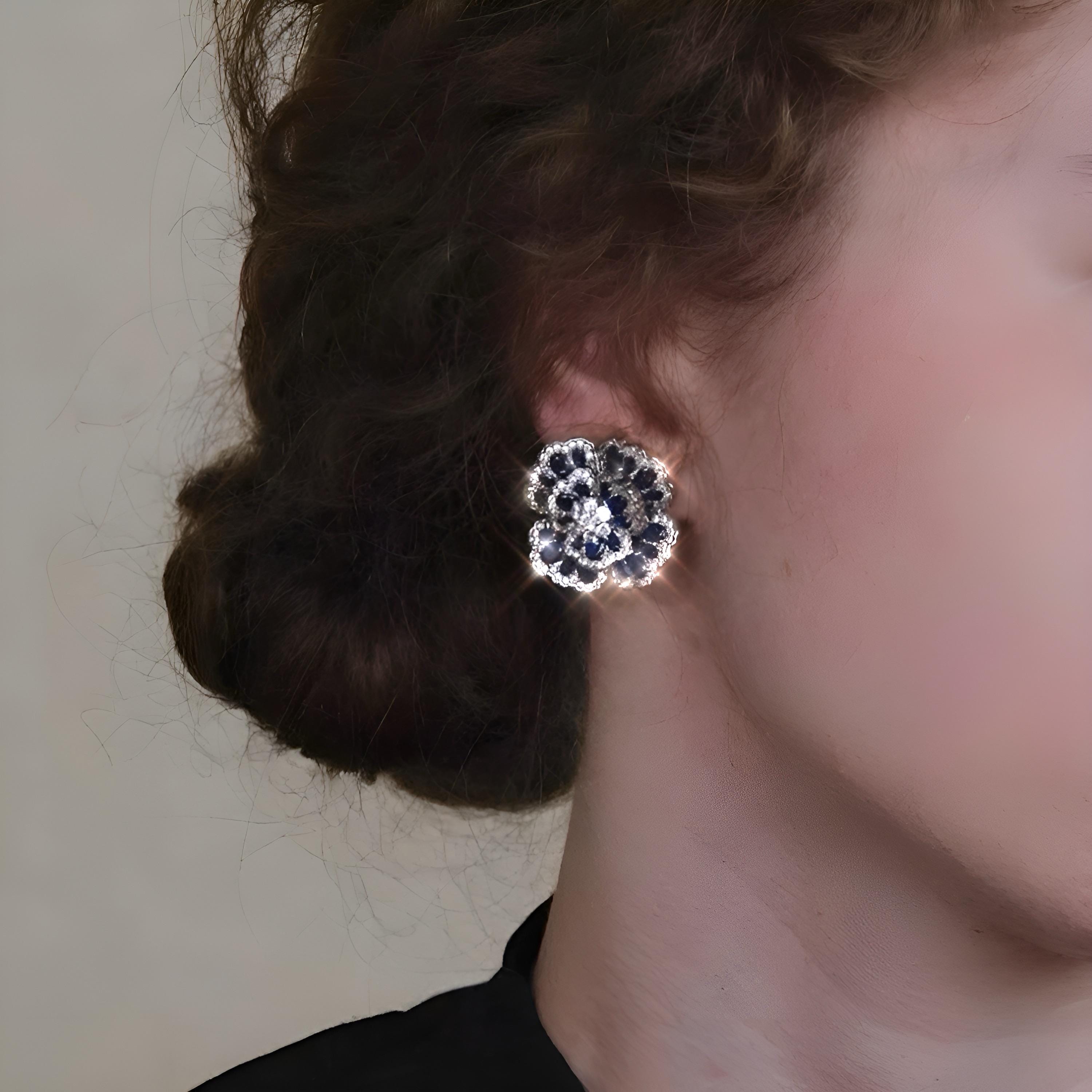 Vintage French-Inspired Small-Batch Artisanal Earrings with Diamonds and Blue Sapphires, Camellia Sapphire Earrings, gift for her