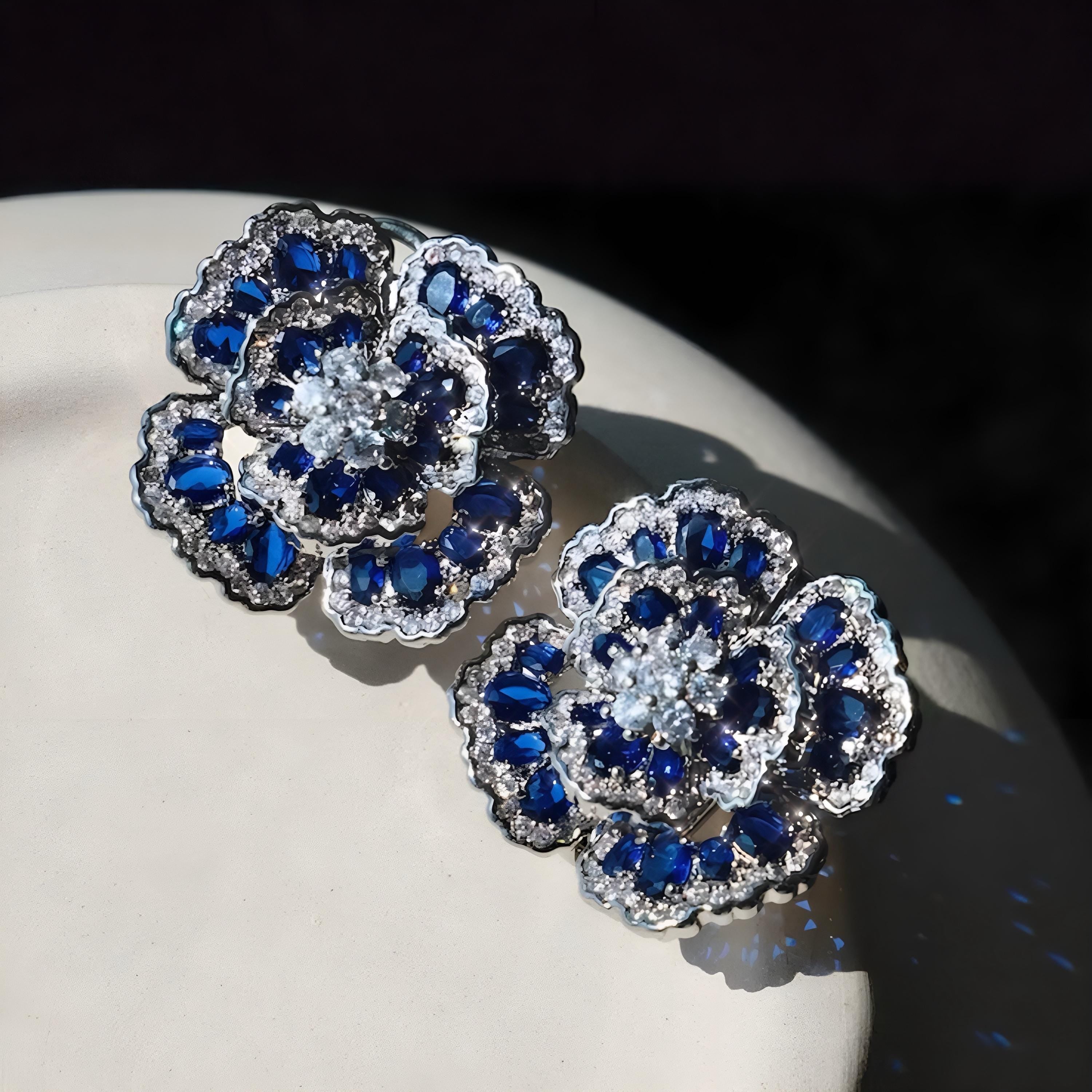 These stunning Camellia Sapphire Earrings feature a French-inspired design, combining round-cut zircon with blue sapphires. Crafted with precision and attention to detail, the earrings showcase a luxurious and sophisticated aesthetic, perfect for those who appreciate jewelry with a touch of old-world charm. unique, small-batch piece that exudes timeless elegance.