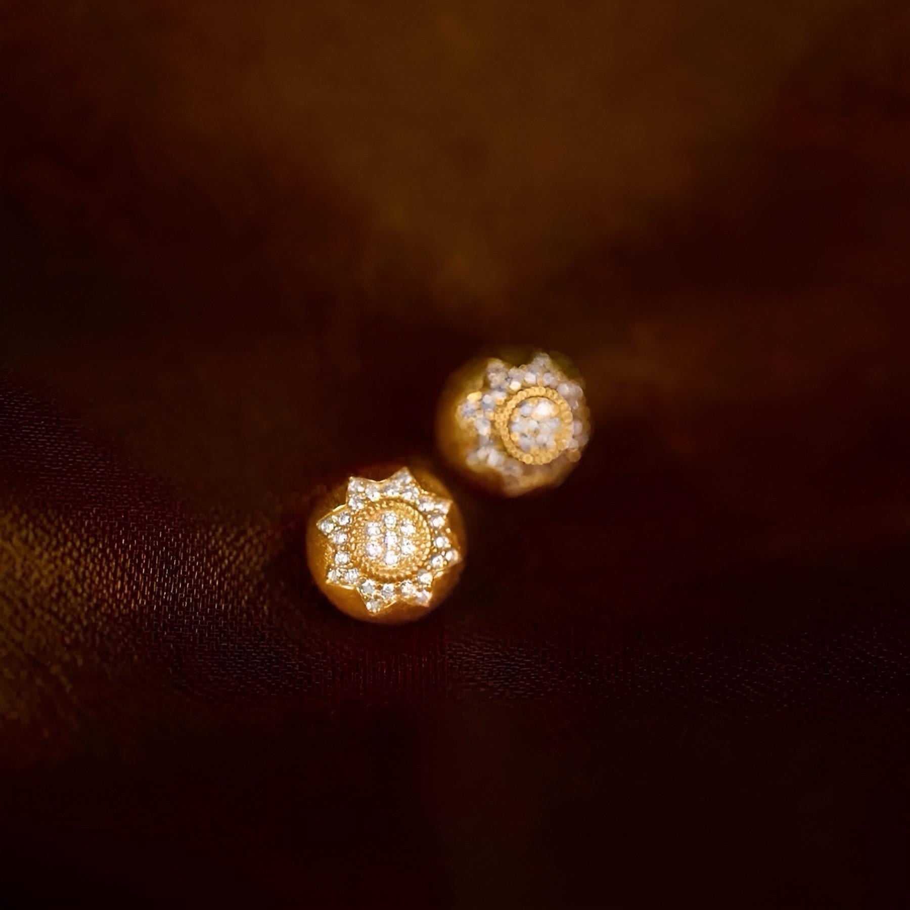 These 18K gold vermeil stud earrings are a love letter to French elegance and artistry. Their intricate design features a golden flower motif set with shimmering pave diamonds, creating a soft yet radiant sparkle that catches the light beautifully.