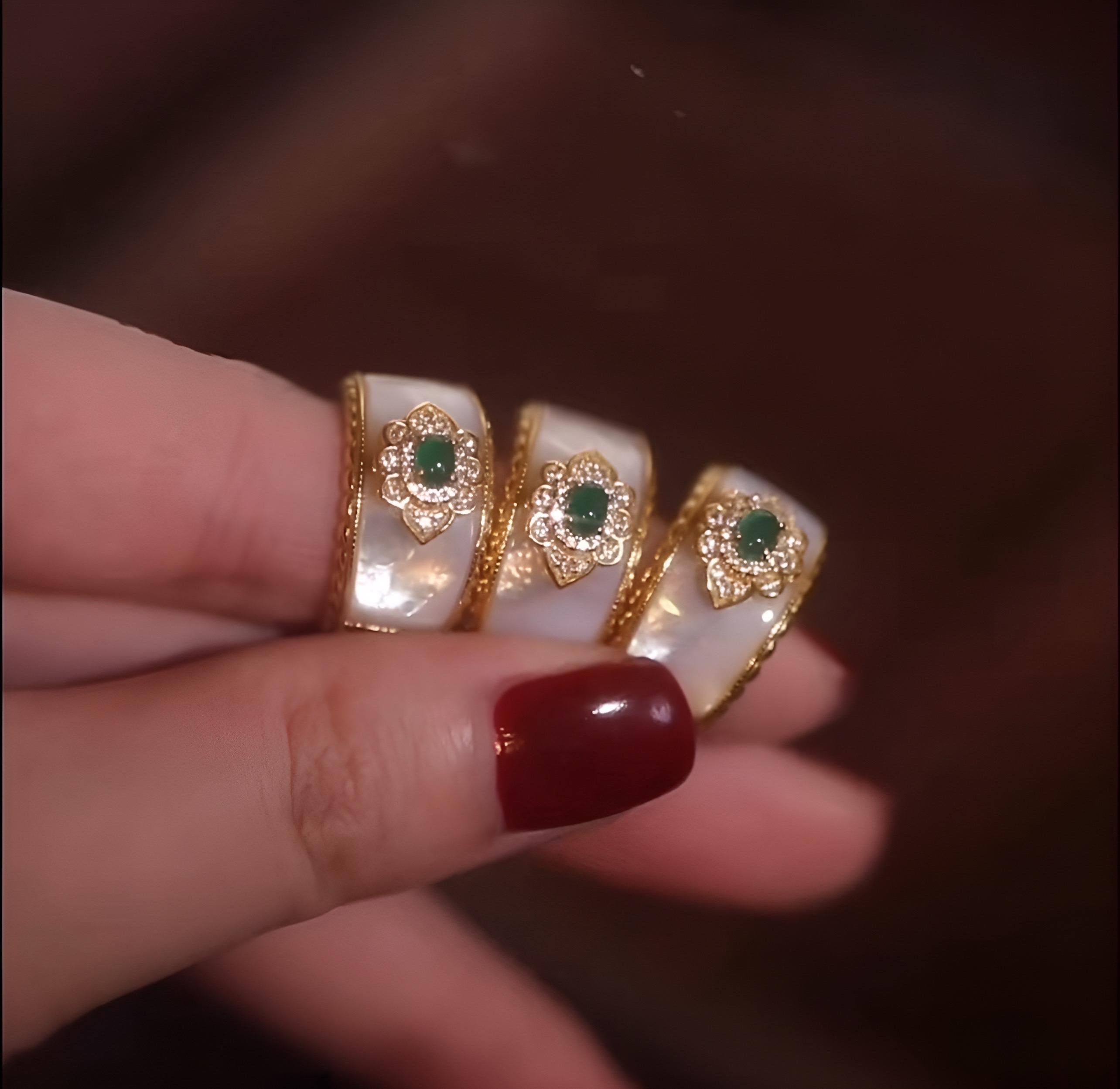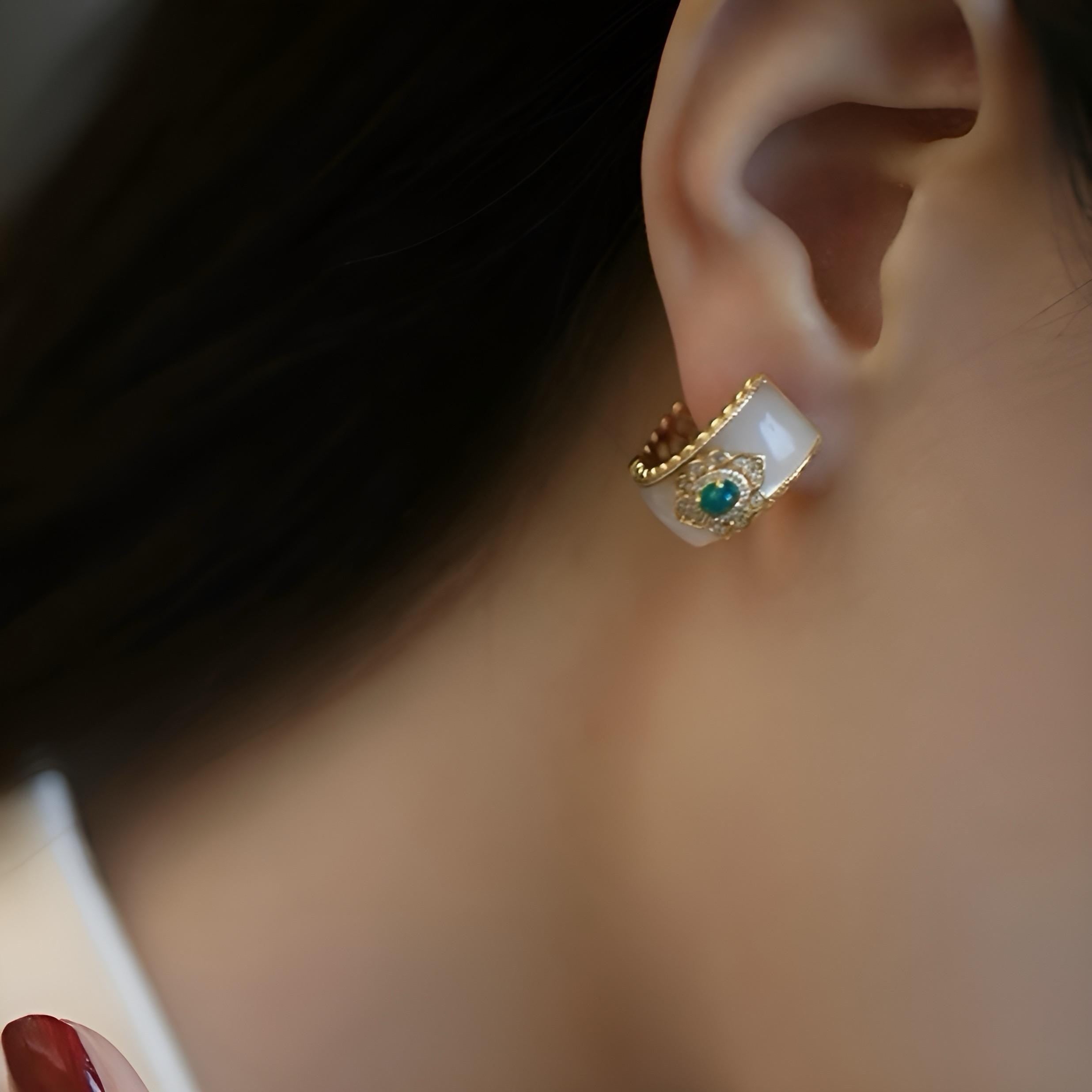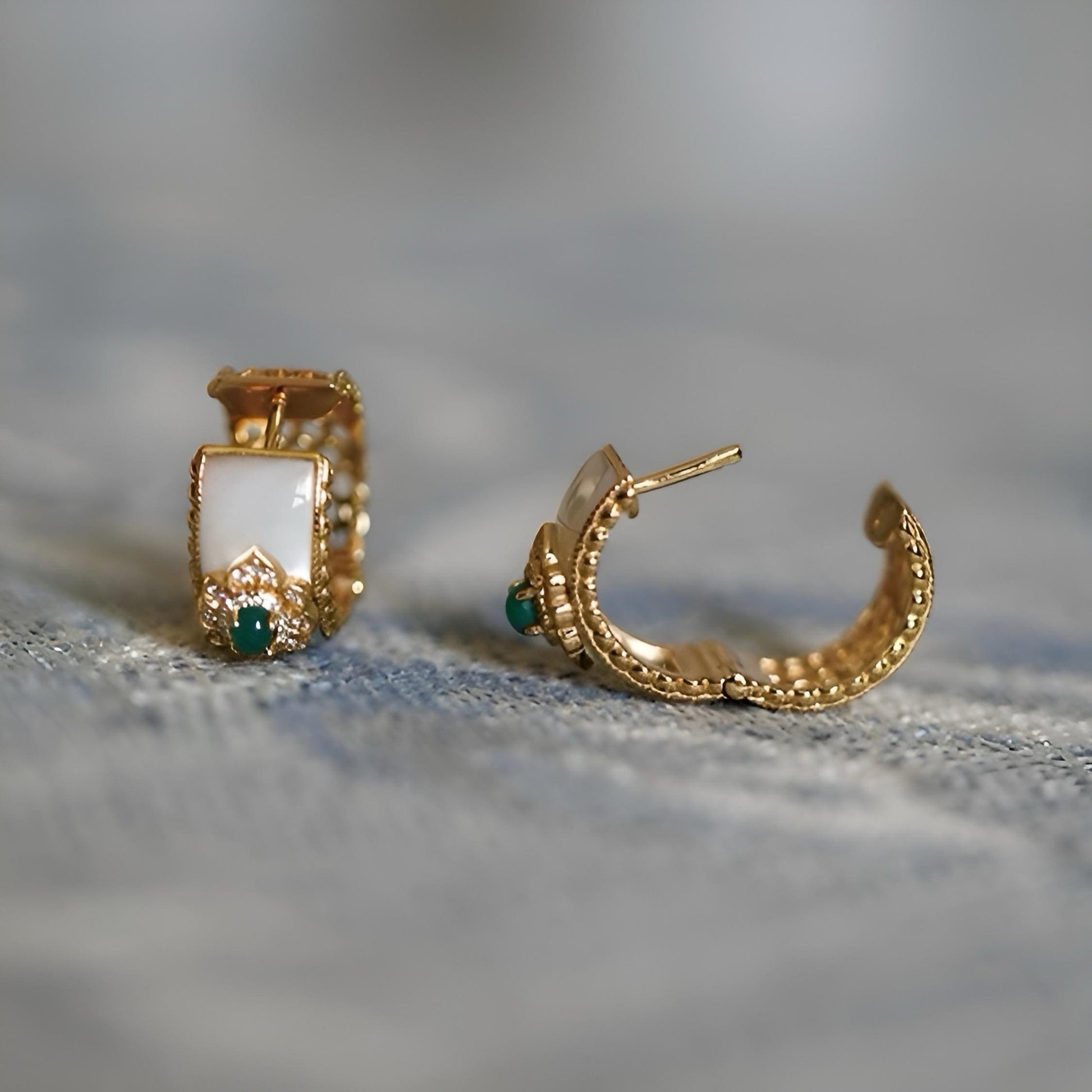 These elegant earrings feature a French-inspired design, combining cabochon green jade and round-cut zircon with mother of pearl . Crafted with precision and attention to detail, the earrings showcase a luxurious and sophisticated aesthetic, perfect for those who appreciate jewelry with a touch of old-world charm. unique, small-batch piece that exudes timeless elegance.