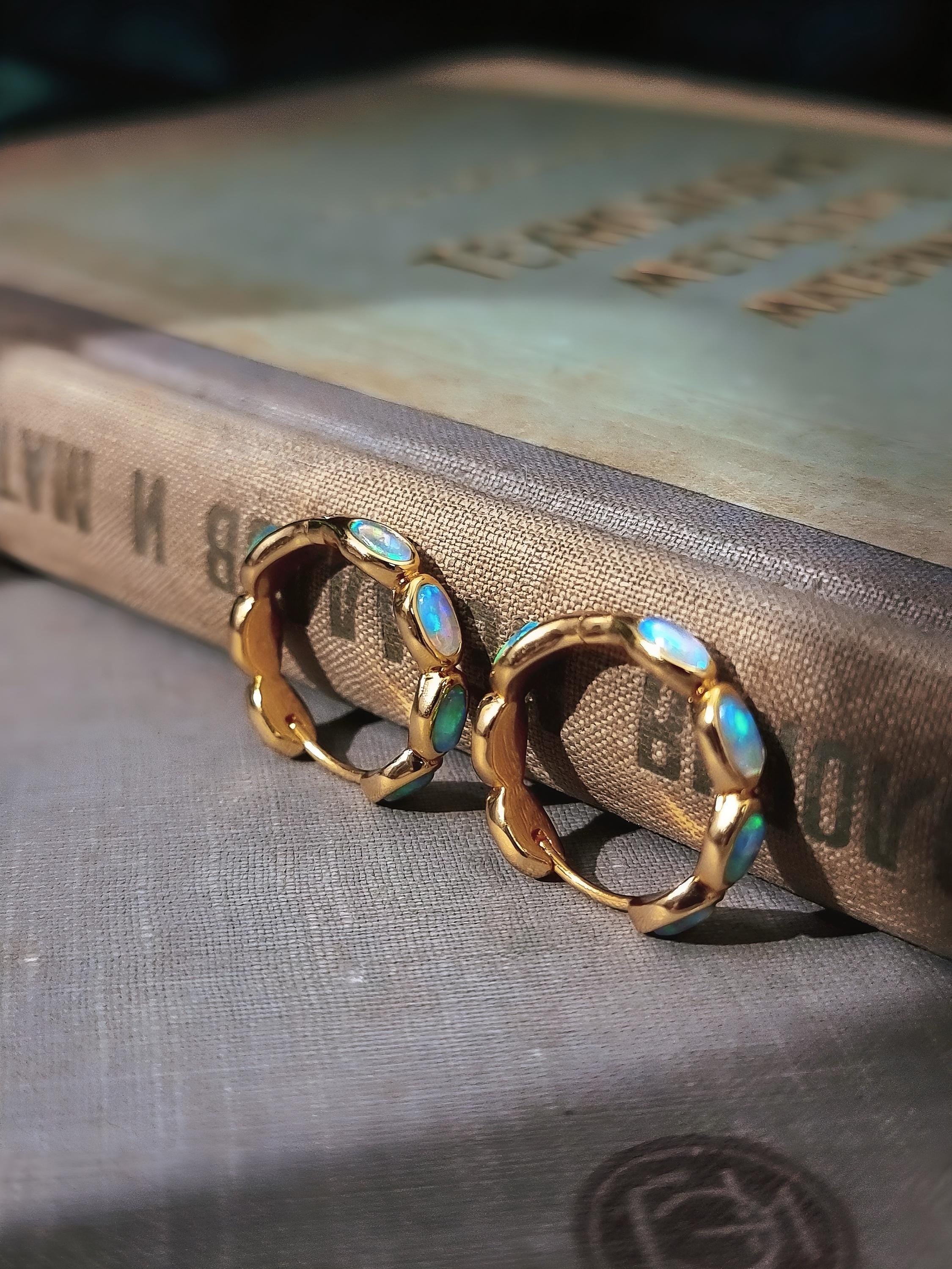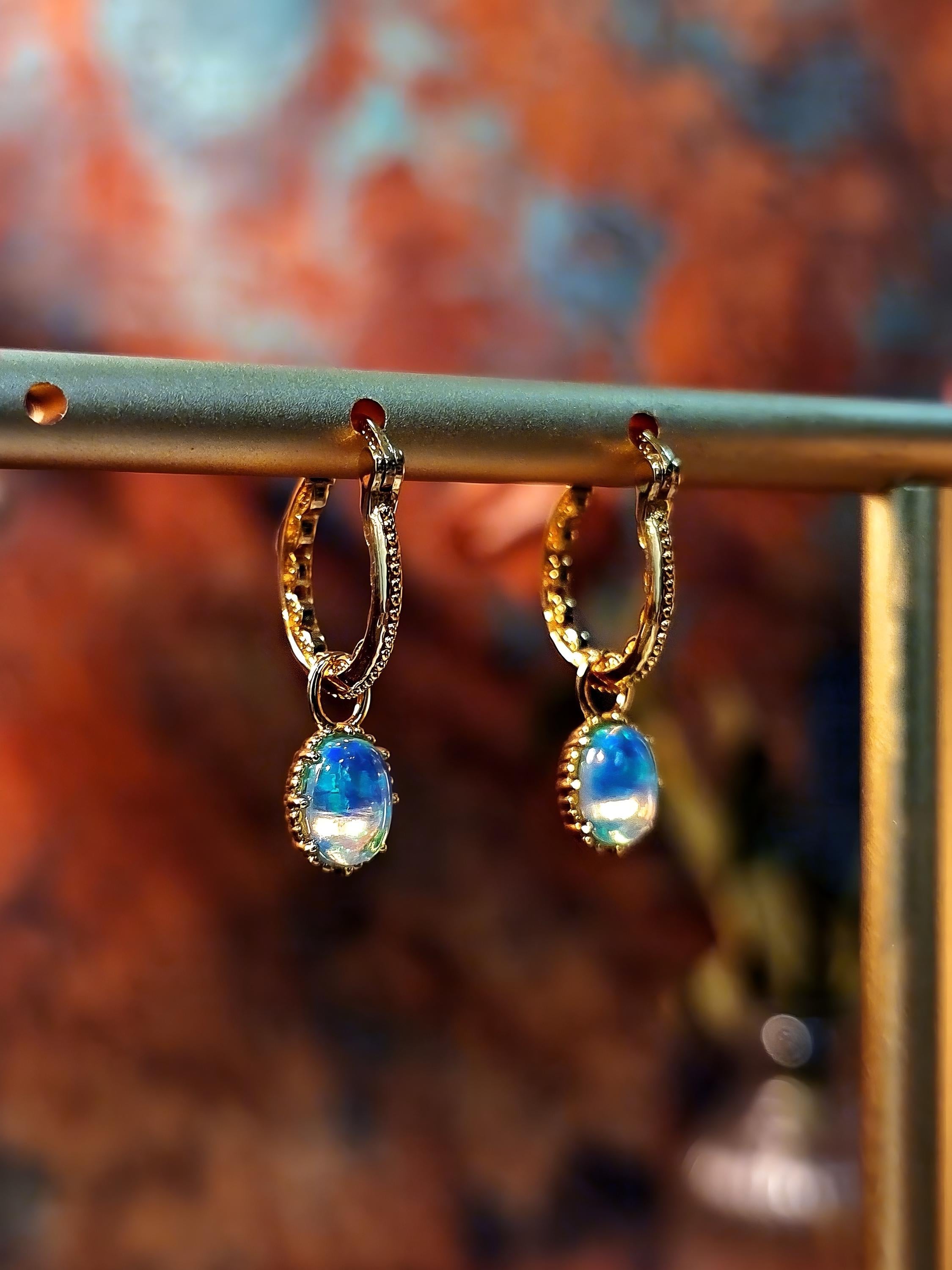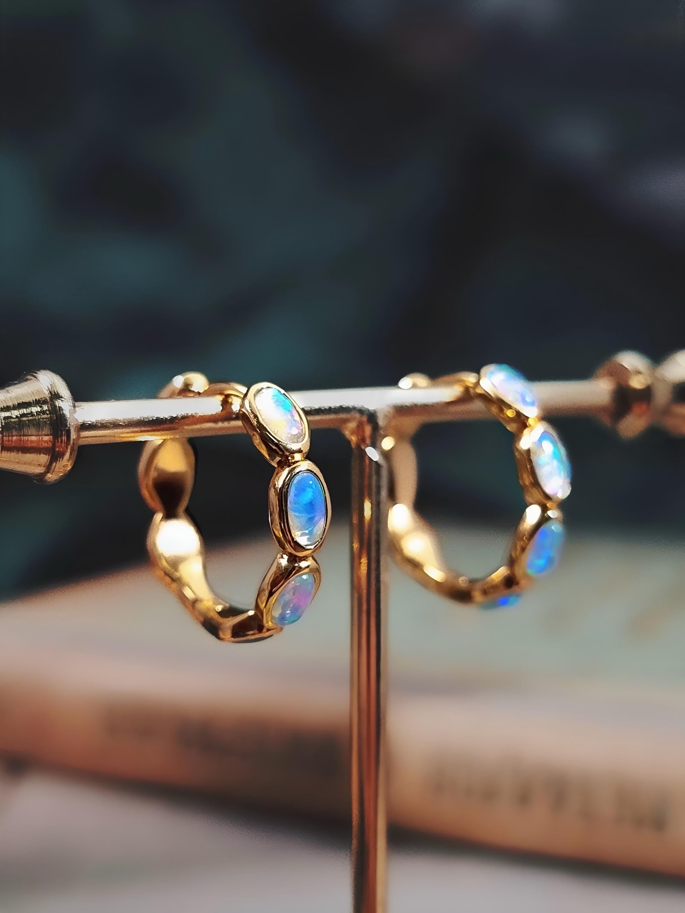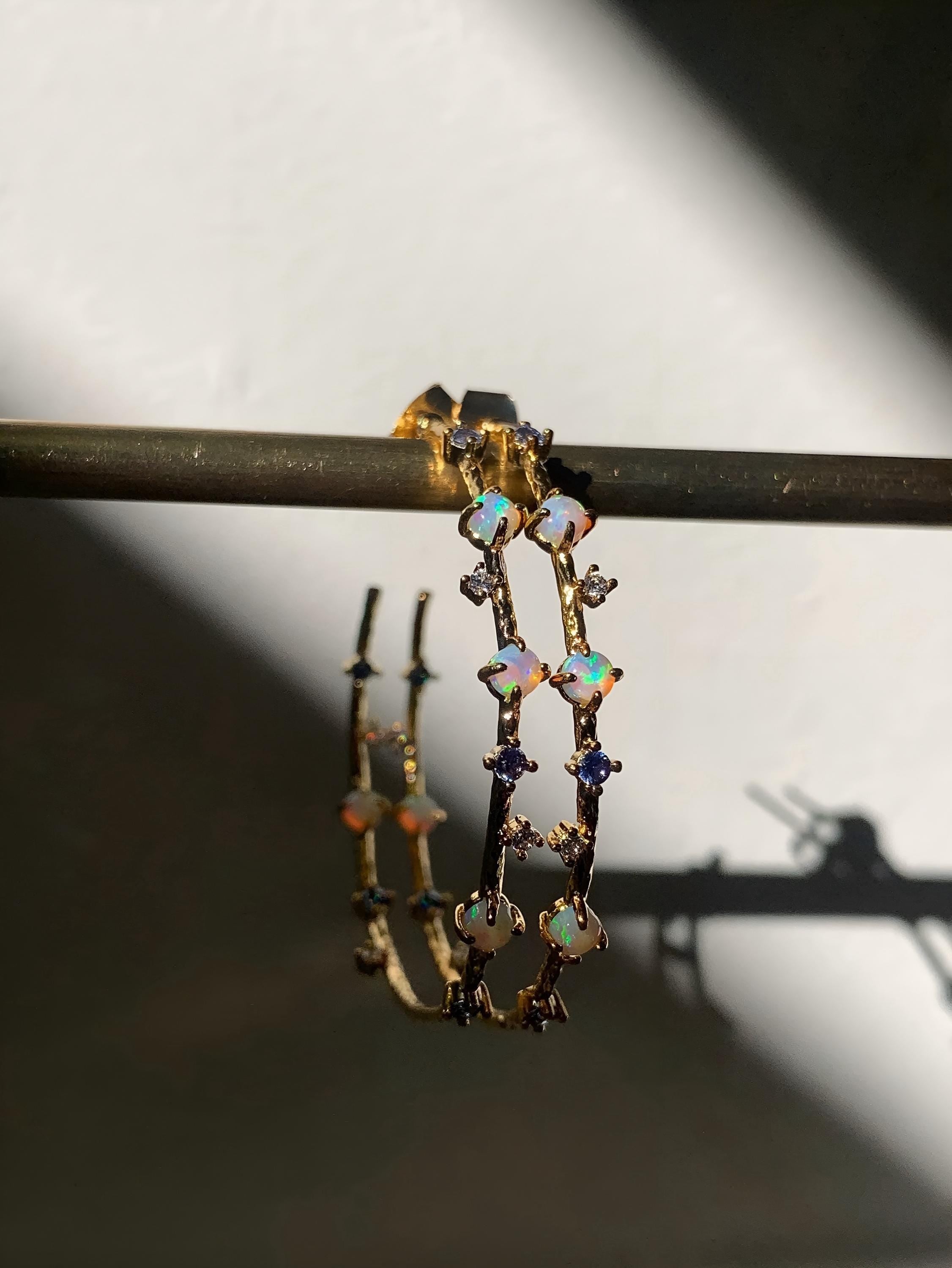 These elegant hoop earrings feature a French-inspired effortless design, combining Japanese opal with sapphires. Crafted with precision and attention to detail, the earrings showcase a luxurious and sophisticated aesthetic, perfect for those who appreciate jewelry with a touch of old-world charm. unique, small-batch piece that exudes timeless elegance.