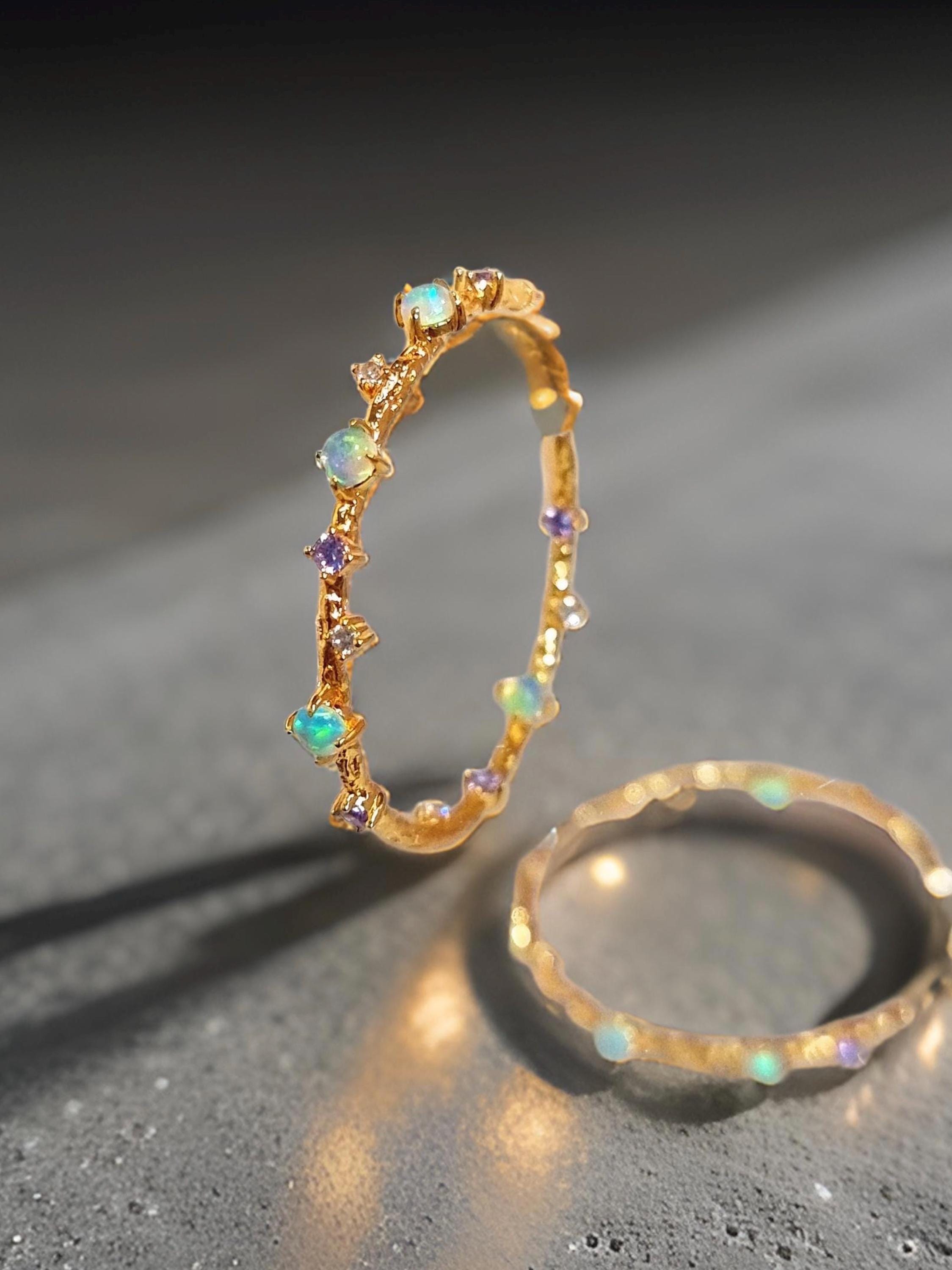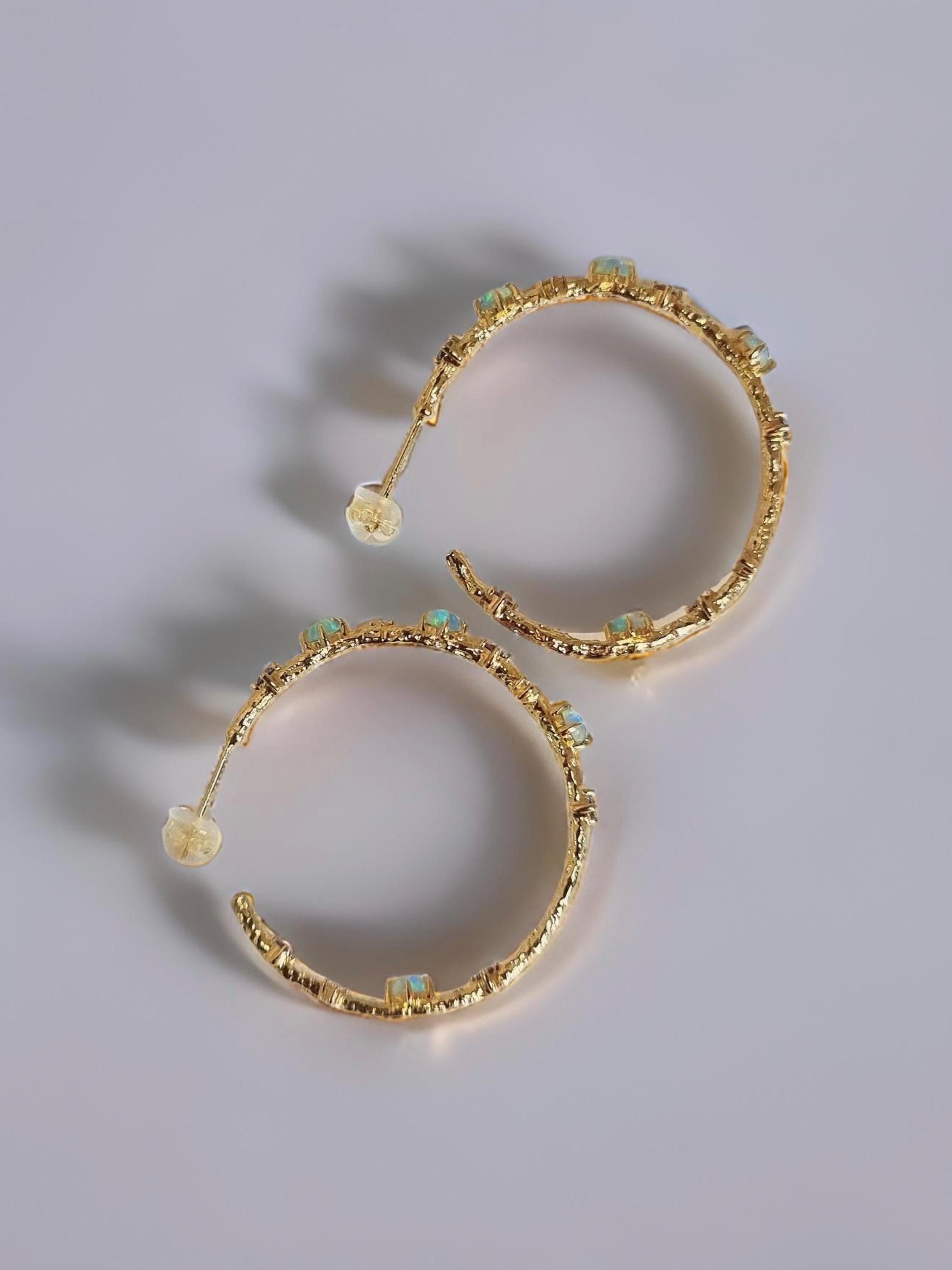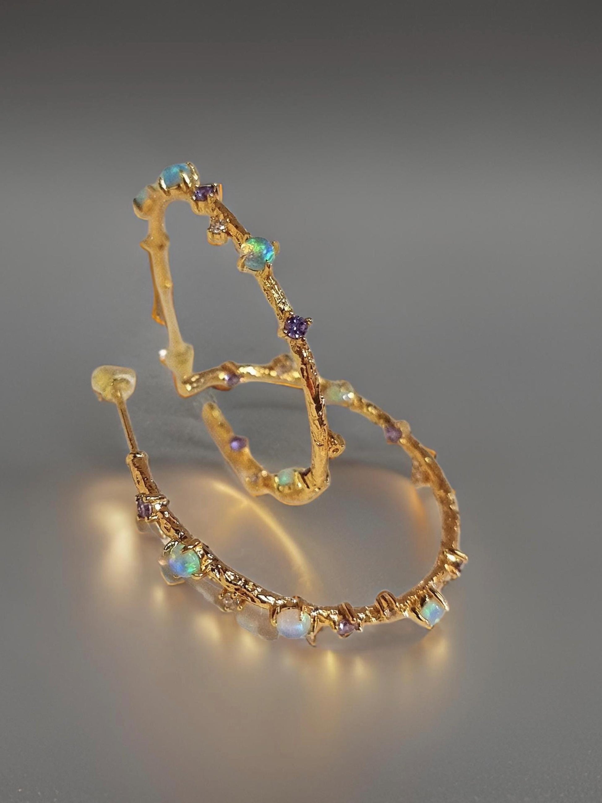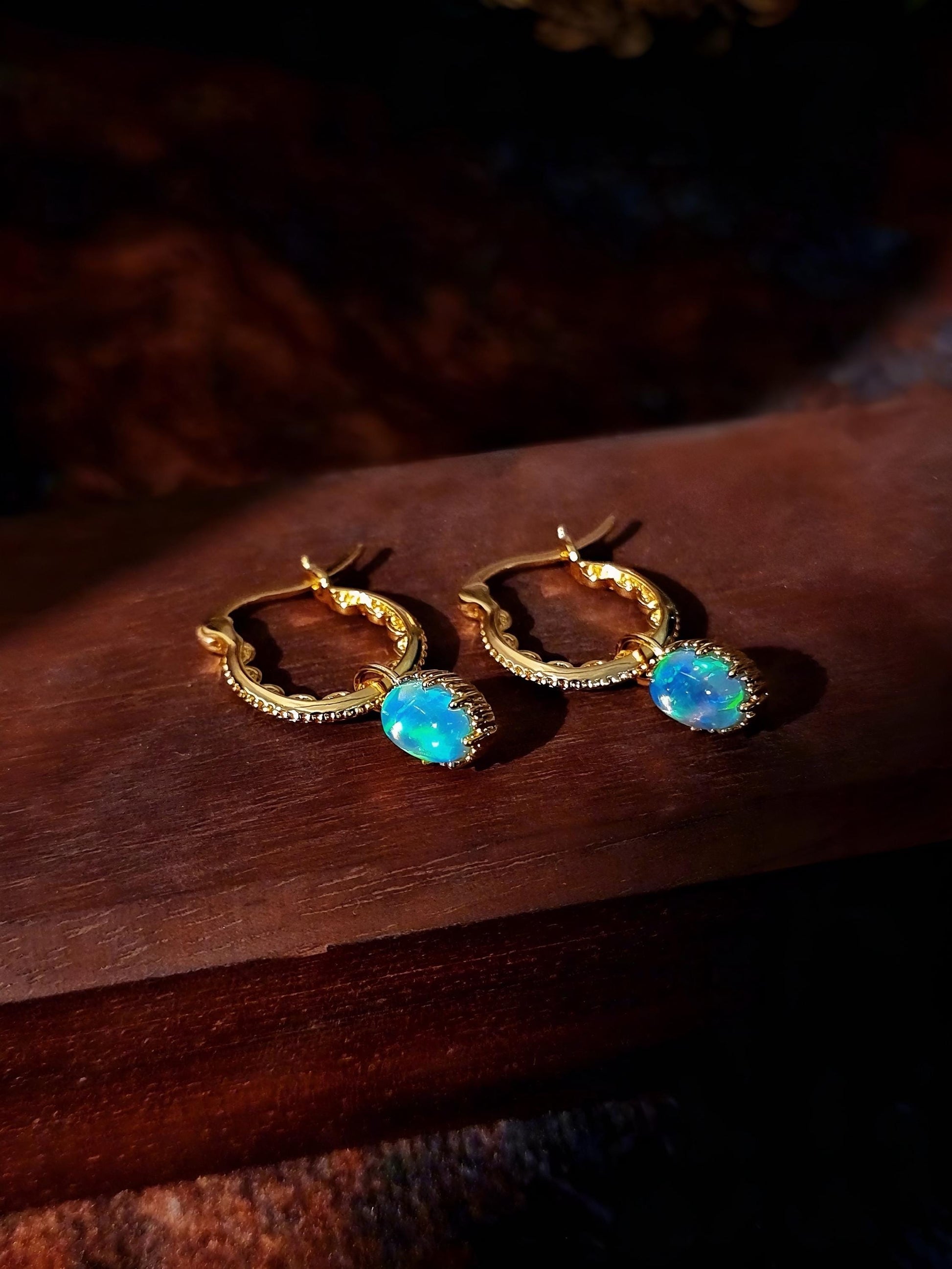 These elegant hoop earrings feature a French-inspired effortless design, combining Japanese opal with sapphires. Crafted with precision and attention to detail, the earrings showcase a luxurious and sophisticated aesthetic, perfect for those who appreciate jewelry with a touch of old-world charm. unique, small-batch piece that exudes timeless elegance.