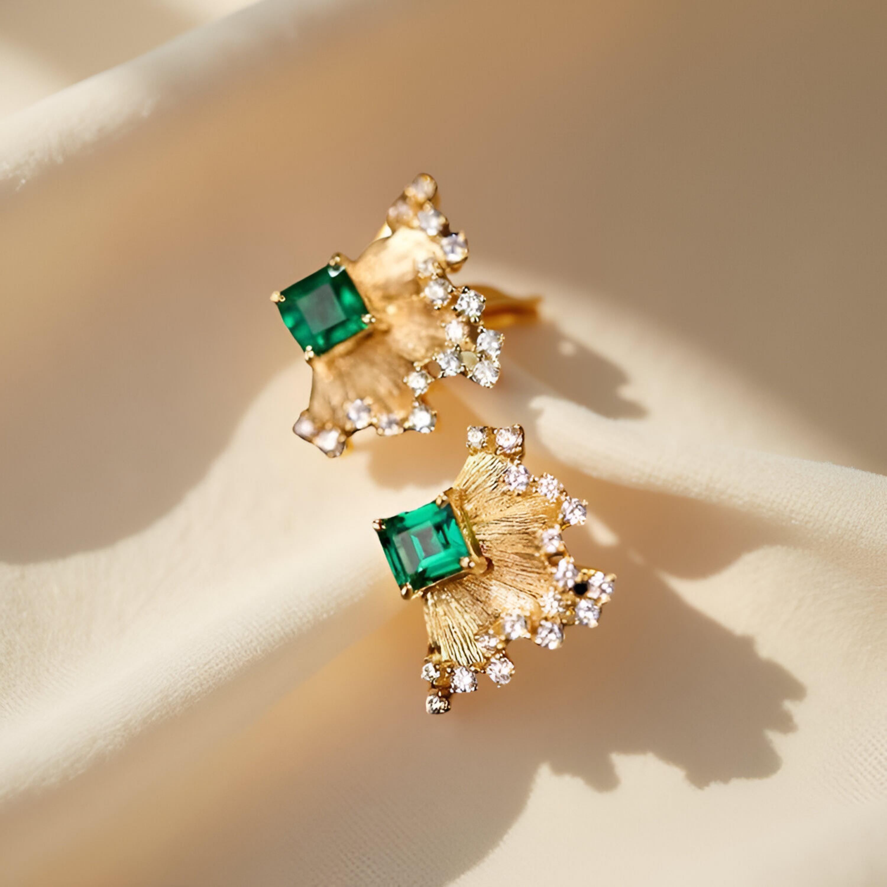 French-Inspired Small-Batch Artisanal Earrings with Round diamonds and Green Emerald